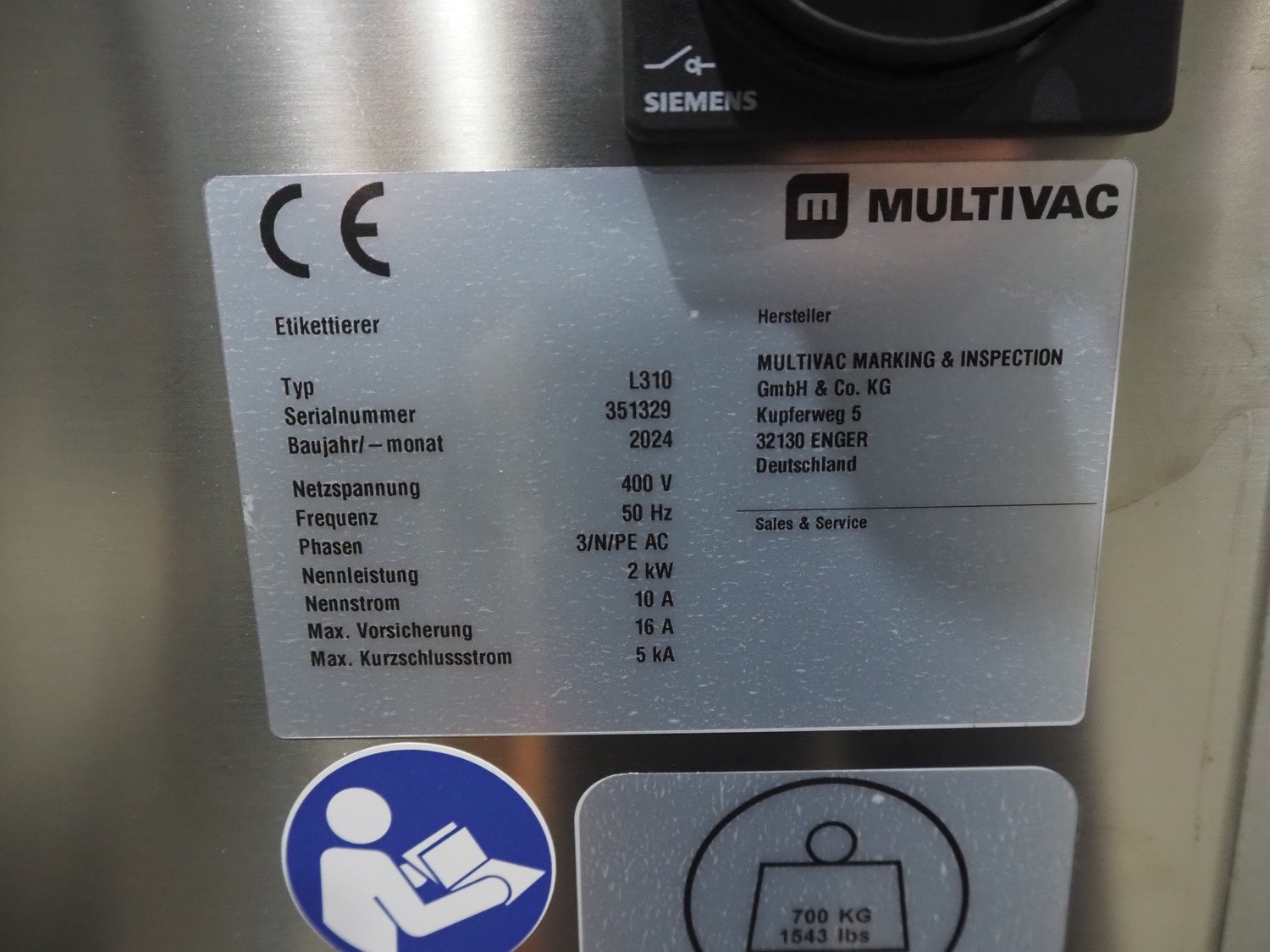 Multivac labelling machine, type: L310, serial number: 351329, year of construction: 2024, 400 V, 3 Ph, 50 Hz, 10 A, 2 kW, plastic belt, belt width: 90 mm, label width: 270 mm, total dimensions: 3850 mm x 1260 mm x 2000 mm. Kavel locatie: Langereijt 29A, 5091 JP Middelbeers, Nederland