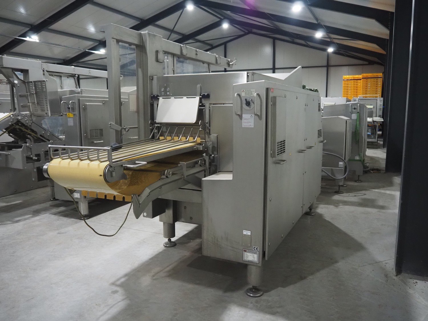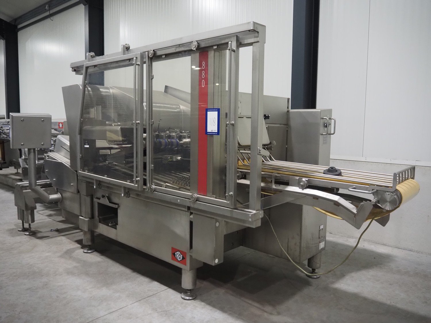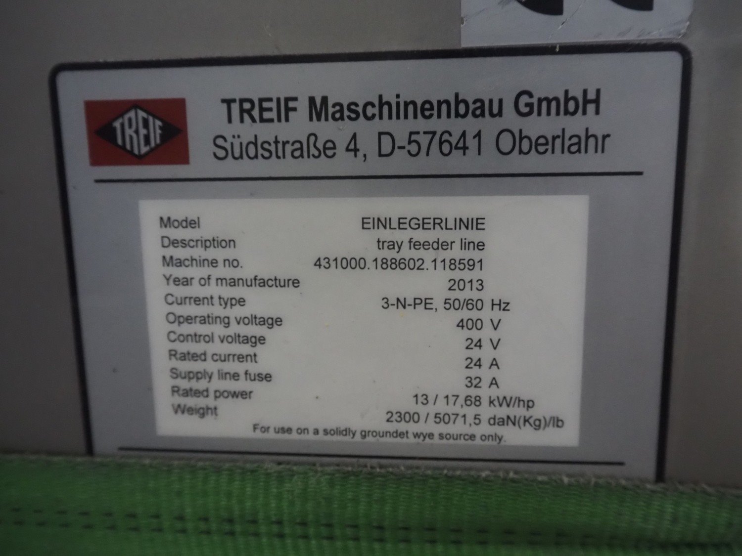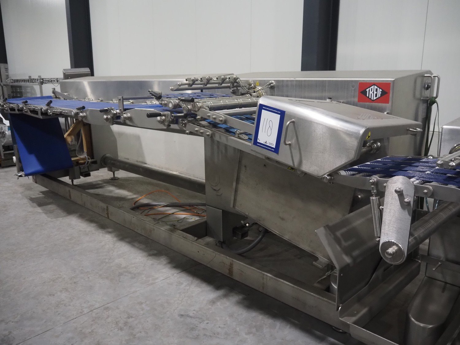 Treif Maschinenbau GmbH slicer line, consisting of: Slicer, model: Divider 880, machine number: 541002.171338.113678, year of construction: 2012, 400-480 V, 3 Ph, 50 Hz, 19.5 A, weight: 1950 kg, 6 lanes, plastic infeed belt, belt width: 450 mm, dimensions: 6250 mm x 1970 mm x 2700 mm; Tray feeder line, model: Einlegerlinie, machine number: 431000.188602.118591, year of construction: 2013, 400 V, 3 Ph, 50/60 Hz, 24 A, 13 kW, weight: 2300 kg, plastic belt, belt width: 505 mm, dimensions: 5700 mm x 1650 mm x 1880 mm, total dimensions: 10800 mm x 1870 mm x 2700 mm. Technical condition unknown. Kavel locatie: Langereijt 29A, 5091 JP Middelbeers, Nederland