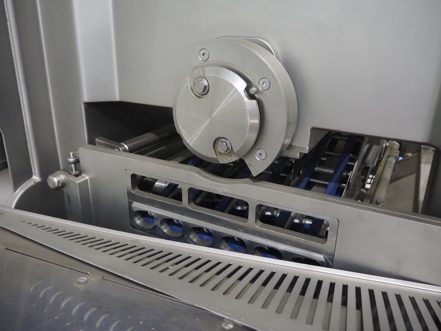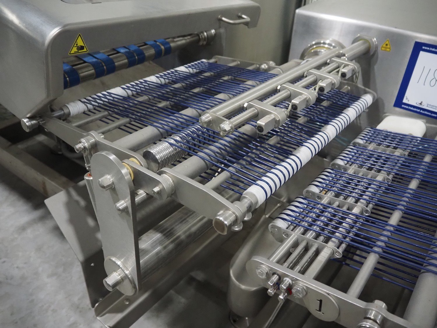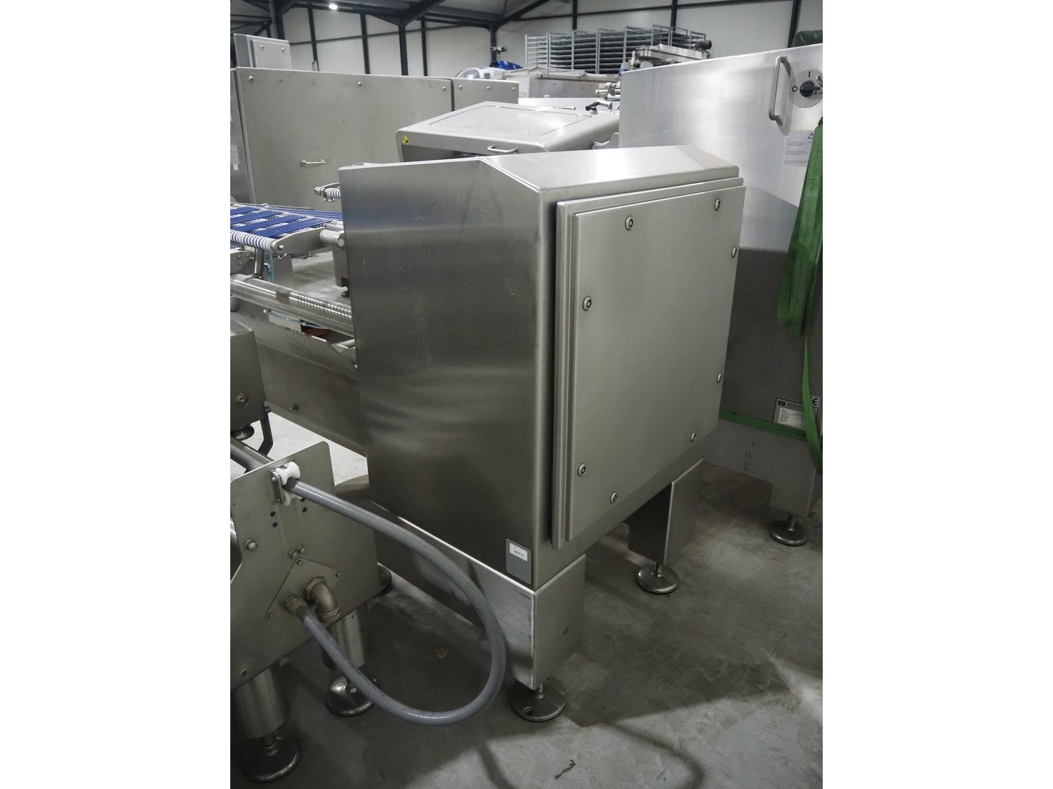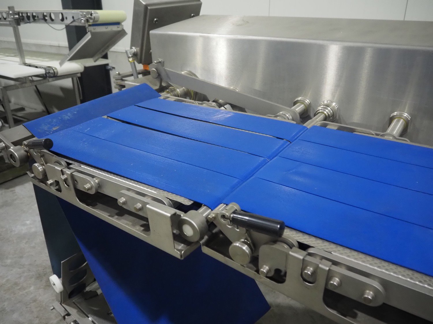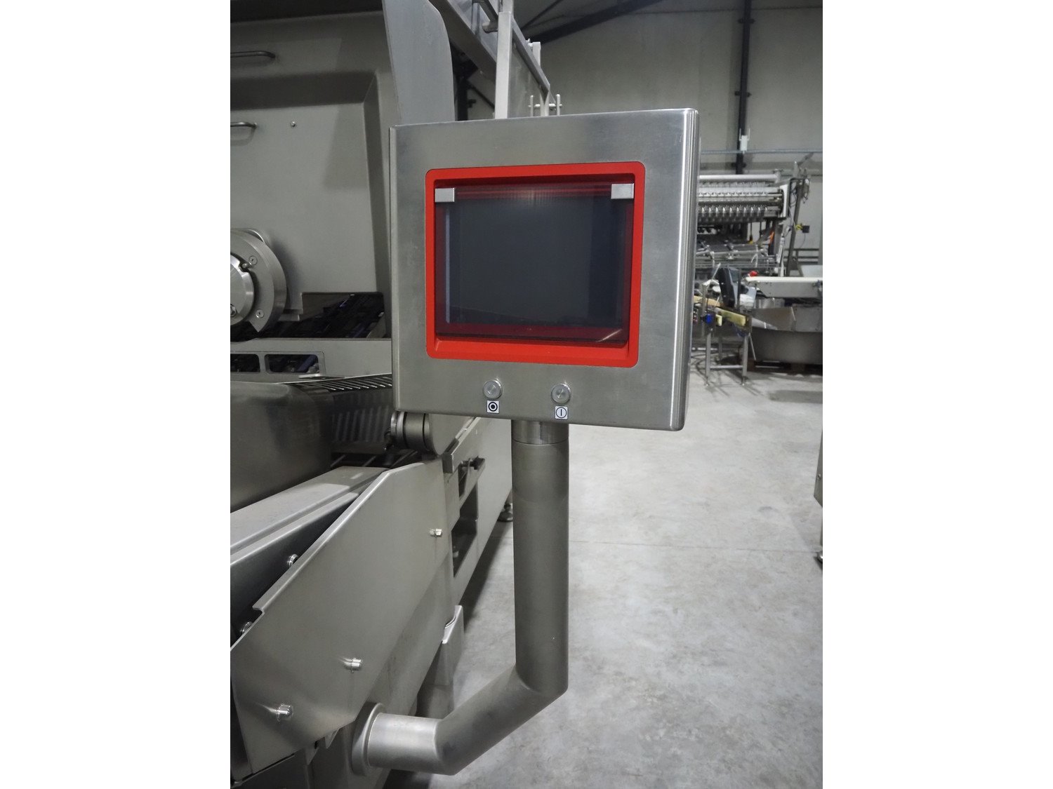 Treif Maschinenbau GmbH slicer line, consisting of: Slicer, model: Divider 880, machine number: 541002.171338.113678, year of construction: 2012, 400-480 V, 3 Ph, 50 Hz, 19.5 A, weight: 1950 kg, 6 lanes, plastic infeed belt, belt width: 450 mm, dimensions: 6250 mm x 1970 mm x 2700 mm; Tray feeder line, model: Einlegerlinie, machine number: 431000.188602.118591, year of construction: 2013, 400 V, 3 Ph, 50/60 Hz, 24 A, 13 kW, weight: 2300 kg, plastic belt, belt width: 505 mm, dimensions: 5700 mm x 1650 mm x 1880 mm, total dimensions: 10800 mm x 1870 mm x 2700 mm. Technical condition unknown. Kavel locatie: Langereijt 29A, 5091 JP Middelbeers, Nederland