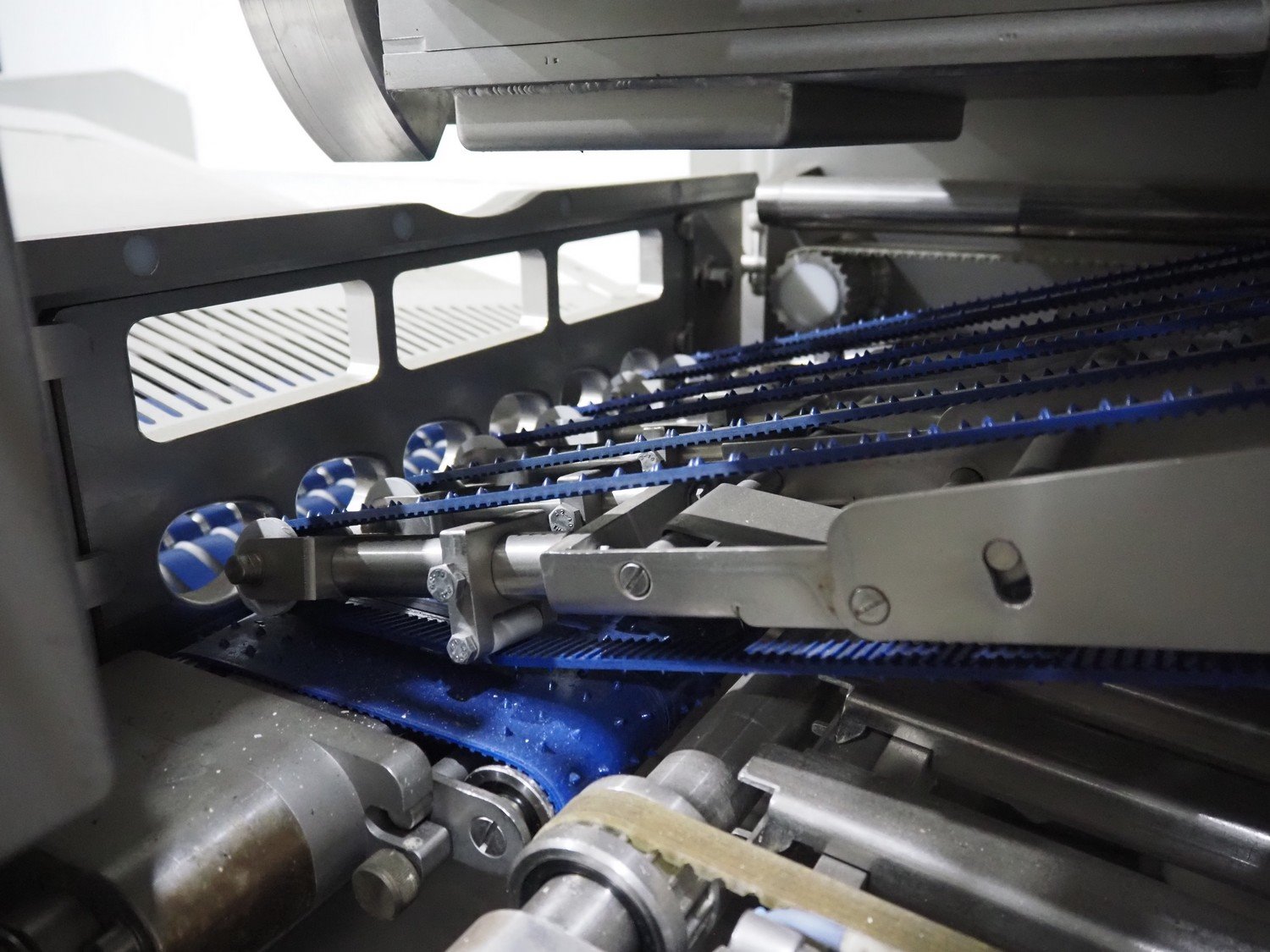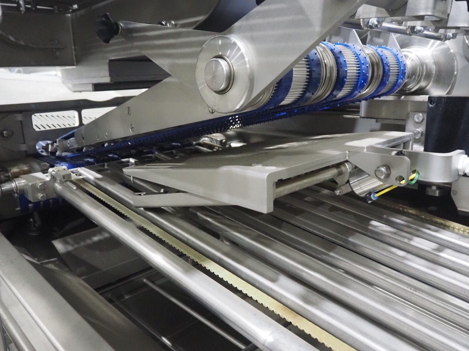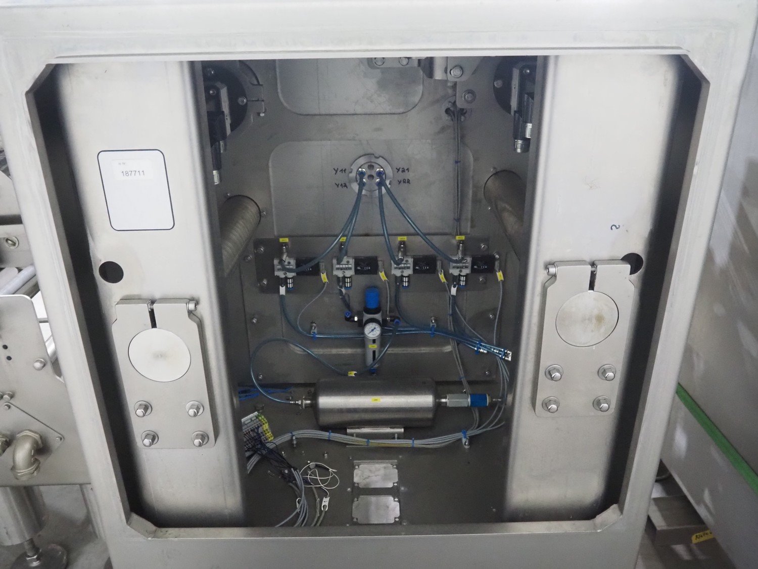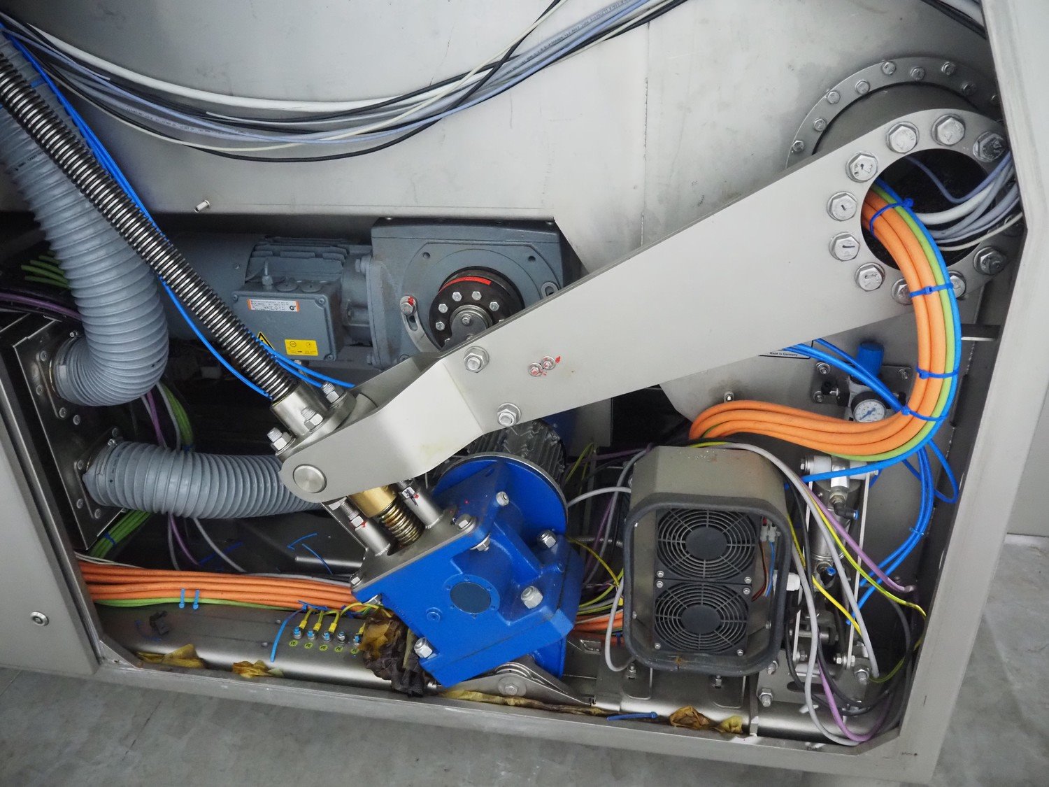 Treif Maschinenbau GmbH slicer line, consisting of: Slicer, model: Divider 880, machine number: 541002.171338.113678, year of construction: 2012, 400-480 V, 3 Ph, 50 Hz, 19.5 A, weight: 1950 kg, 6 lanes, plastic infeed belt, belt width: 450 mm, dimensions: 6250 mm x 1970 mm x 2700 mm; Tray feeder line, model: Einlegerlinie, machine number: 431000.188602.118591, year of construction: 2013, 400 V, 3 Ph, 50/60 Hz, 24 A, 13 kW, weight: 2300 kg, plastic belt, belt width: 505 mm, dimensions: 5700 mm x 1650 mm x 1880 mm, total dimensions: 10800 mm x 1870 mm x 2700 mm. Technical condition unknown. Kavel locatie: Langereijt 29A, 5091 JP Middelbeers, Nederland