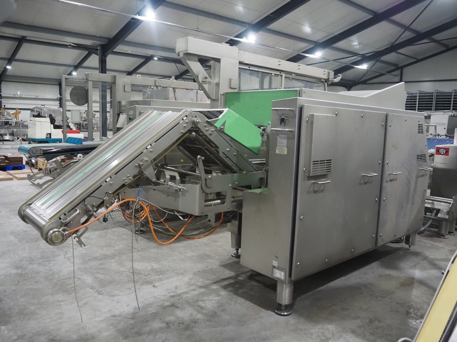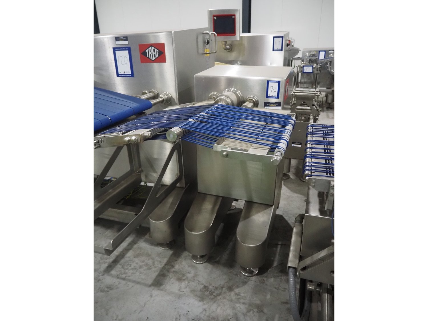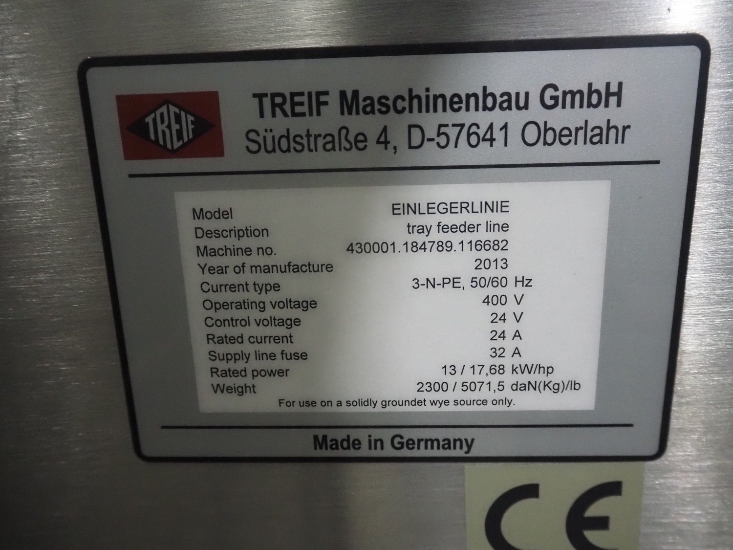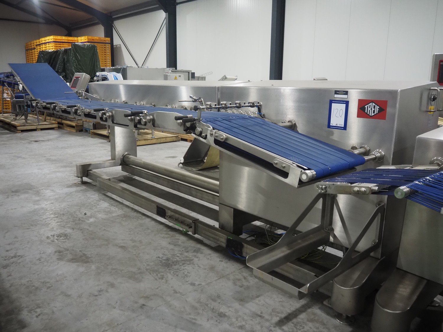 Treif Maschinenbau GmbH slicer line, consisting of: Slicer, model: Divider 880, machine number: 541304.184670.118165, year of construction: 2013, 400 V, 3 Ph, 50/60 Hz, 19 A, 2 lanes, plastic wire belt, belt width: 480 mm, dimensions: 5450 mm x 1950 mm x 2300 mm. Tray feeder line, model: Einlegerlinie, machine number: 430001.184789.116682, year of construction: 2013, 400 V, 3 Ph, 50/60 Hz, 24 A, 13 kW, weight: 2300 kg, plastic belt, belt width: 540 mm, dimensions tray feeder line: 5500 mm x 1760 mm x 1660 mm. Technical condition unknown. Kavel locatie: Langereijt 29A, 5091 JP Middelbeers, Nederland