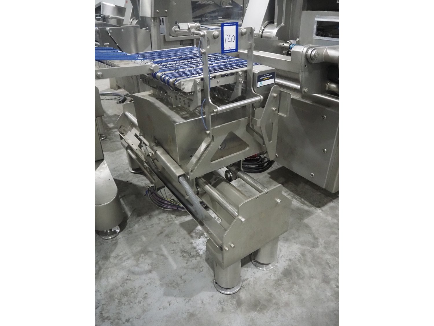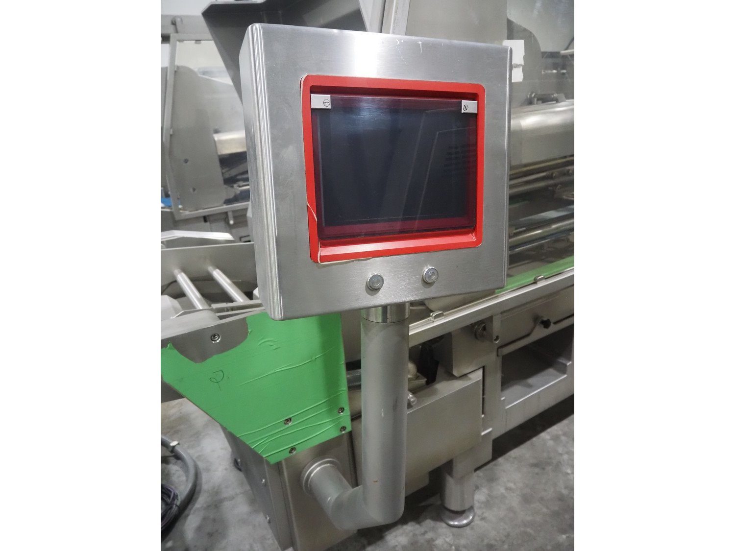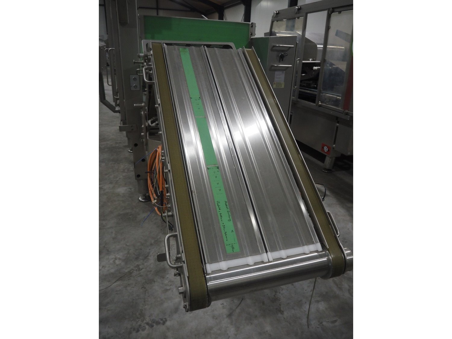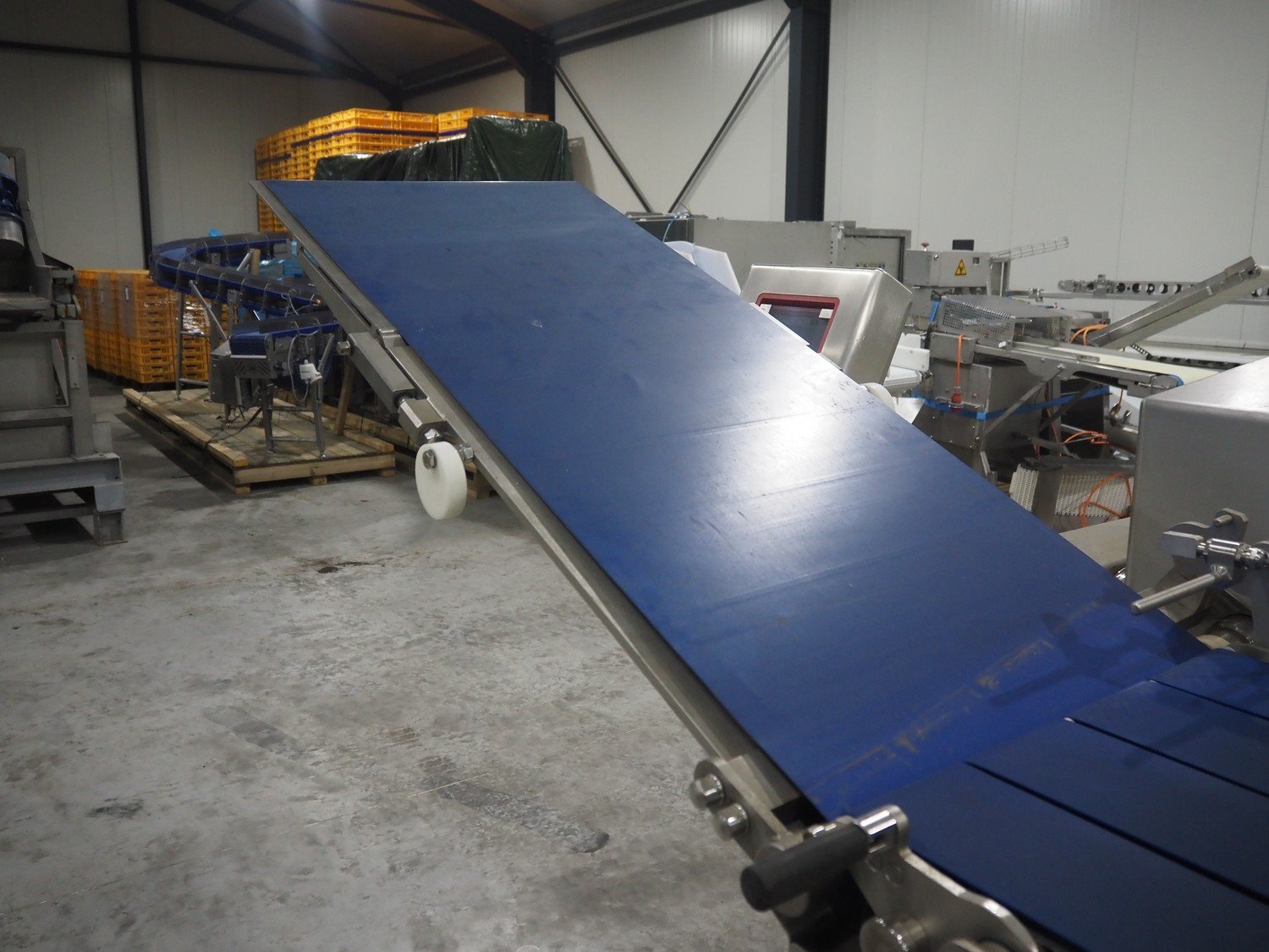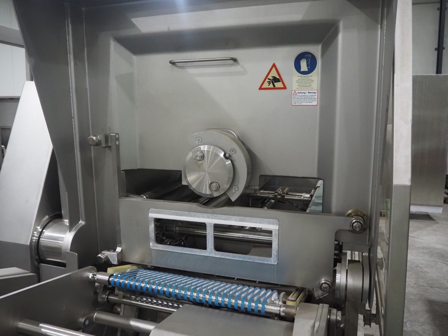 Treif Maschinenbau GmbH slicer line, consisting of: Slicer, model: Divider 880, machine number: 541304.184670.118165, year of construction: 2013, 400 V, 3 Ph, 50/60 Hz, 19 A, 2 lanes, plastic wire belt, belt width: 480 mm, dimensions: 5450 mm x 1950 mm x 2300 mm. Tray feeder line, model: Einlegerlinie, machine number: 430001.184789.116682, year of construction: 2013, 400 V, 3 Ph, 50/60 Hz, 24 A, 13 kW, weight: 2300 kg, plastic belt, belt width: 540 mm, dimensions tray feeder line: 5500 mm x 1760 mm x 1660 mm. Technical condition unknown. Kavel locatie: Langereijt 29A, 5091 JP Middelbeers, Nederland