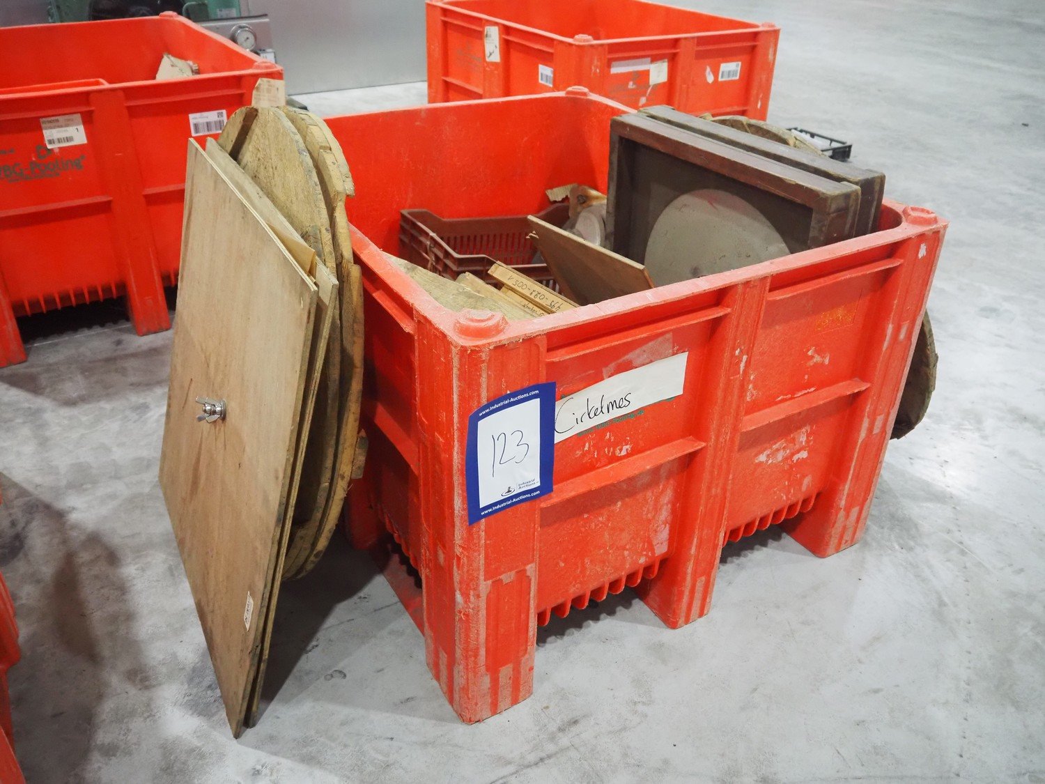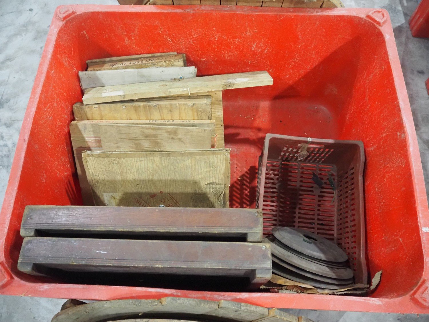 Plastic pallet box with various knifes for slicers. Kavel locatie: Langereijt 29A, 5091 JP Middelbeers, Nederland