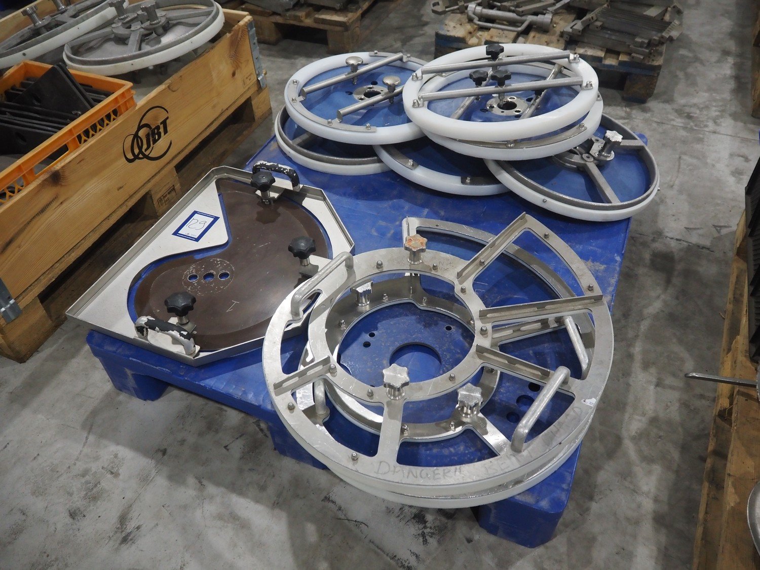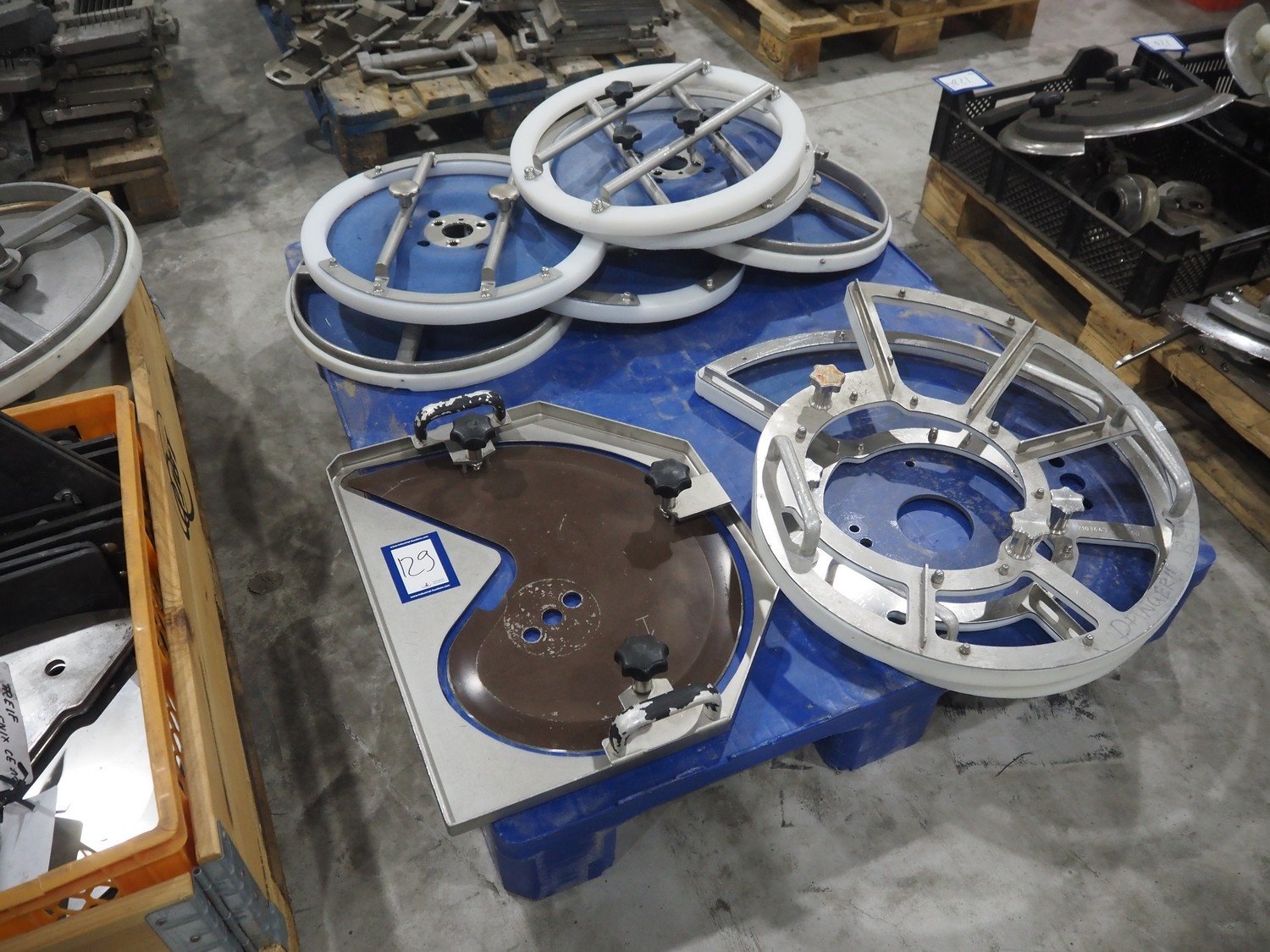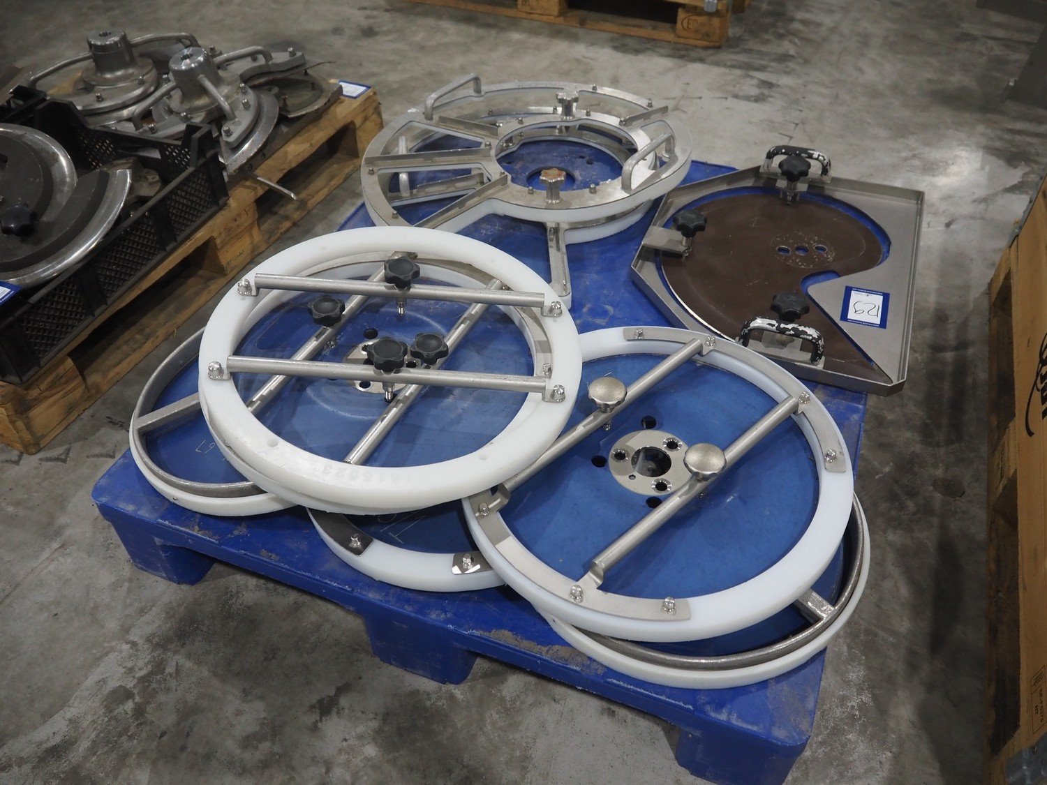 Pallet with knifes for Weber slicer. Kavel locatie: Langereijt 29A, 5091 JP Middelbeers, Nederland