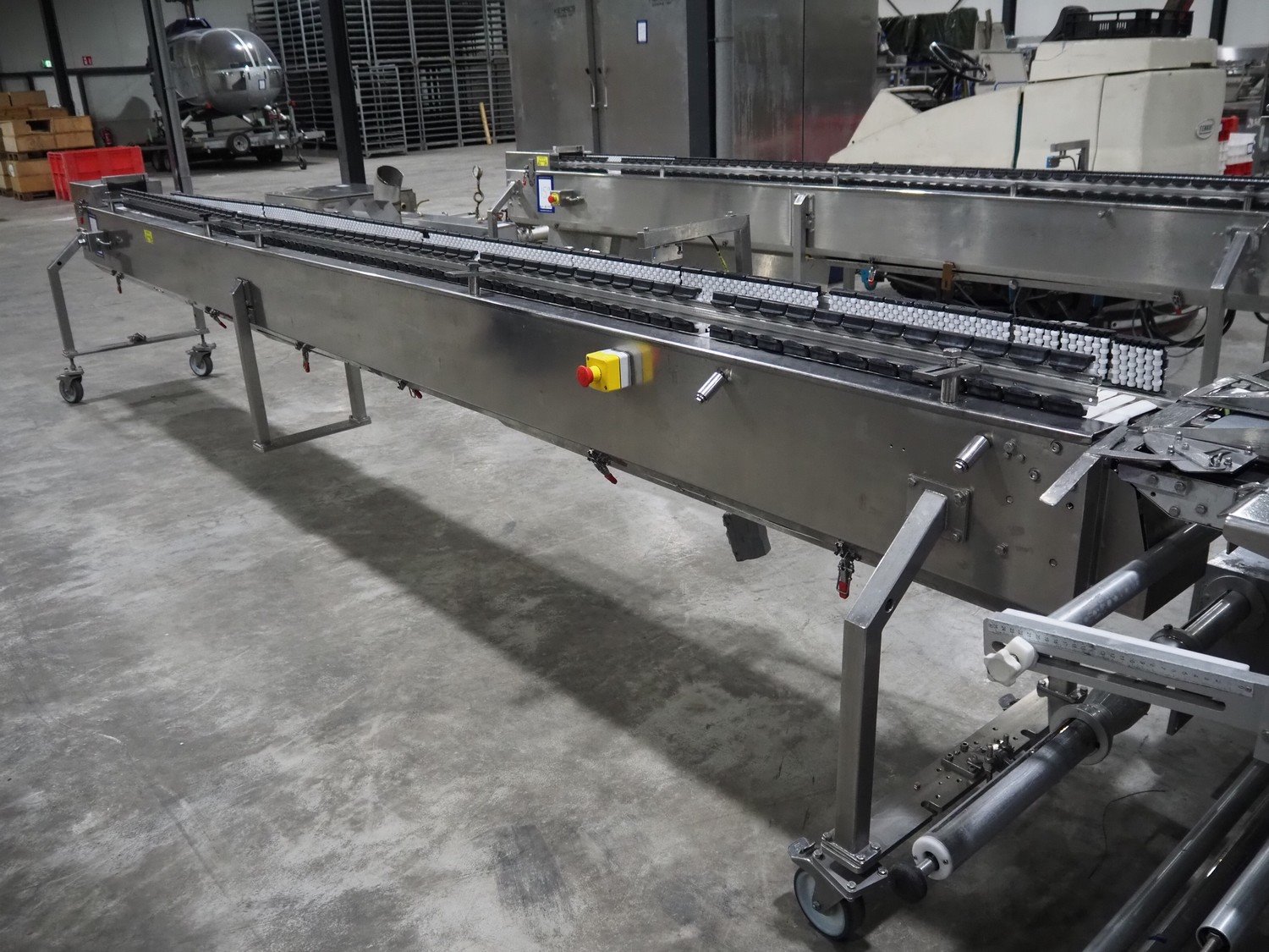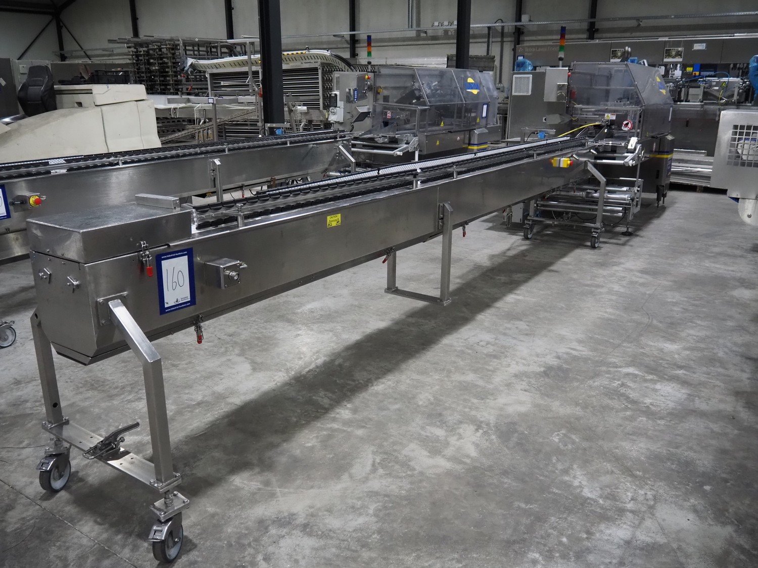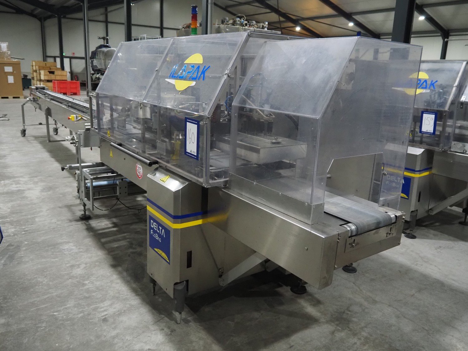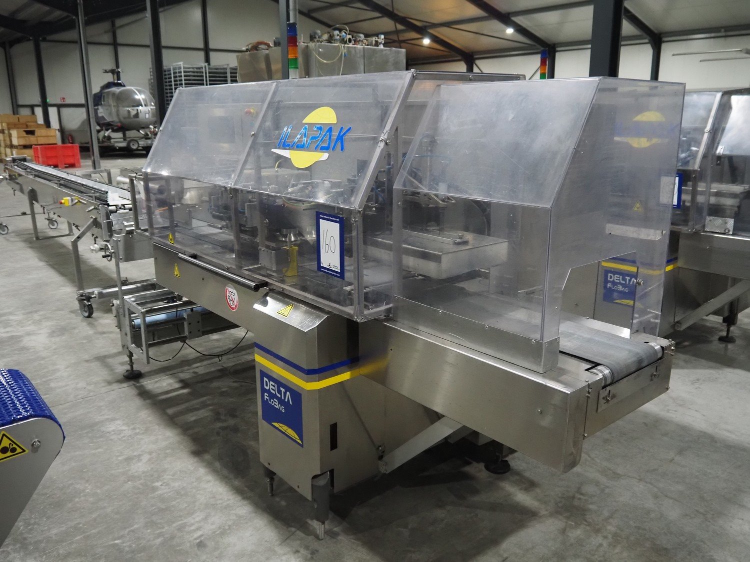 Ilapak flowpacker, plastic belt, belt width: 280 mm, seal length: 360 mm, total dimensions: 3500 mm x 1500 mm x 1900 mm, mobile infeed belt, plastic belt, belt width: 160 mm, distance between dividers: 205 mm, divider height: 50 mm, total dimensions: 405 mm x 700 mm x 1050 mm. Including 2 crates with parts. Kavel locatie: Langereijt 29A, 5091 JP Middelbeers, Nederland
