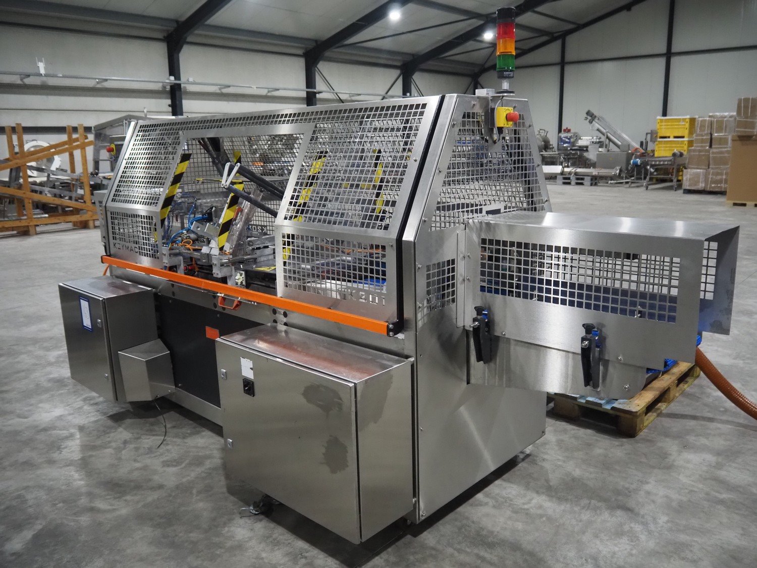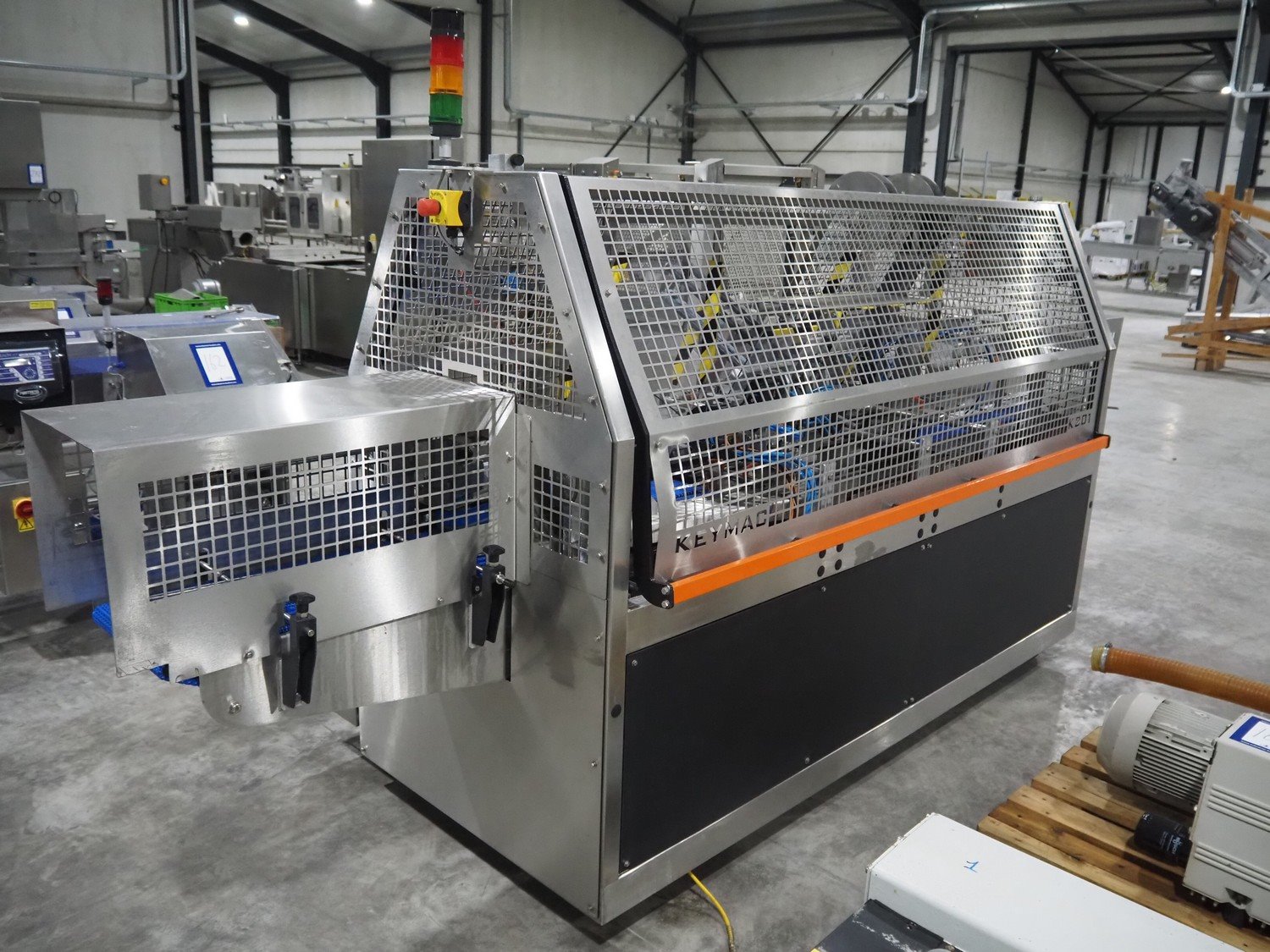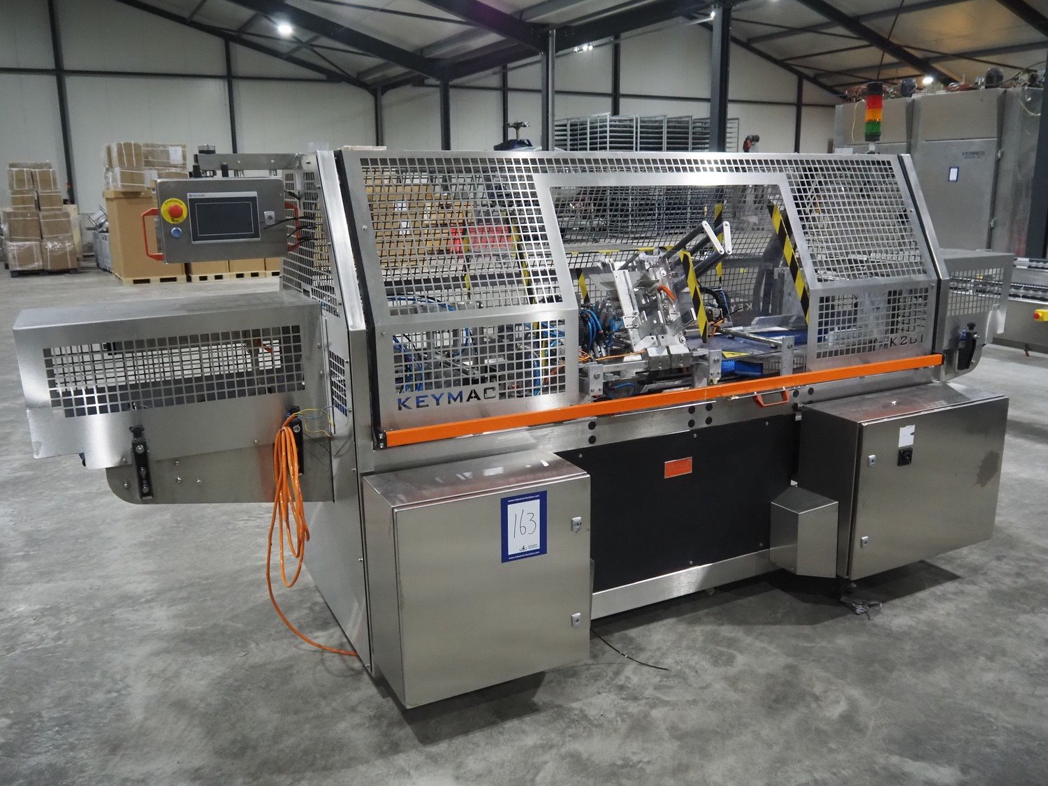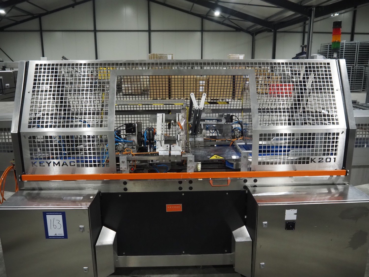 Keymac Packaging Systems case packer, model: K 201, serial number: 74971218G, 230 V, 50 Hz, 1 Ph, dual lane, 120 packs per min, plastic mesh belt, belt width: (3x) 150 mm, total dimensions: 4250 mm x 1350 mm x 2000 mm. Kavel locatie: Langereijt 29A, 5091 JP Middelbeers, Nederland
