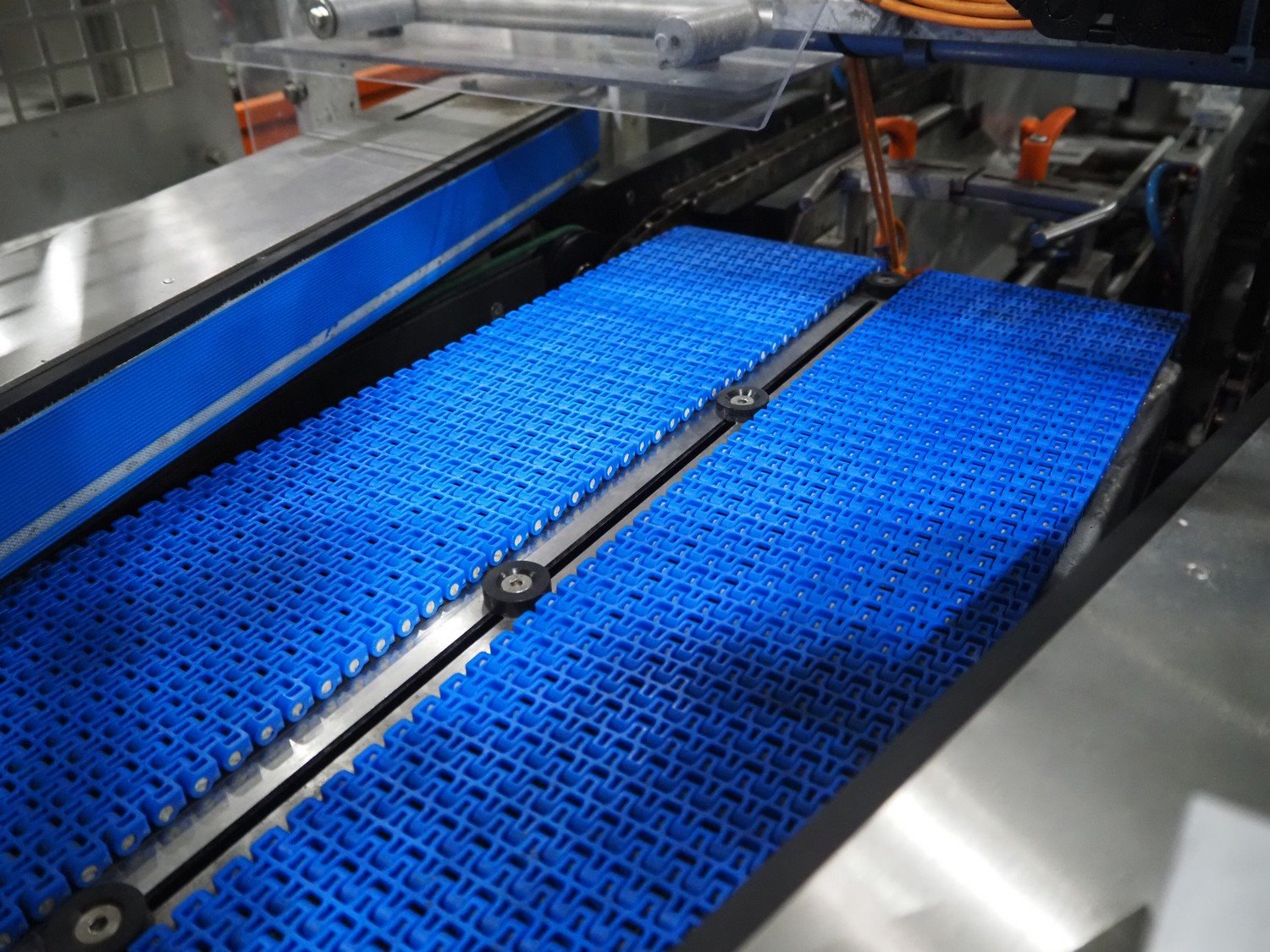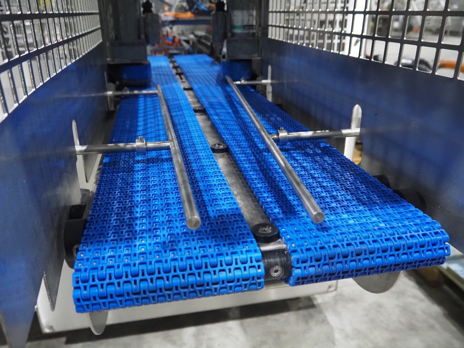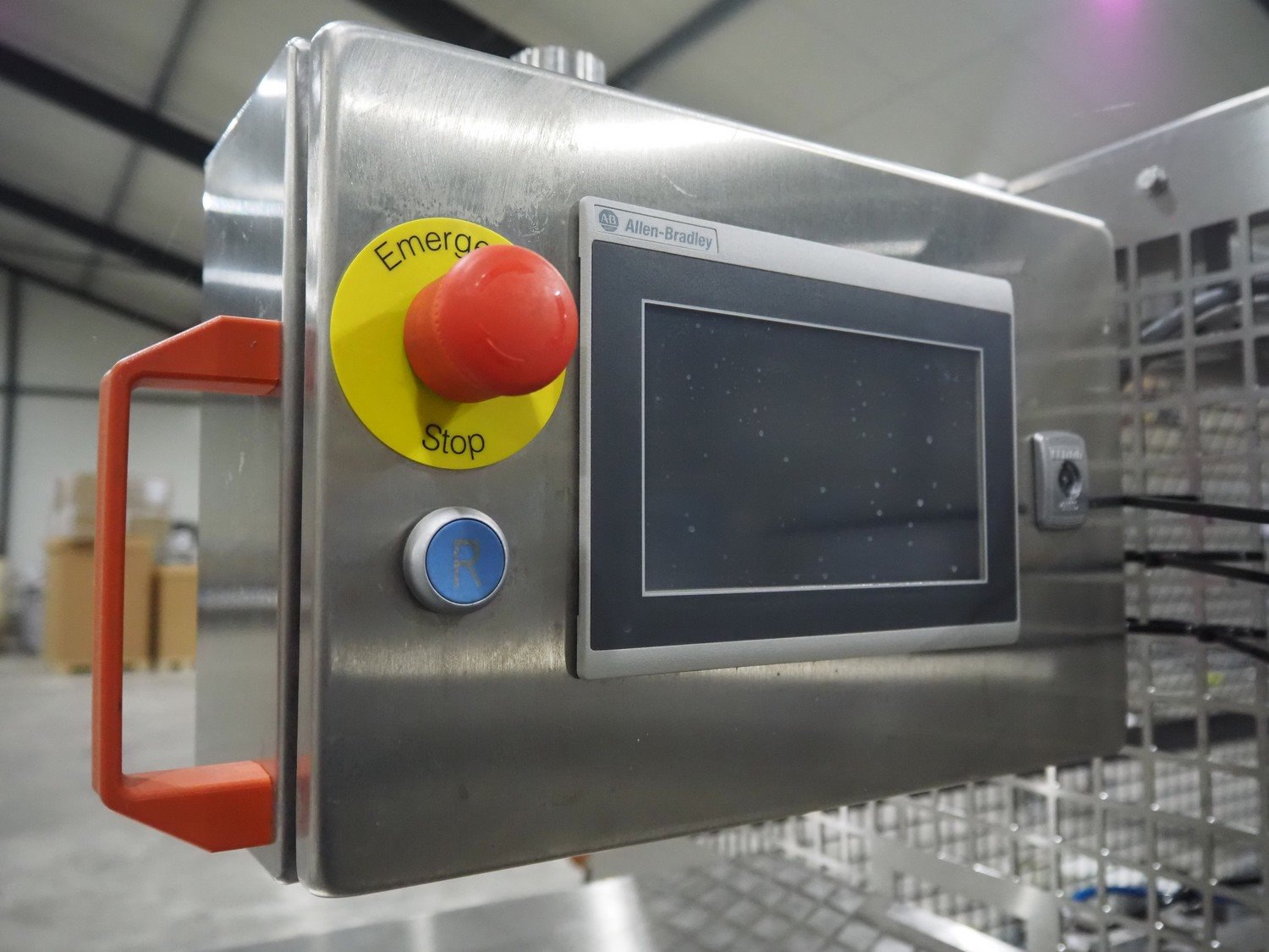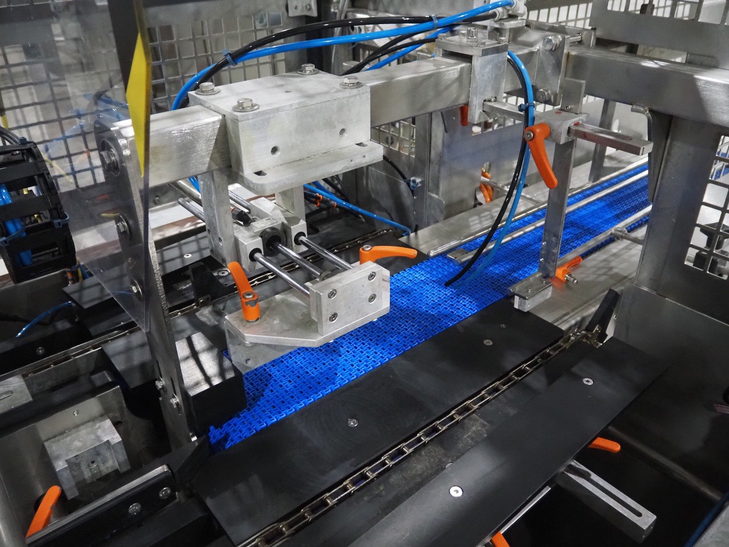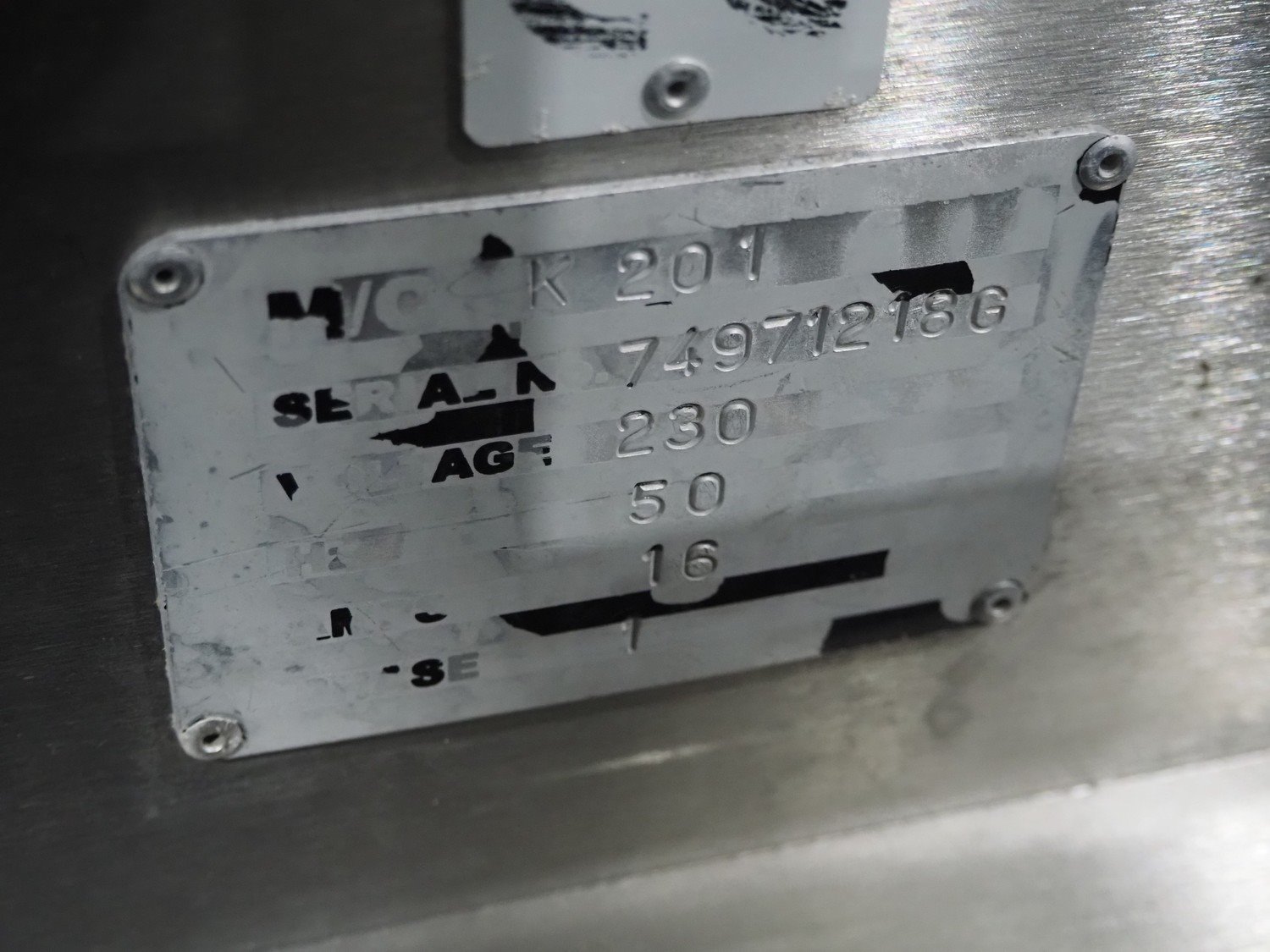 Keymac Packaging Systems case packer, model: K 201, serial number: 74971218G, 230 V, 50 Hz, 1 Ph, dual lane, 120 packs per min, plastic mesh belt, belt width: (3x) 150 mm, total dimensions: 4250 mm x 1350 mm x 2000 mm. Kavel locatie: Langereijt 29A, 5091 JP Middelbeers, Nederland