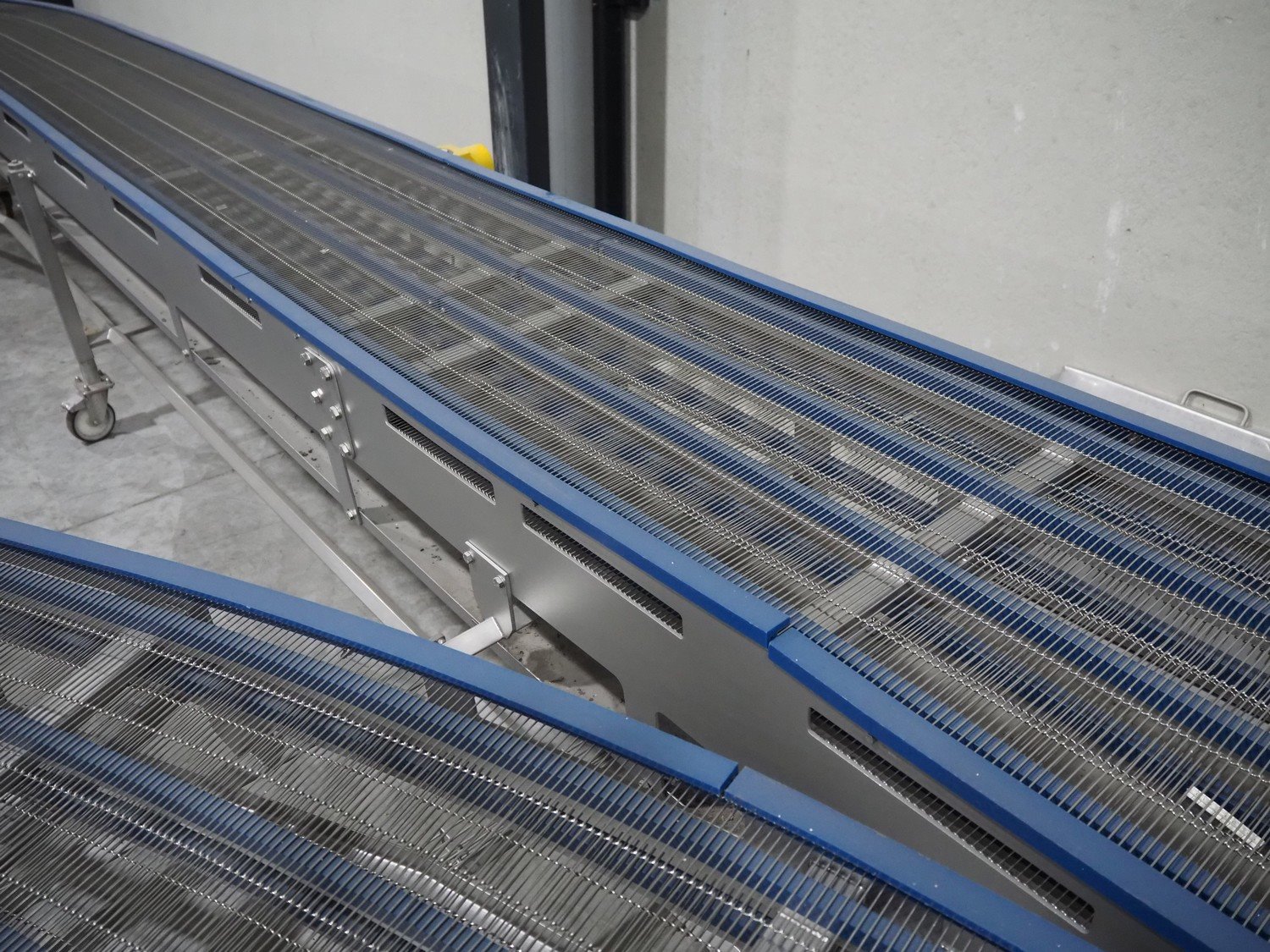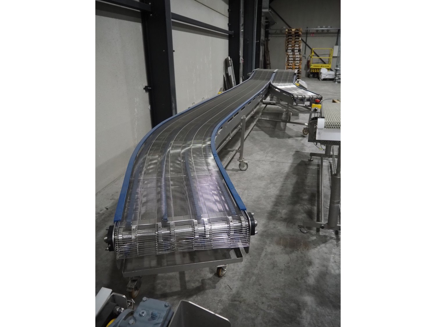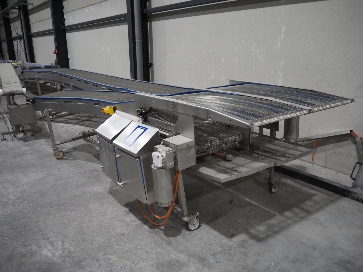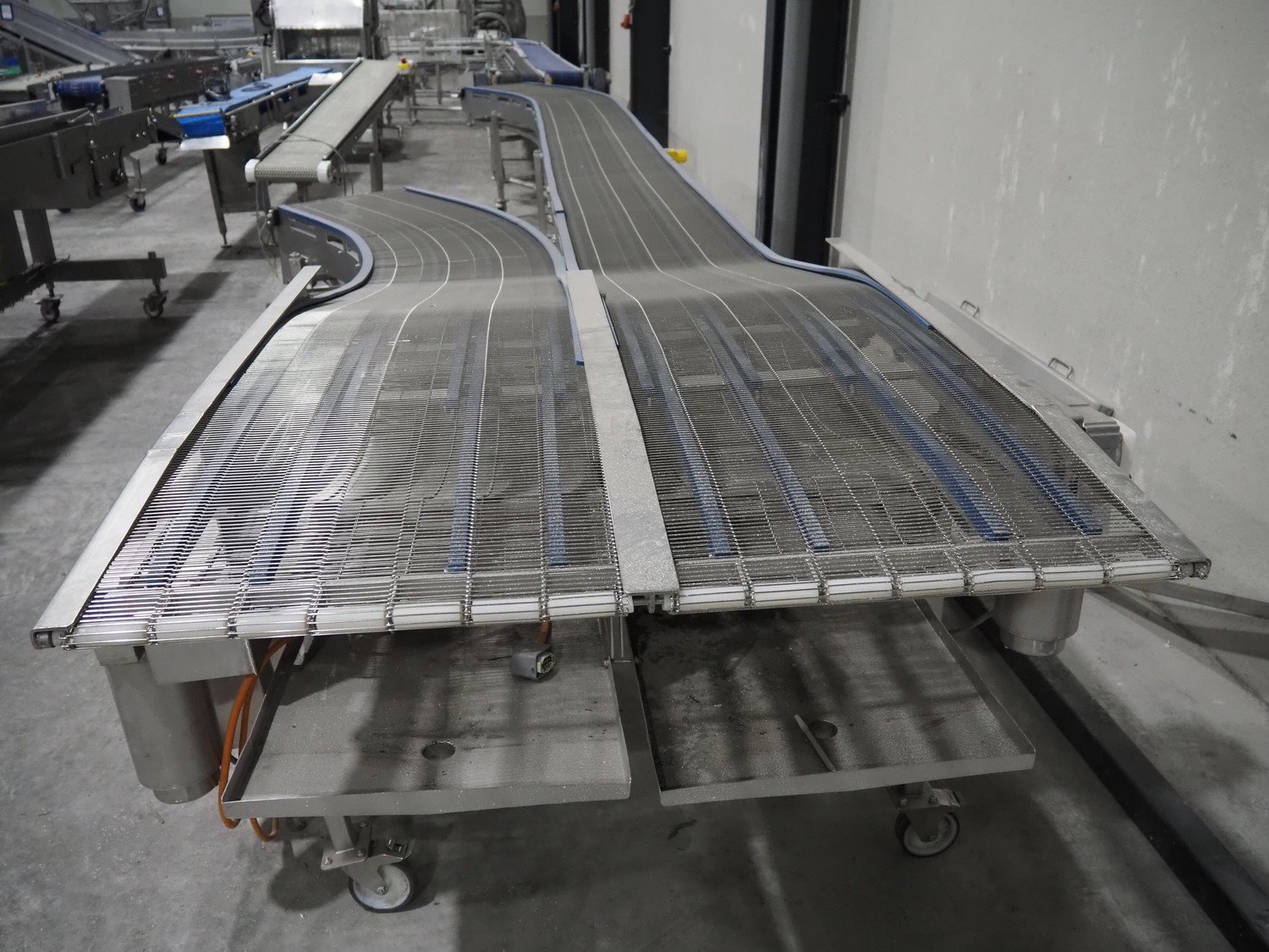 Mobile transport belt, 2 lanes, s/s mesh belts, belt width: 510 mm, total dimensions: 8100 mm x 1900 mm x 1100 mm. Kavel locatie: Langereijt 29A, 5091 JP Middelbeers, Nederland