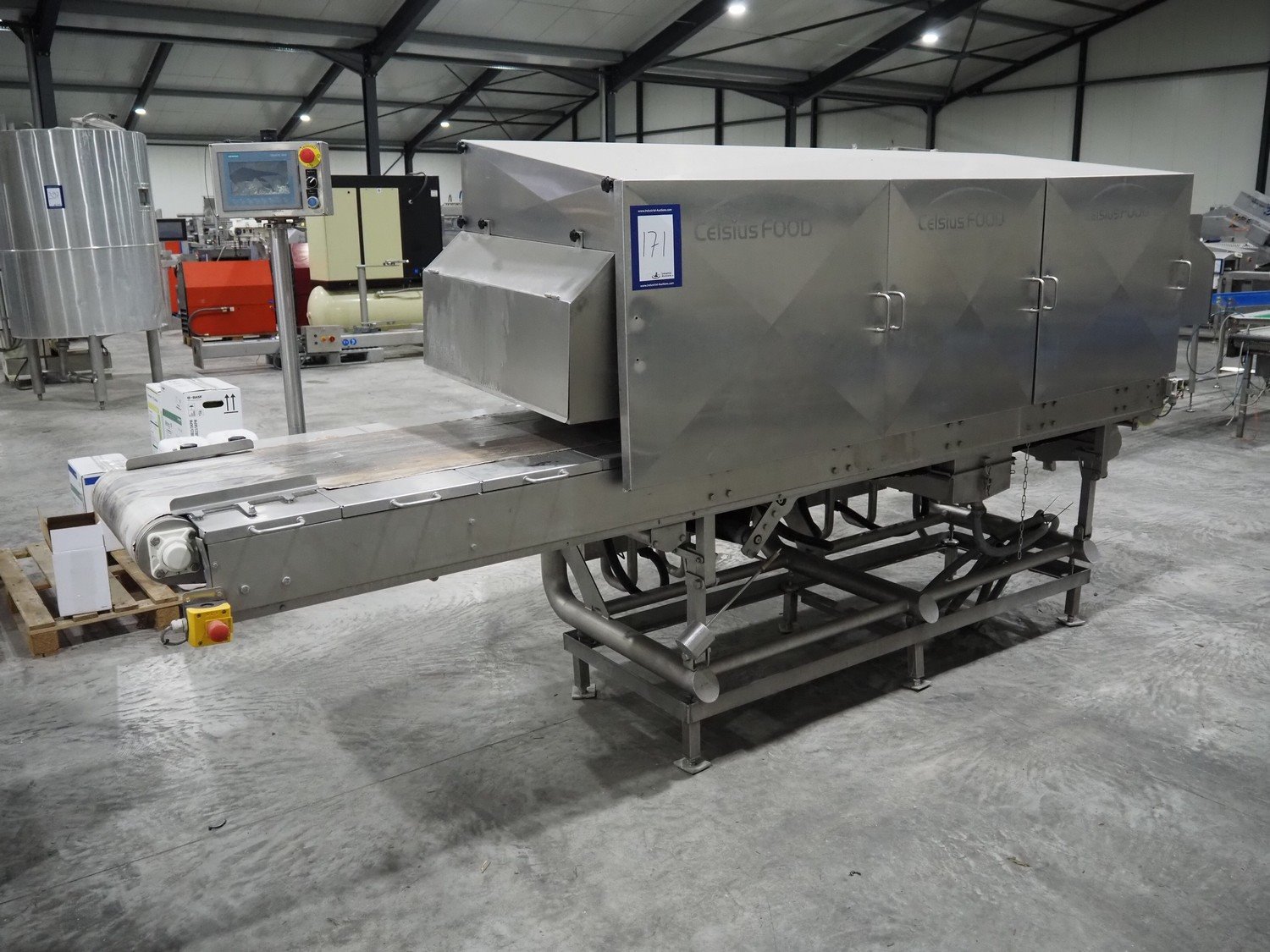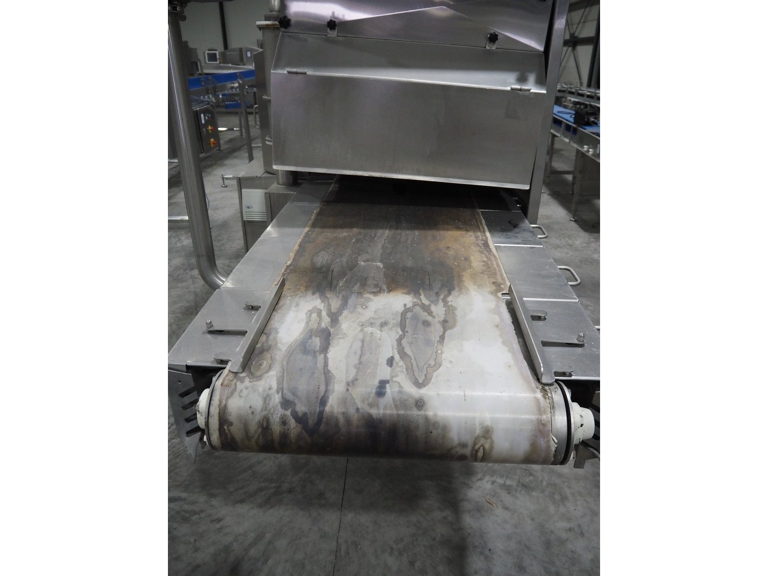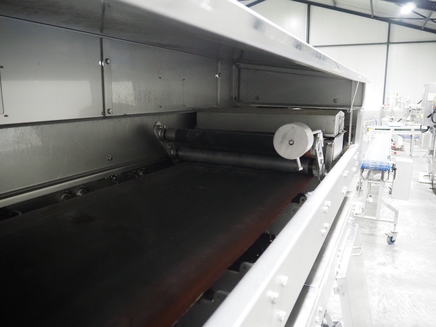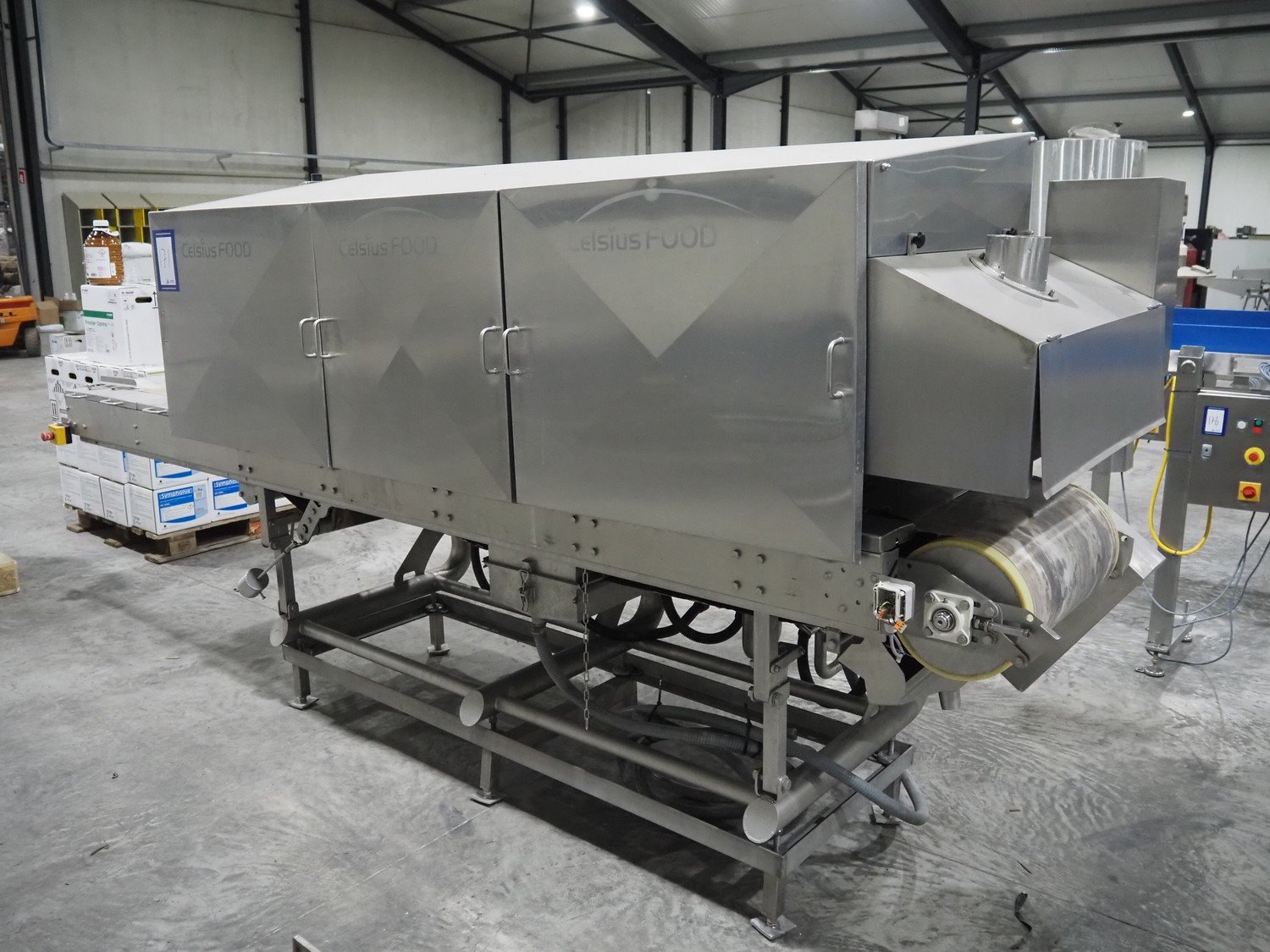 Celsiusfood teflon grill belt, belt width: (1x) 545 mm, (1x) 560 mm, clearance: 545 mm x 115 mm, electric heated, total dimensions: 4000 mm x 1350 mm x 1860 mm. Display broken. Kavel locatie: Langereijt 29A, 5091 JP Middelbeers, Nederland