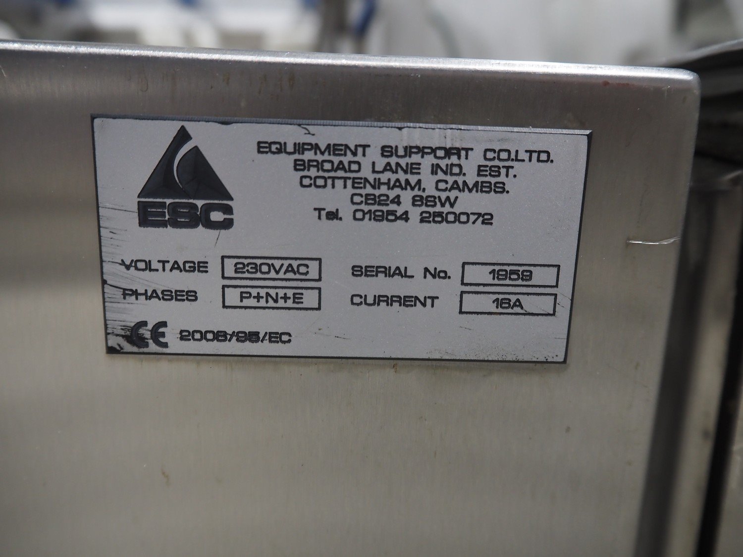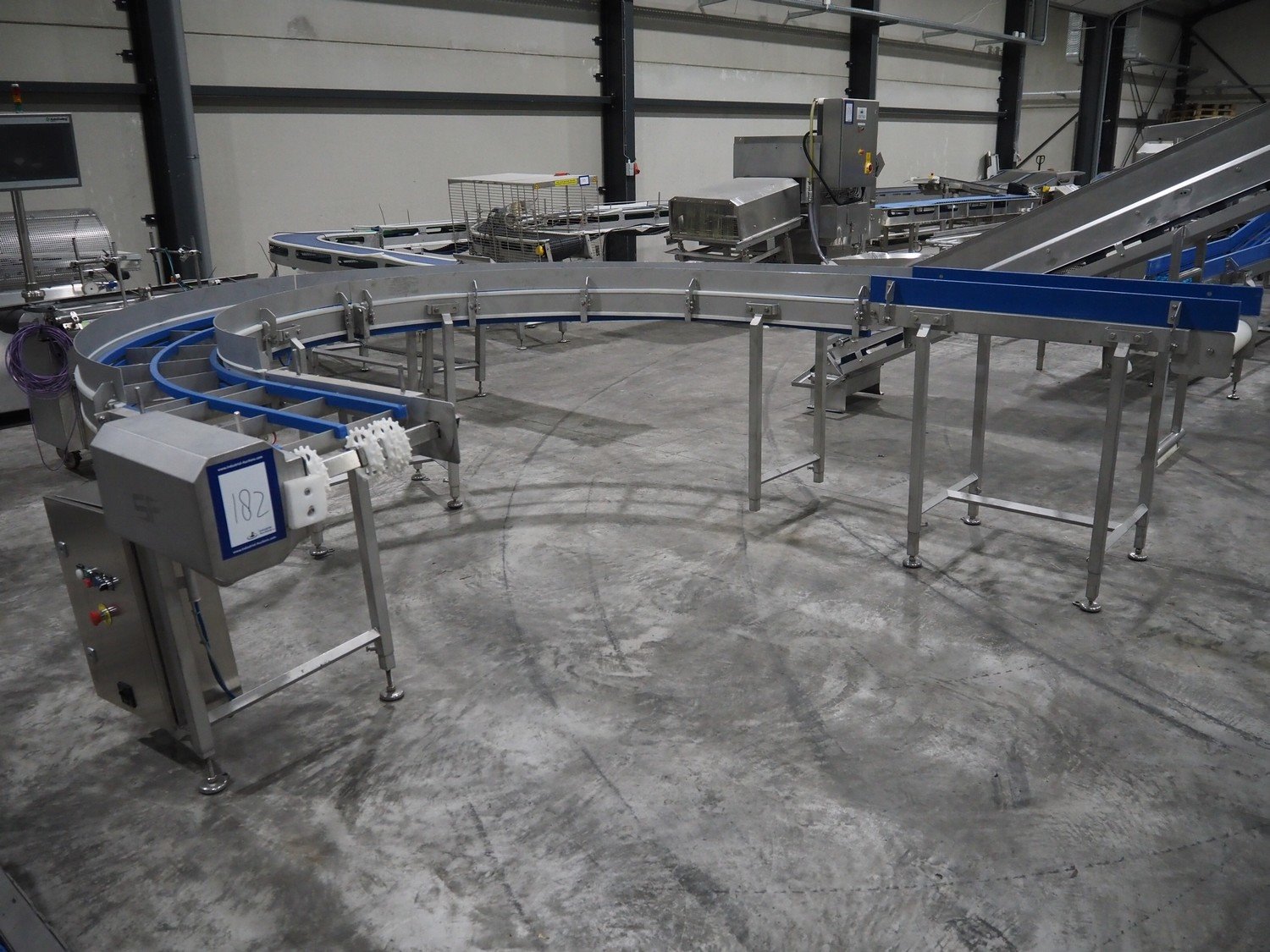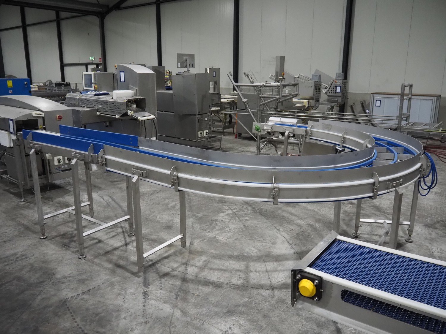 SF Engineering Food Processing Solutions 180⁰ curve conveyor, serial number: SF777115 955, year of construction: 09/2015, approximately belt width: 380 mm, total dimensions: 3400 mm x 3350 mm x 1100 mm. Missing belt. Kavel locatie: Langereijt 29A, 5091 JP Middelbeers, Nederland