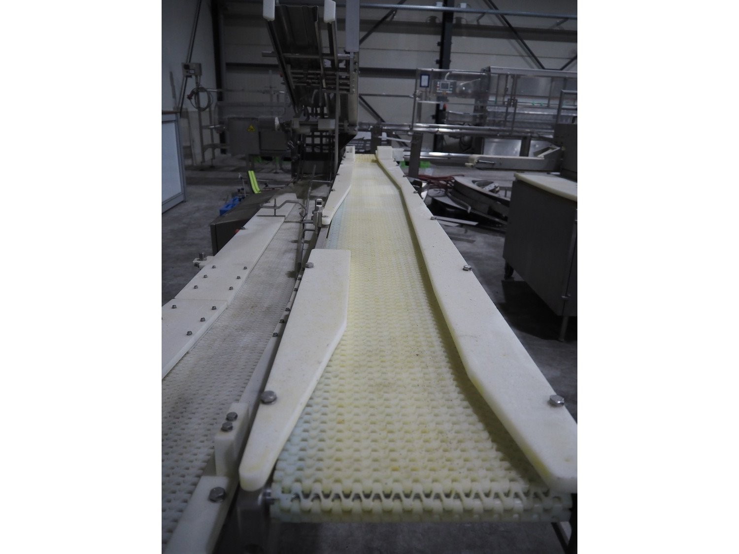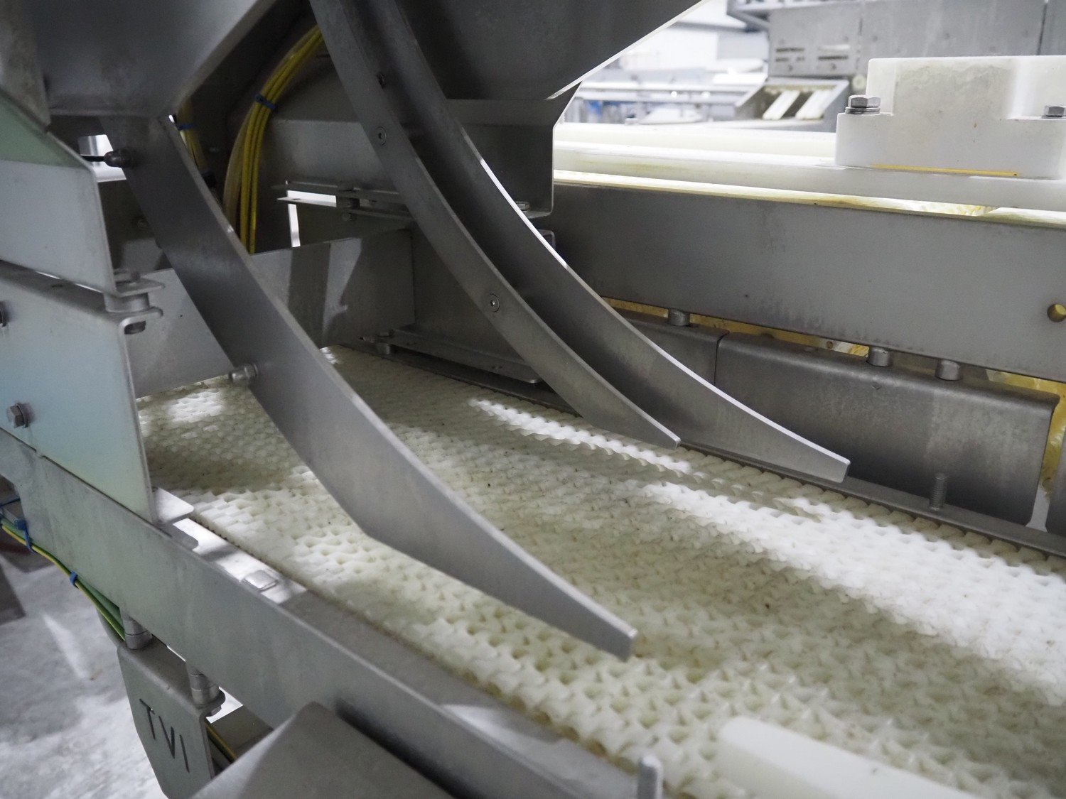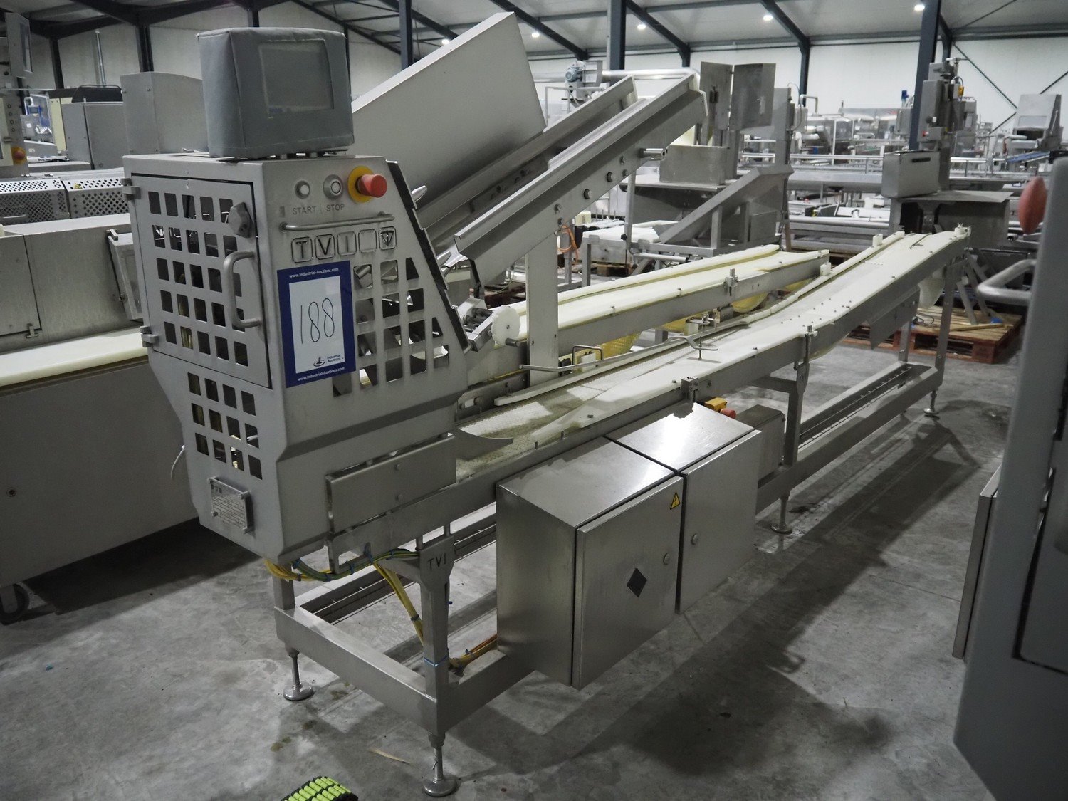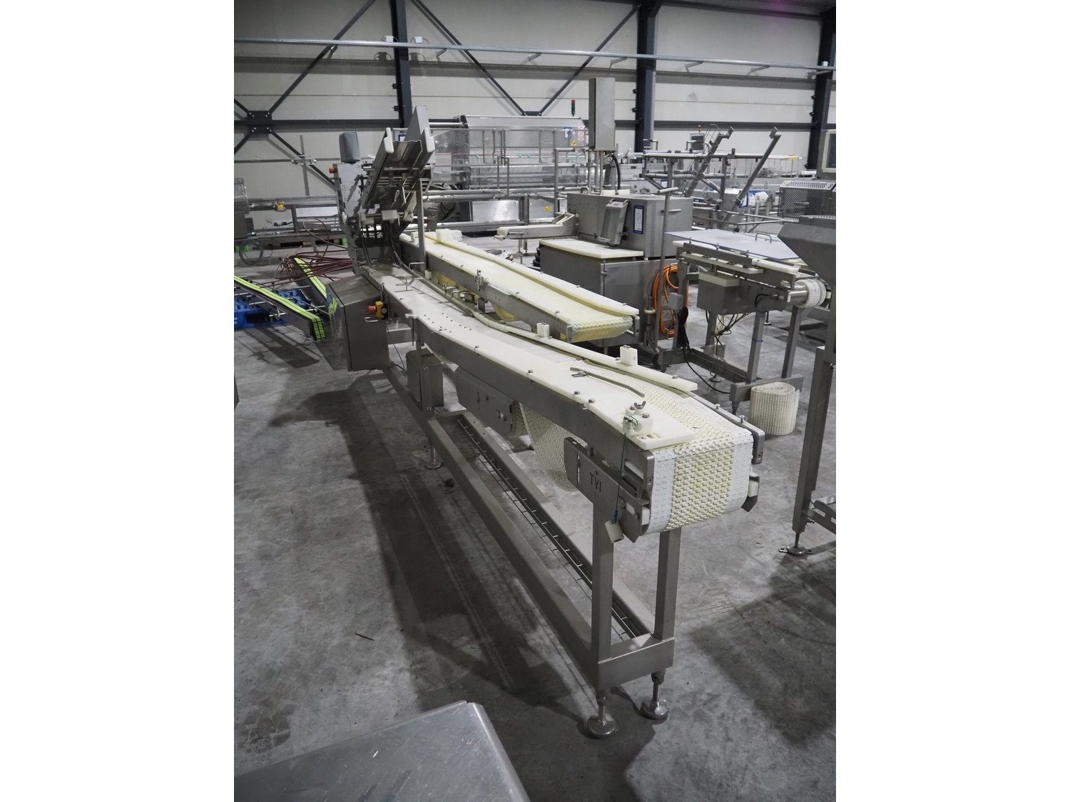 TVI Entwicklung & Produktion GmbH tray denester, type: TDS 300, serial number: 115, year of construction: 2012, 400 V, weight: 70 kg, dye: 232 mm x 146 mm, plastic mesh belt, belt width: 250 mm, total dimensions: 4350 mm x 1000 mm x 1800 mm. Kavel locatie: Langereijt 29A, 5091 JP Middelbeers, Nederland