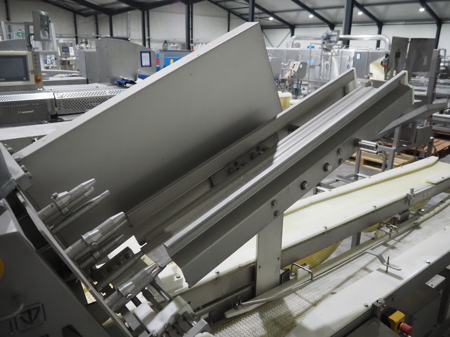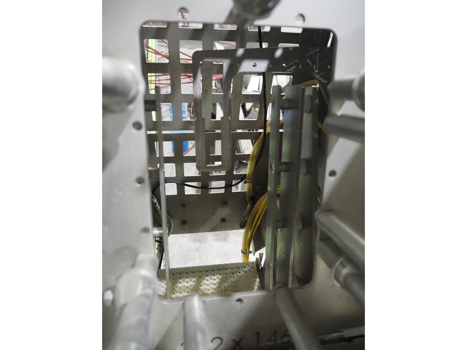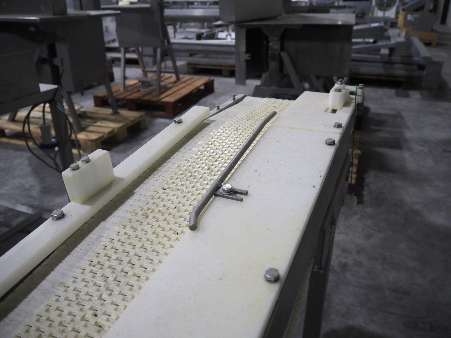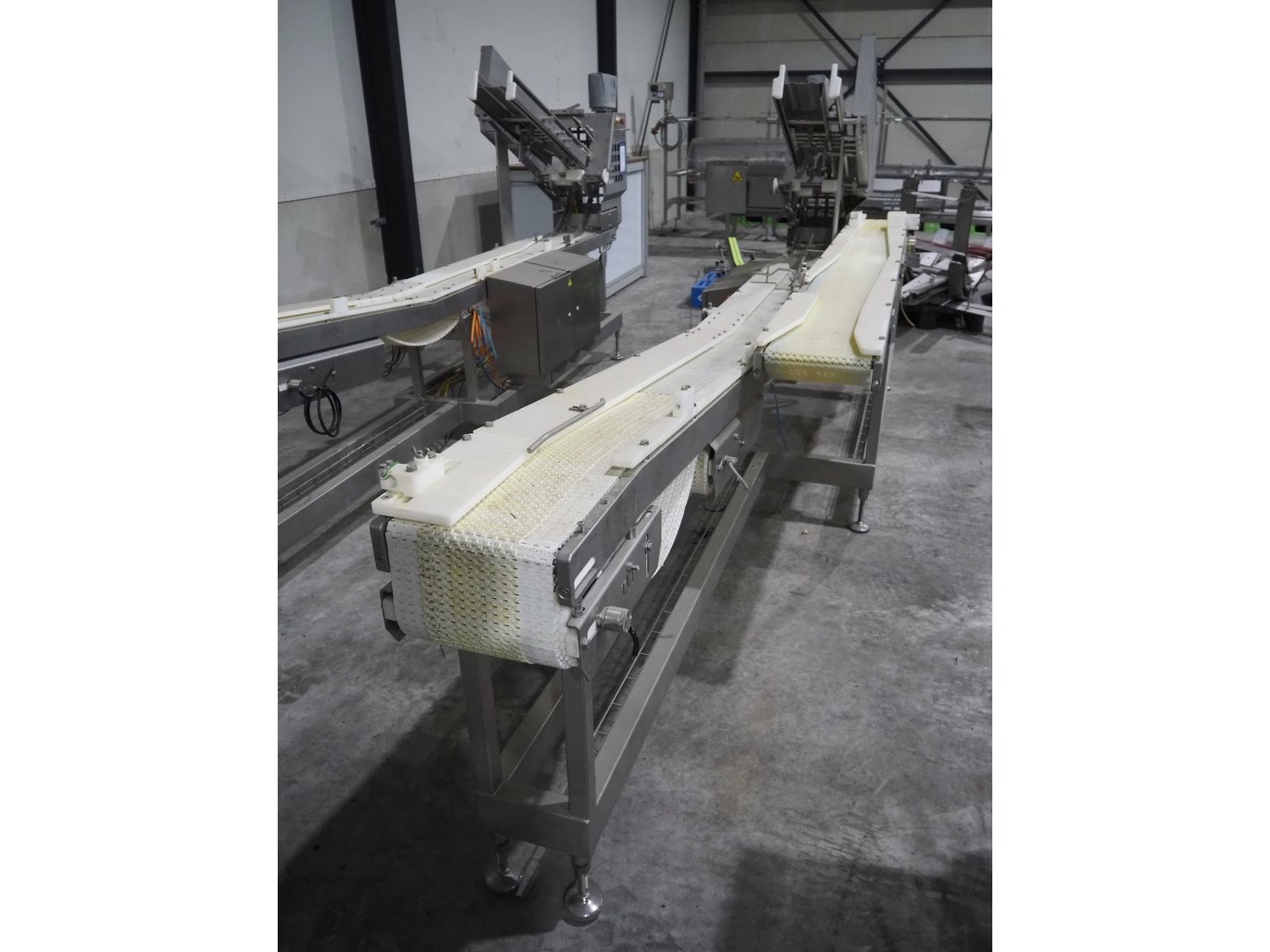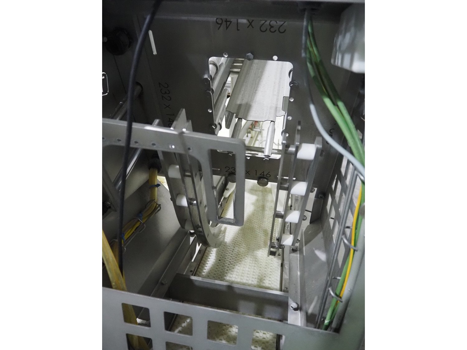 TVI Entwicklung & Produktion GmbH tray denester, type: TDS 300, serial number: 115, year of construction: 2012, 400 V, weight: 70 kg, dye: 232 mm x 146 mm, plastic mesh belt, belt width: 250 mm, total dimensions: 4350 mm x 1000 mm x 1800 mm. Kavel locatie: Langereijt 29A, 5091 JP Middelbeers, Nederland