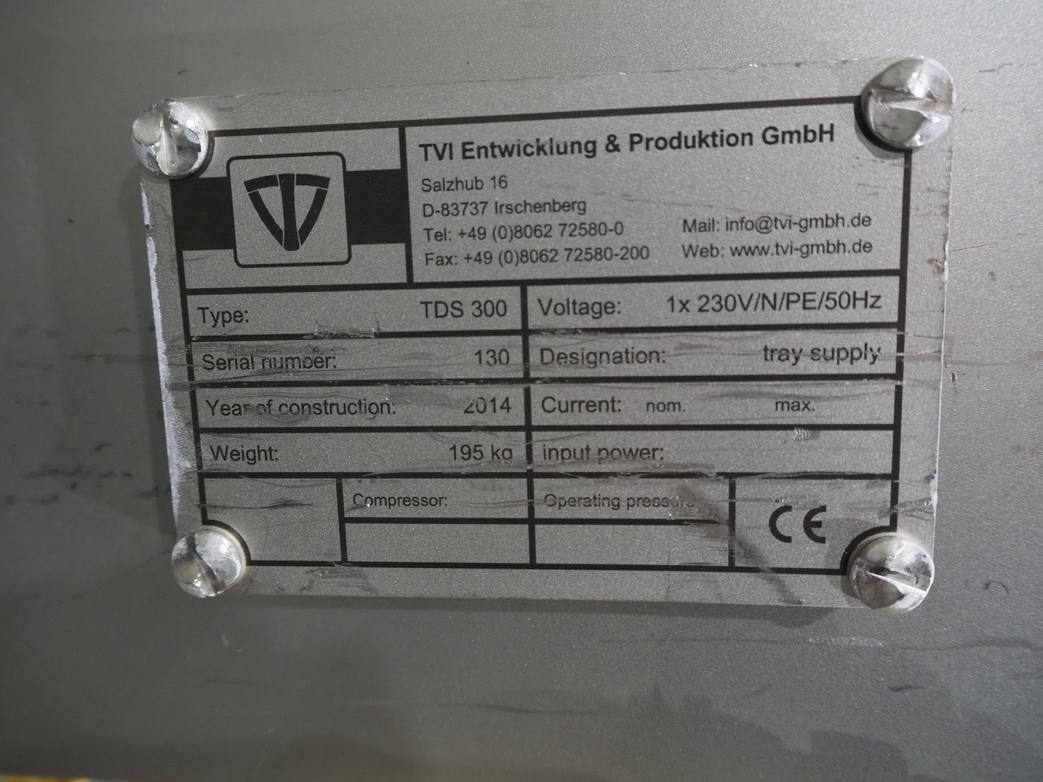 Part for TVI Entwicklung & Produktion GmbH machine, type: TDS 300, serial number: 130, year of construction: 2014, weight: 195 Kg, 230 V, 1 Ph, 50 Hz, dimensions: 1700 mm x 1000 mm x 550 mm. Kavel locatie: Langereijt 29A, 5091 JP Middelbeers, Nederland