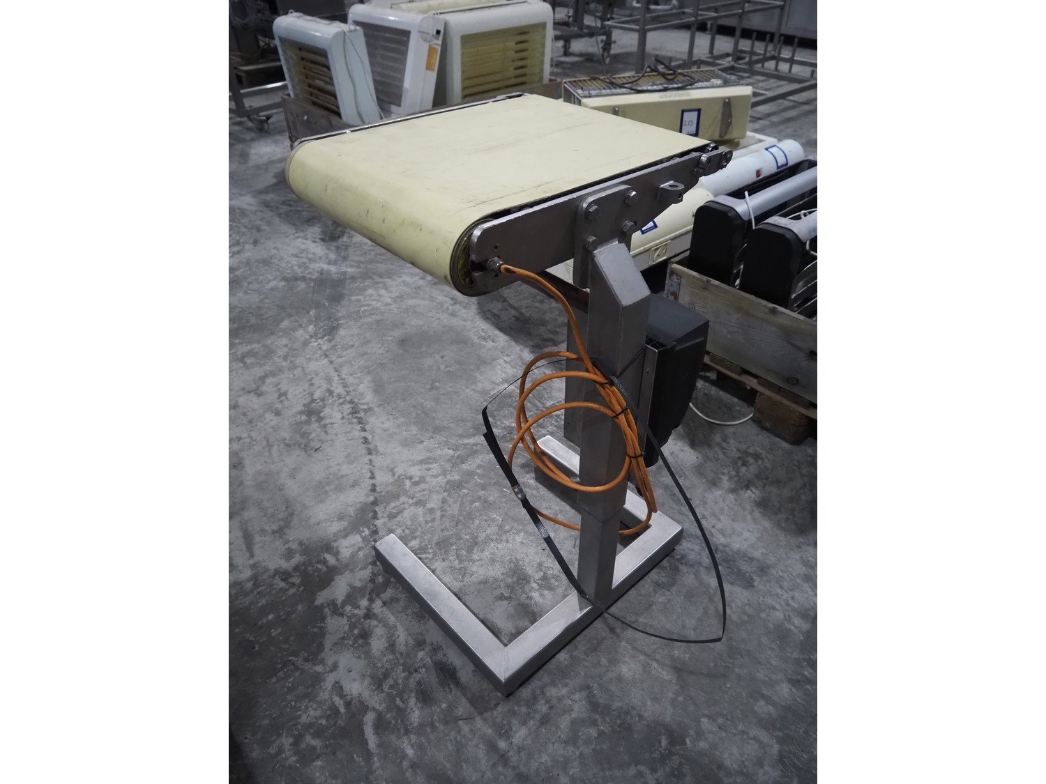 S/s transport belt, plastic belt, belt width: 375 mm, total dimensions: 530 mm x 500 mm x 850 mm. Kavel locatie: Langereijt 29A, 5091 JP Middelbeers, Nederland