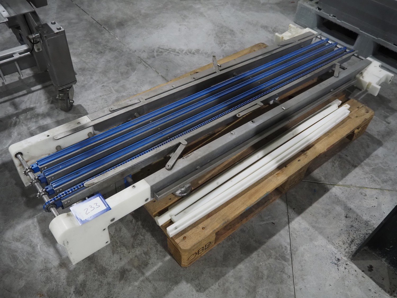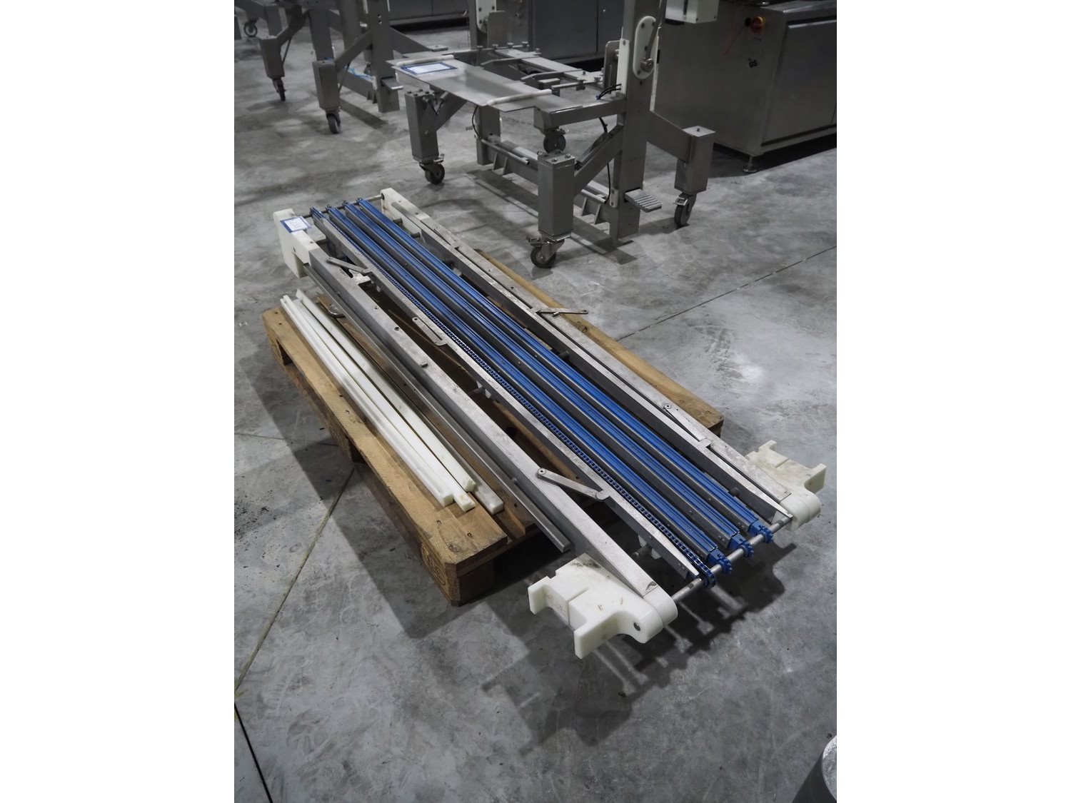 Transport belt, chain conveyor, chain width: 190 mm, total dimensions: 1900 mm x 750 mm x 180 mm. 3 chains are missing. Kavel locatie: Langereijt 29A, 5091 JP Middelbeers, Nederland
