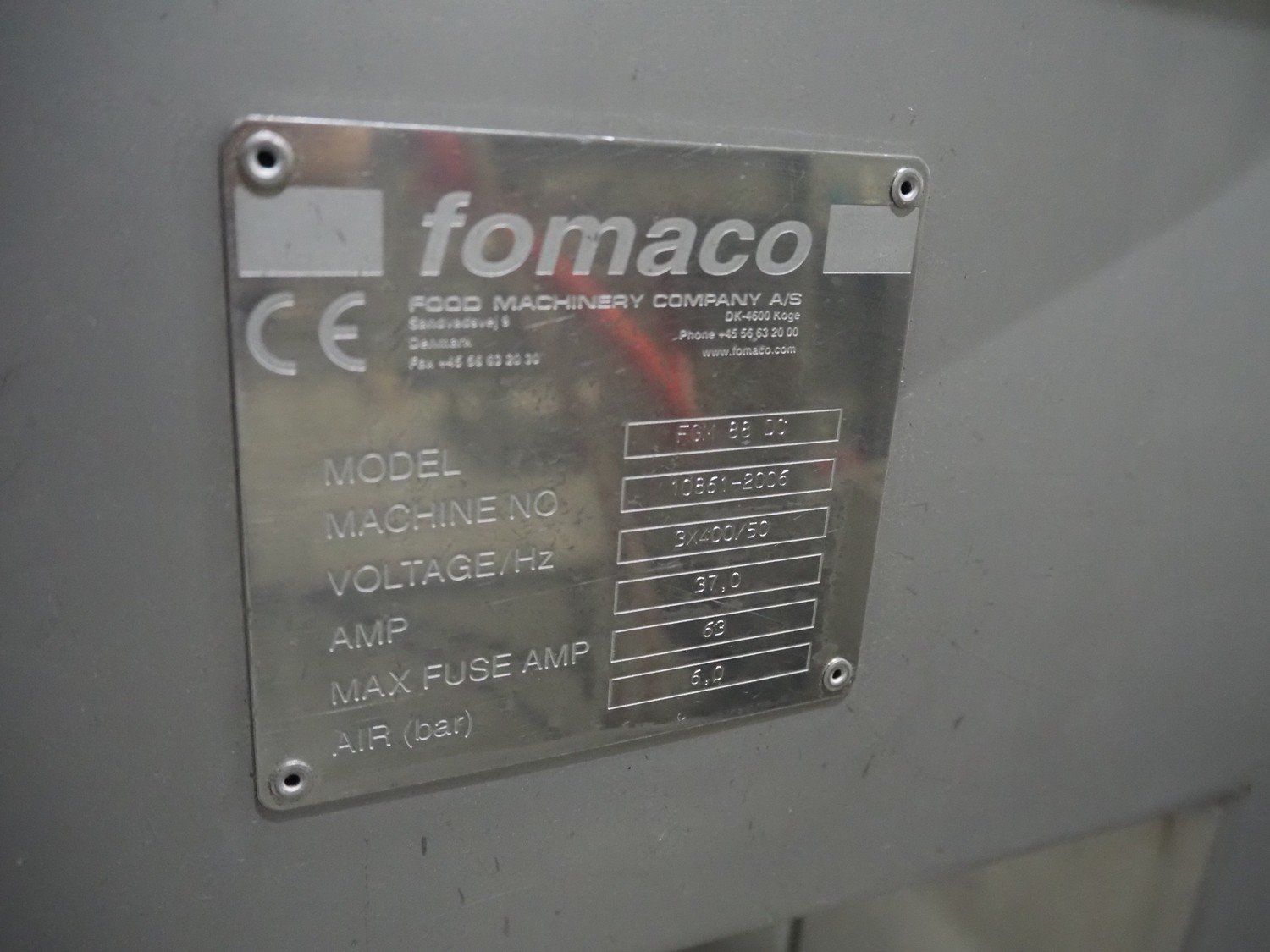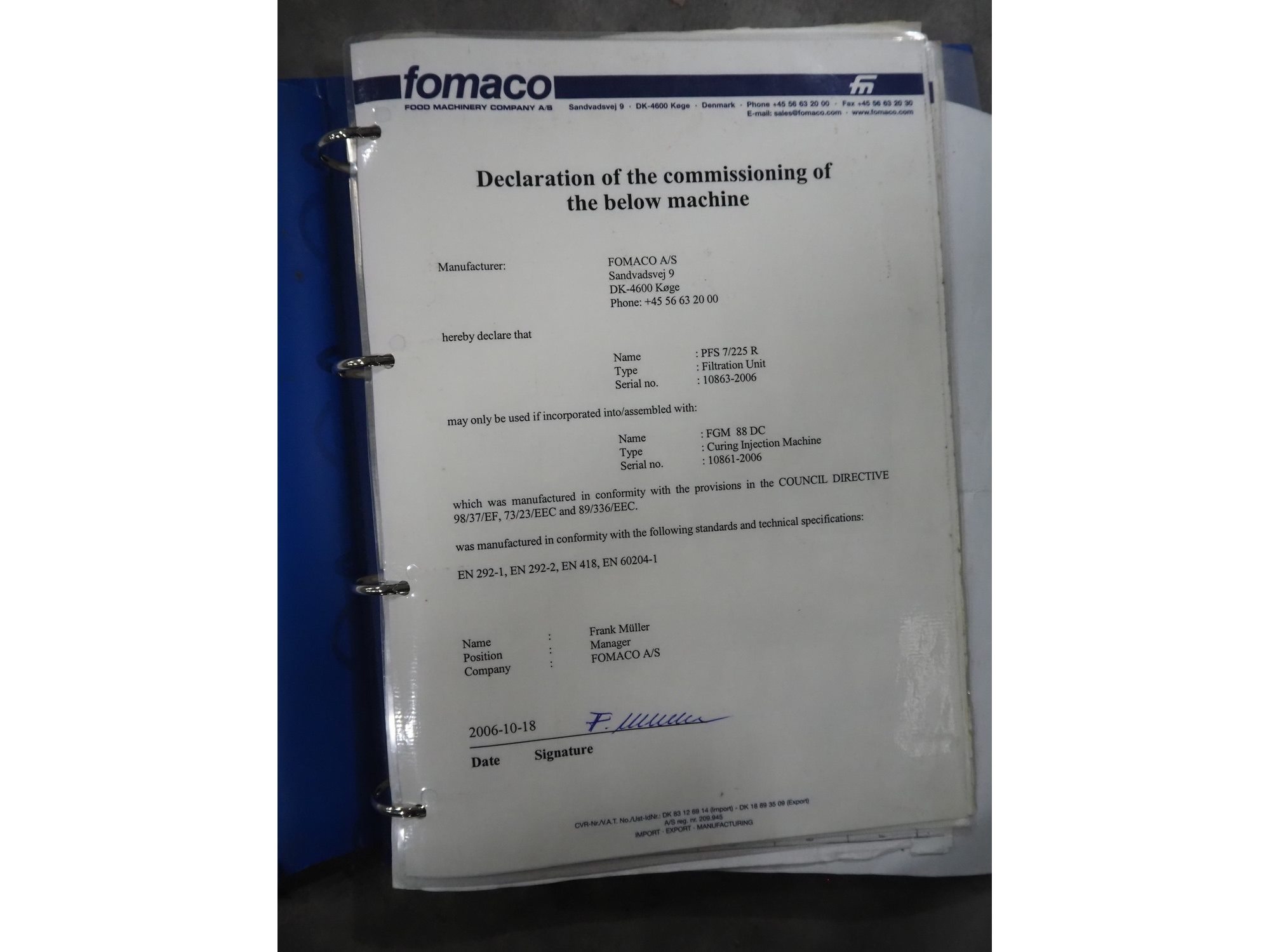 Fomaco injector, model: FGM 88 DC, machine number: 10861-2006, year of construction: 2006, 400 V, 3 Ph, 50 Hz, 63 A, 37.0 kW, air: 6.0 bar, plastic mesh belt, belt width: 720 mm, total dimensions: 2900 mm x 1300 mm x 2300 mm. Including Fomaco mobile filter tub, model: PFS 7 / 225 R, dimensions: 1900 mm x 700 mm x 950 mm, mobile frame for belt, dimensions frame: 2900 mm x 900 mm x 1250 mm. Incomplete. Kavel locatie: Langereijt 29A, 5091 JP Middelbeers, Nederland