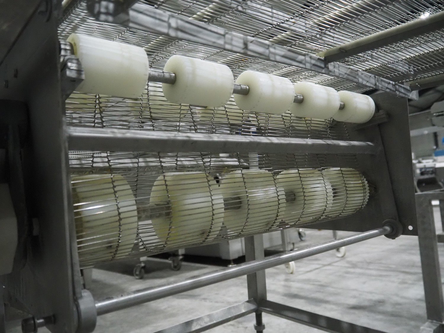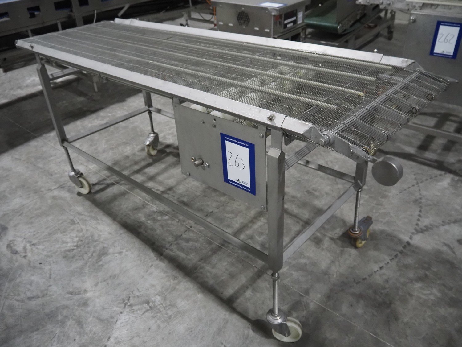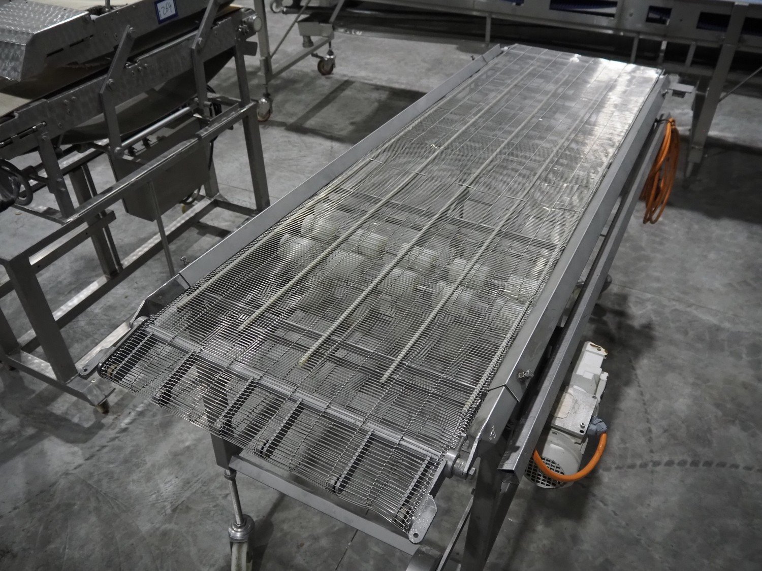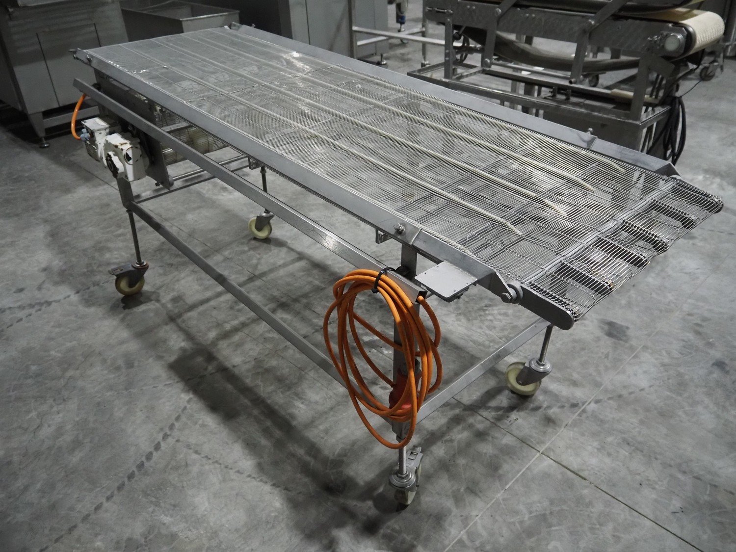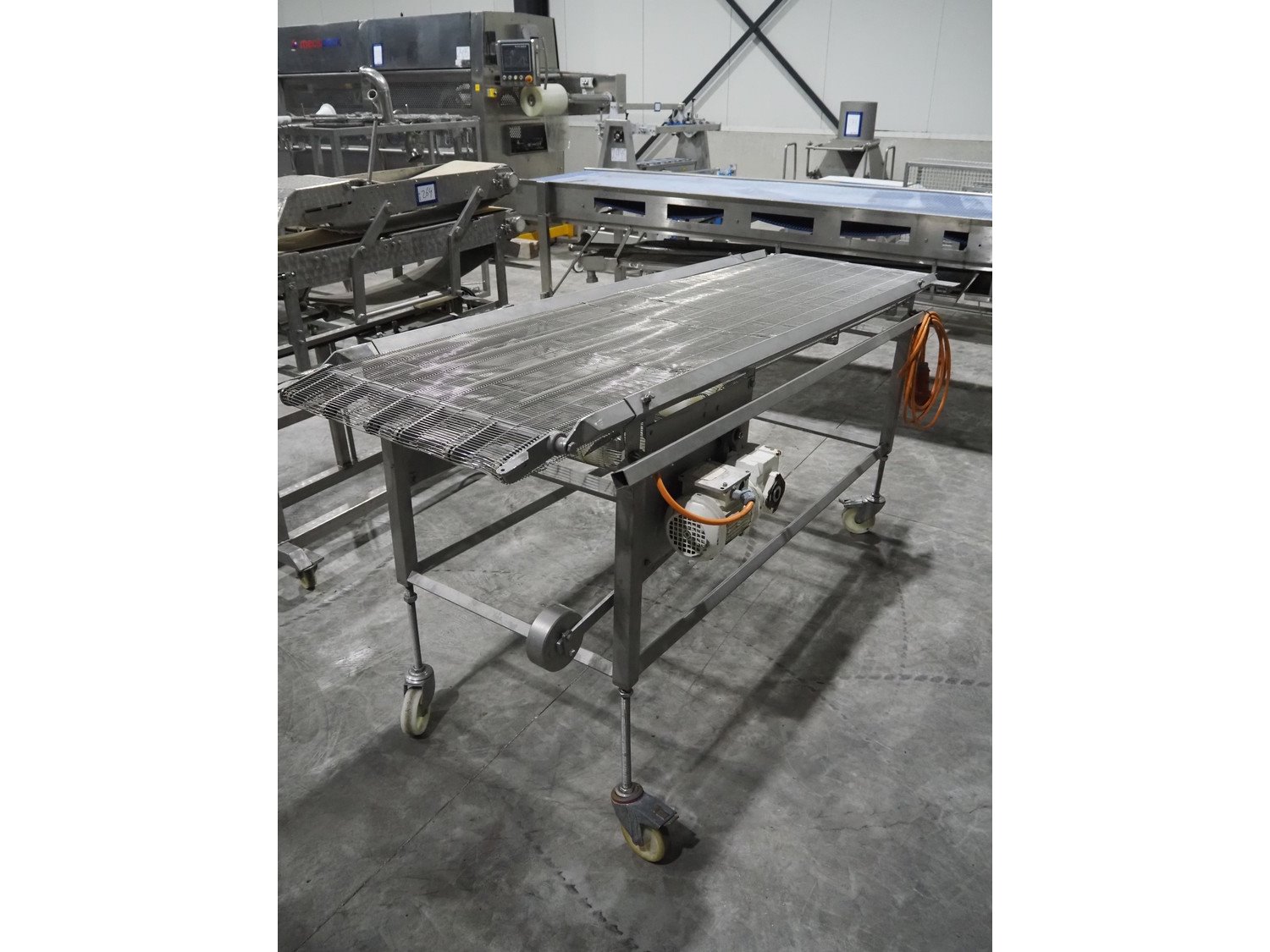 S/s mobile mesh belt, s/s mesh belt, belt width: 600 mm, total dimensions: 2260 mm x 850 mm x 1030 mm. Kavel locatie: Langereijt 29A, 5091 JP Middelbeers, Nederland