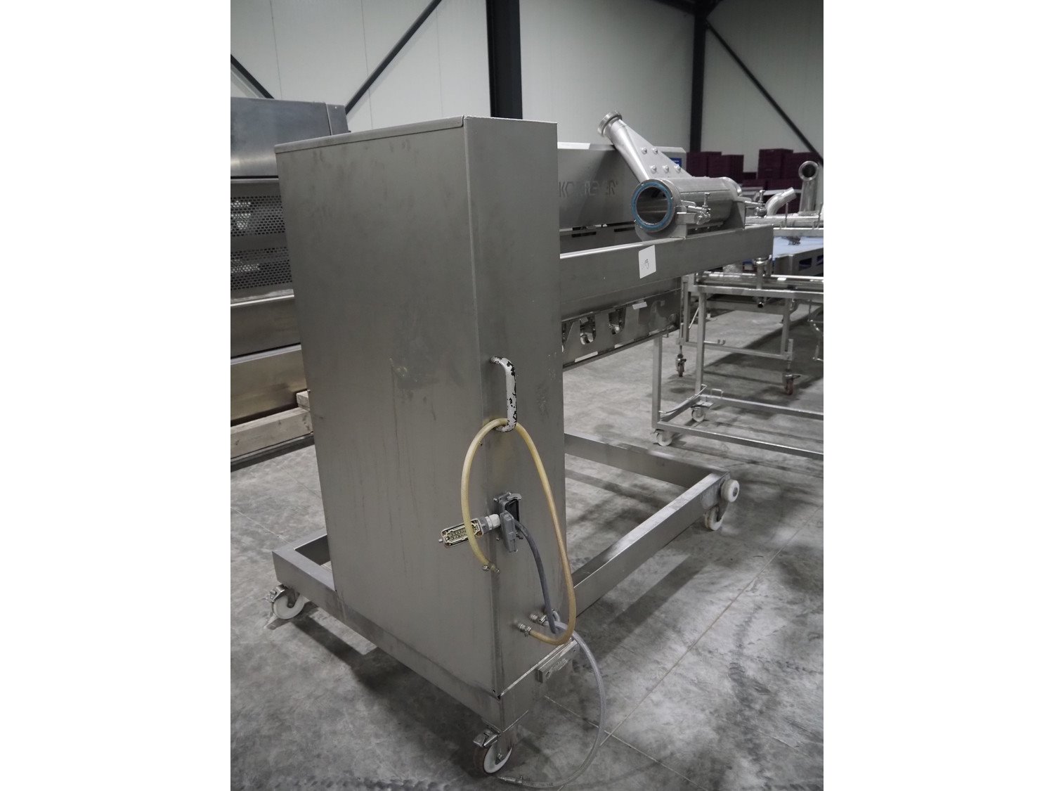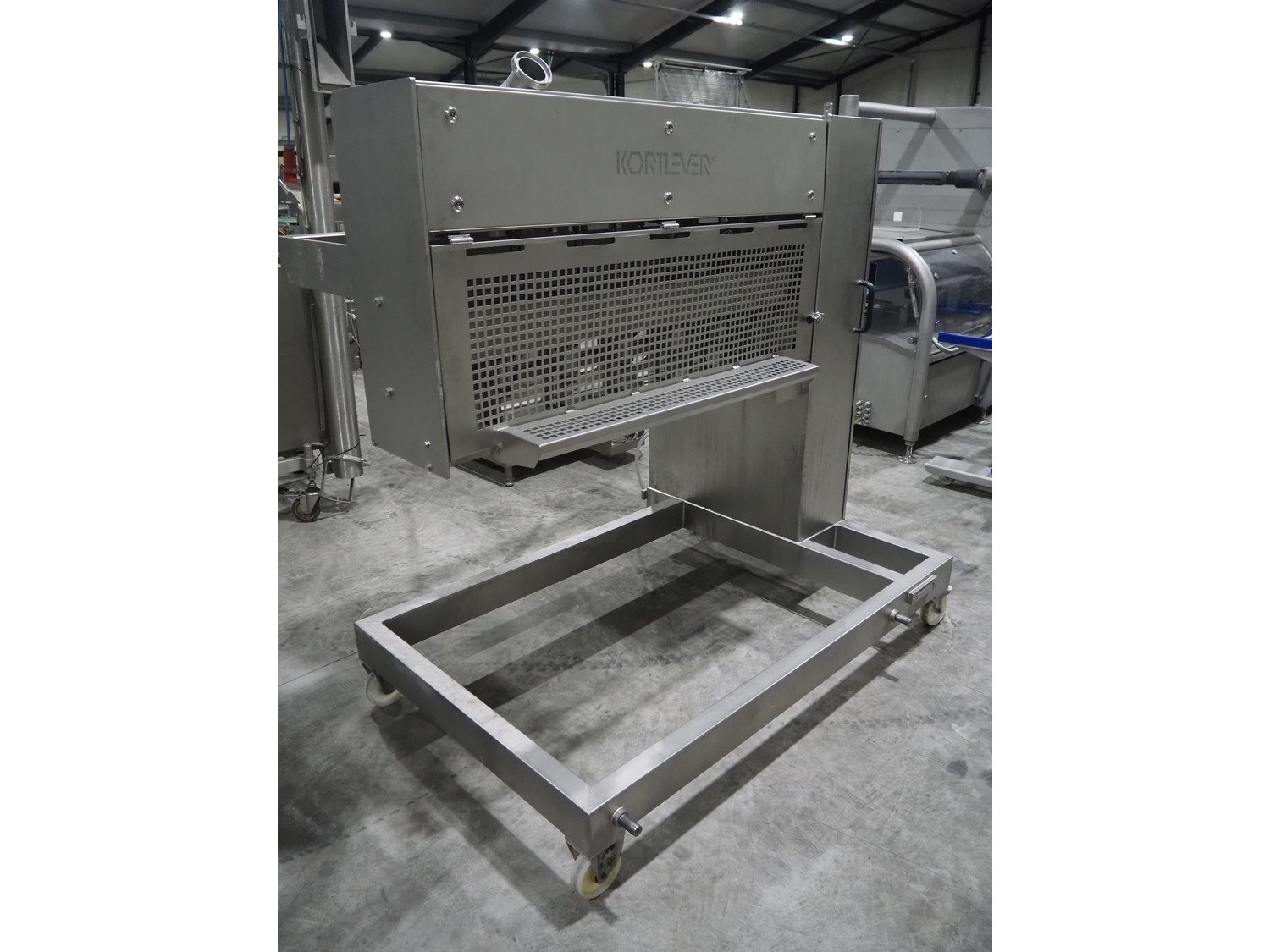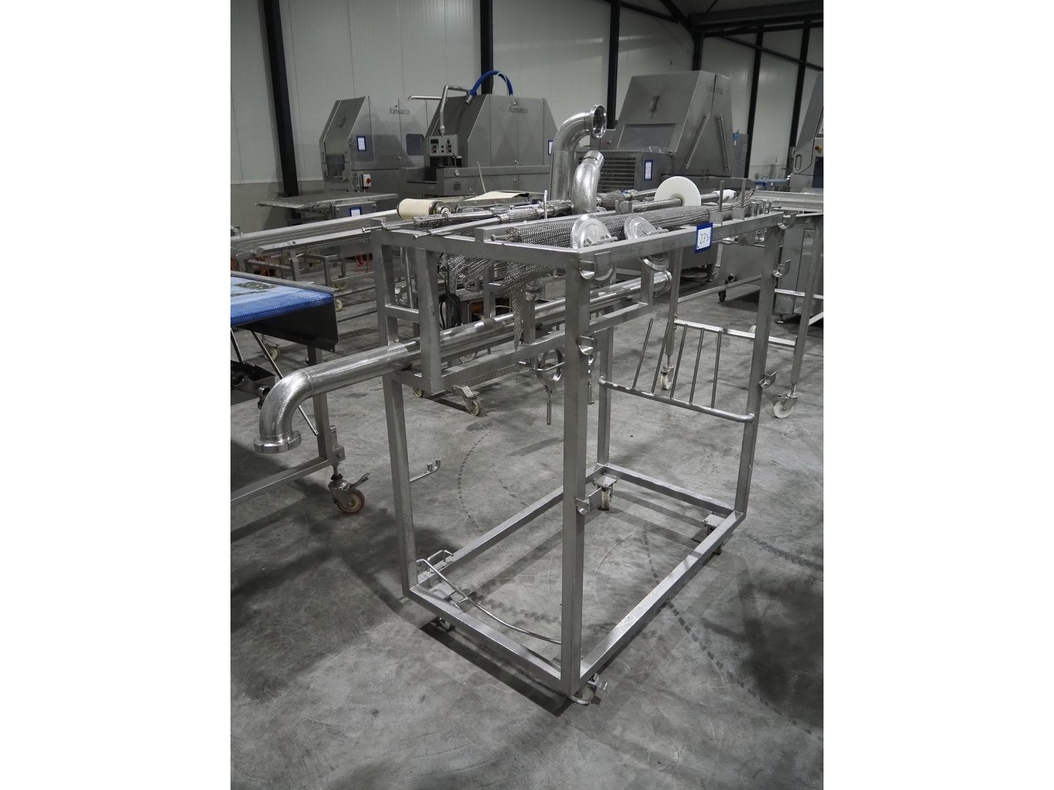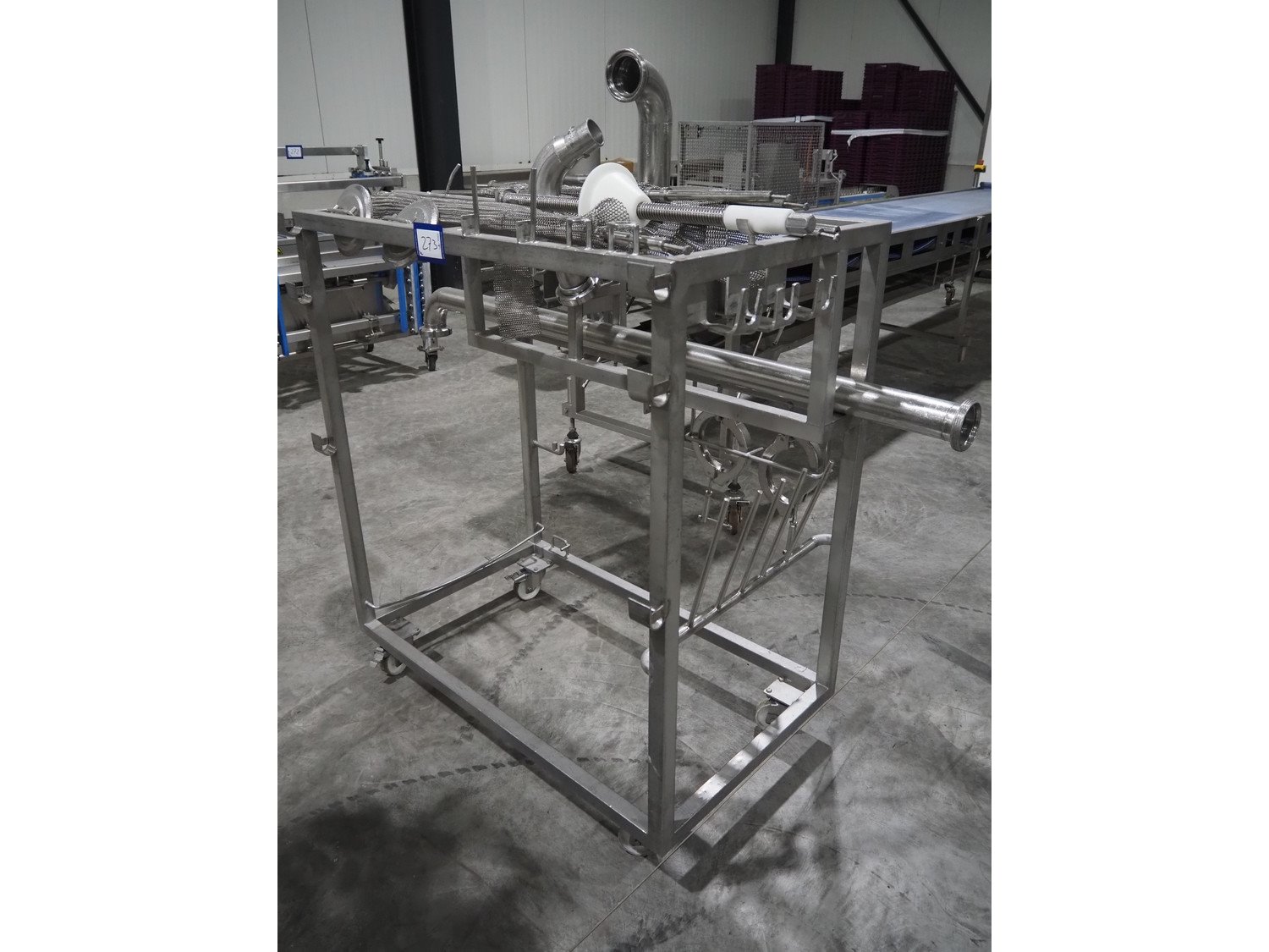 Kortlever mobile waterwheel, 5 heads, dimensions: 1700 mm x 1250 mm x 1700 mm. Incomplete. Including s/s trolley with parts, dimensions: 1300 mm x 750 mm x 1400 mm. Kavel locatie: Langereijt 29A, 5091 JP Middelbeers, Nederland