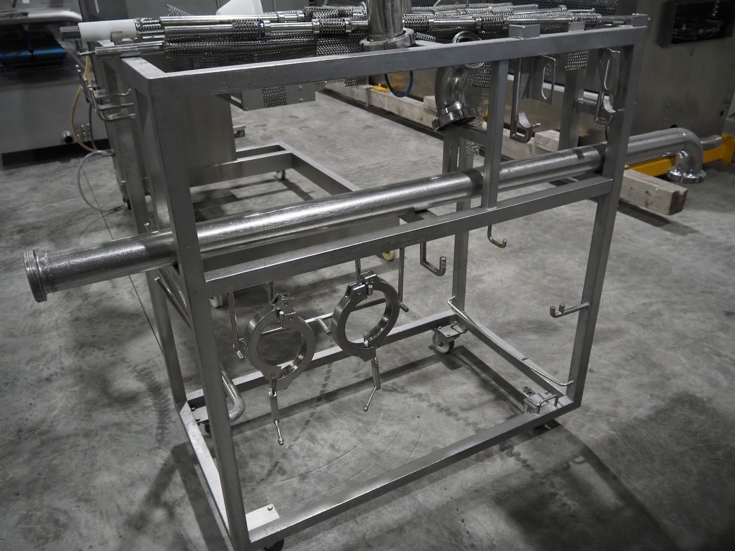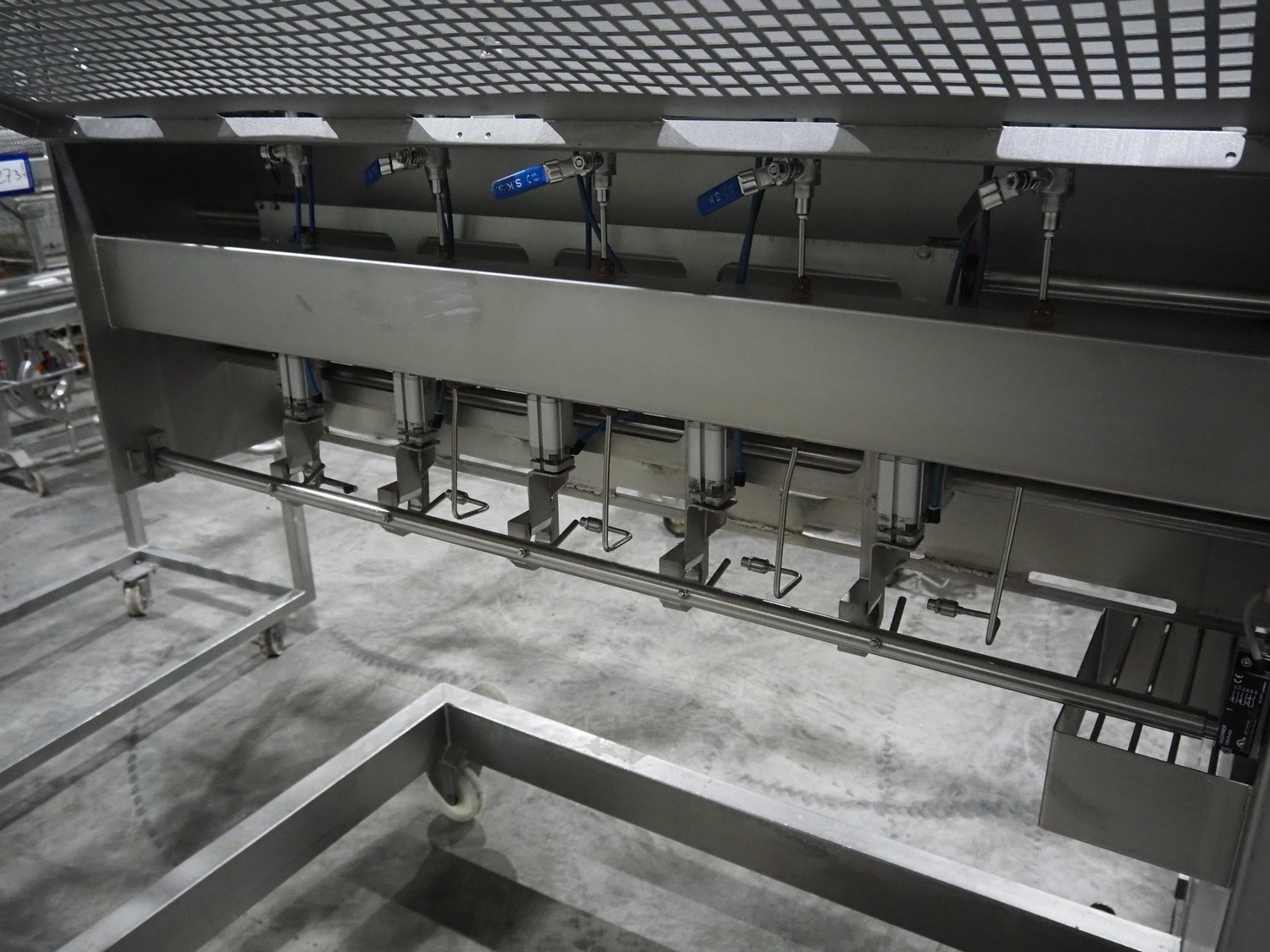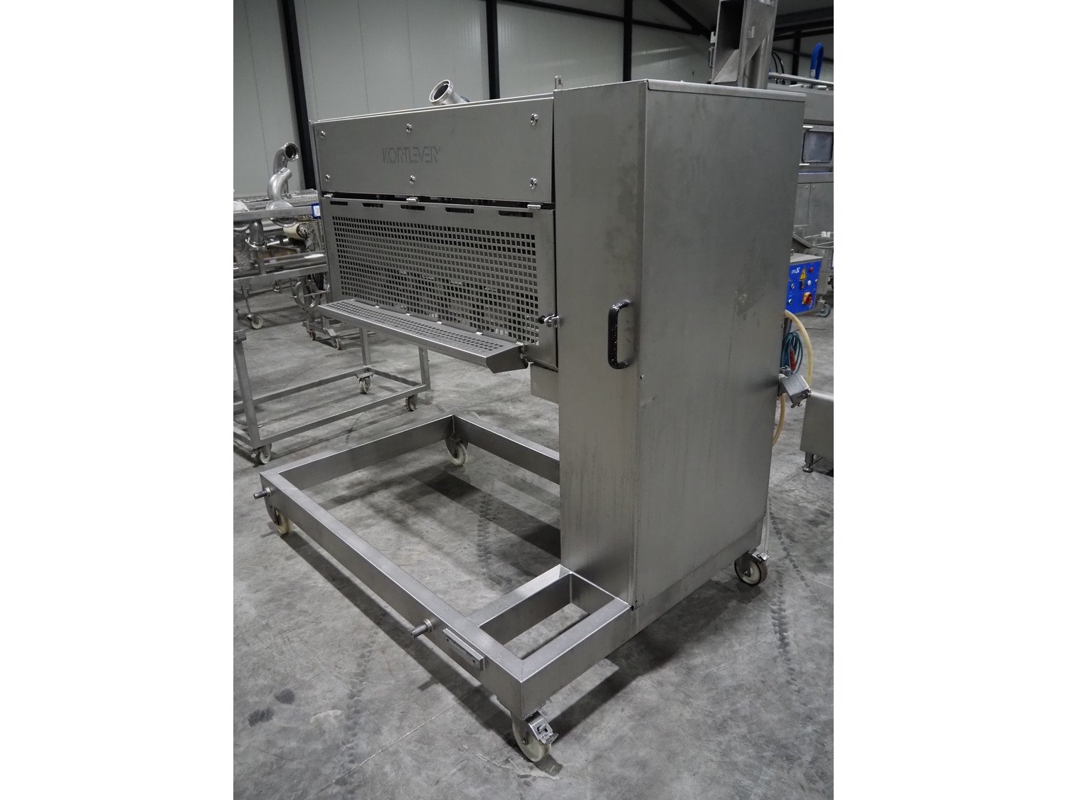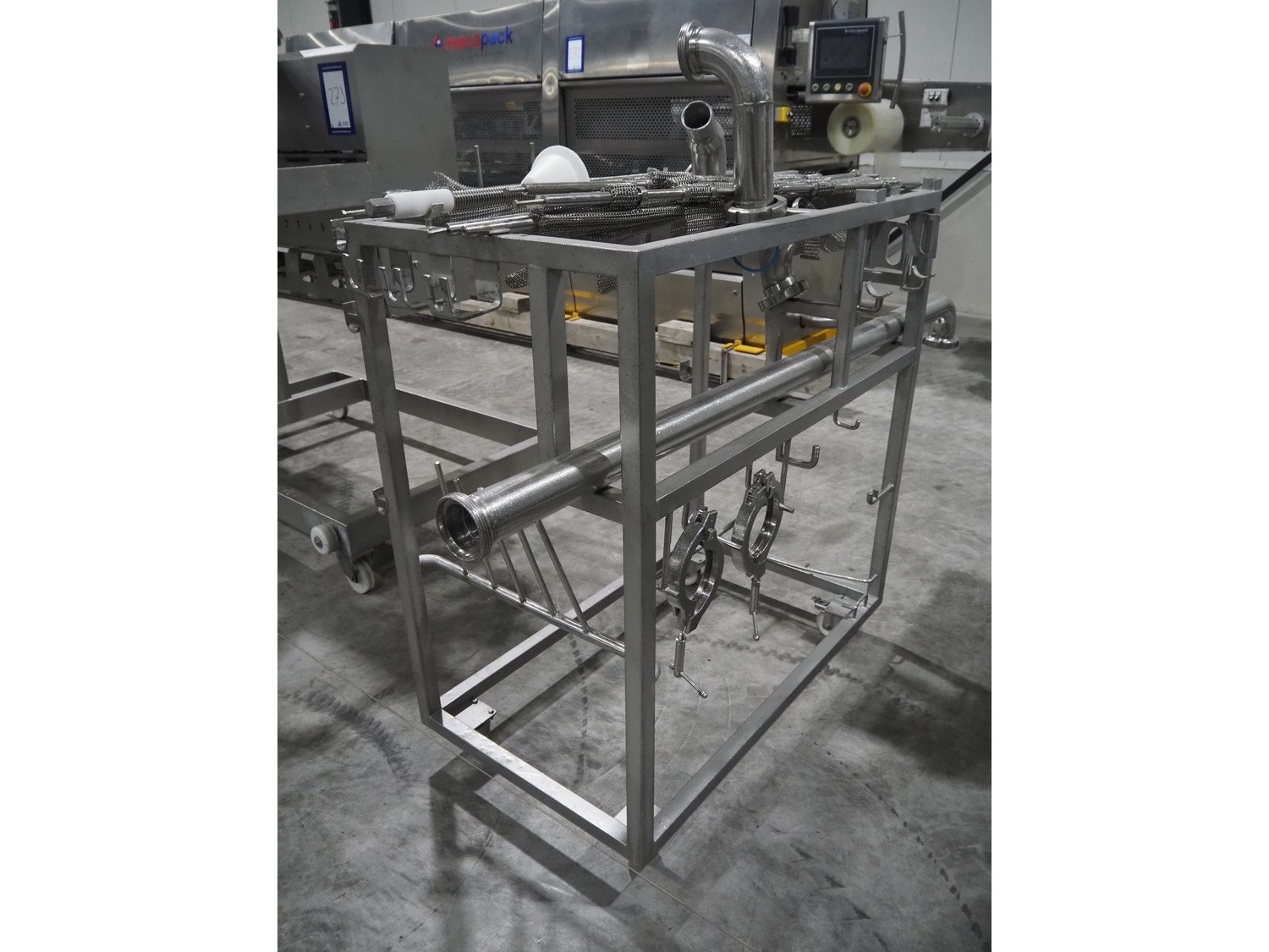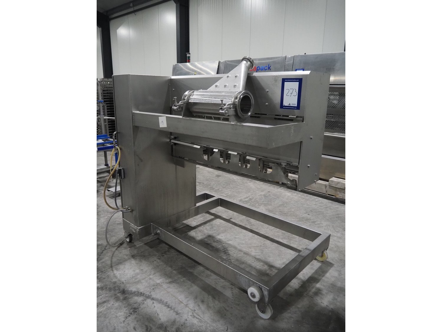 Kortlever mobile waterwheel, 5 heads, dimensions: 1700 mm x 1250 mm x 1700 mm. Incomplete. Including s/s trolley with parts, dimensions: 1300 mm x 750 mm x 1400 mm. Kavel locatie: Langereijt 29A, 5091 JP Middelbeers, Nederland