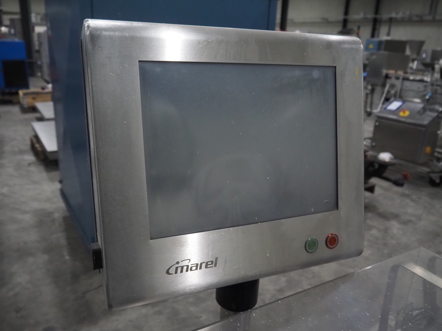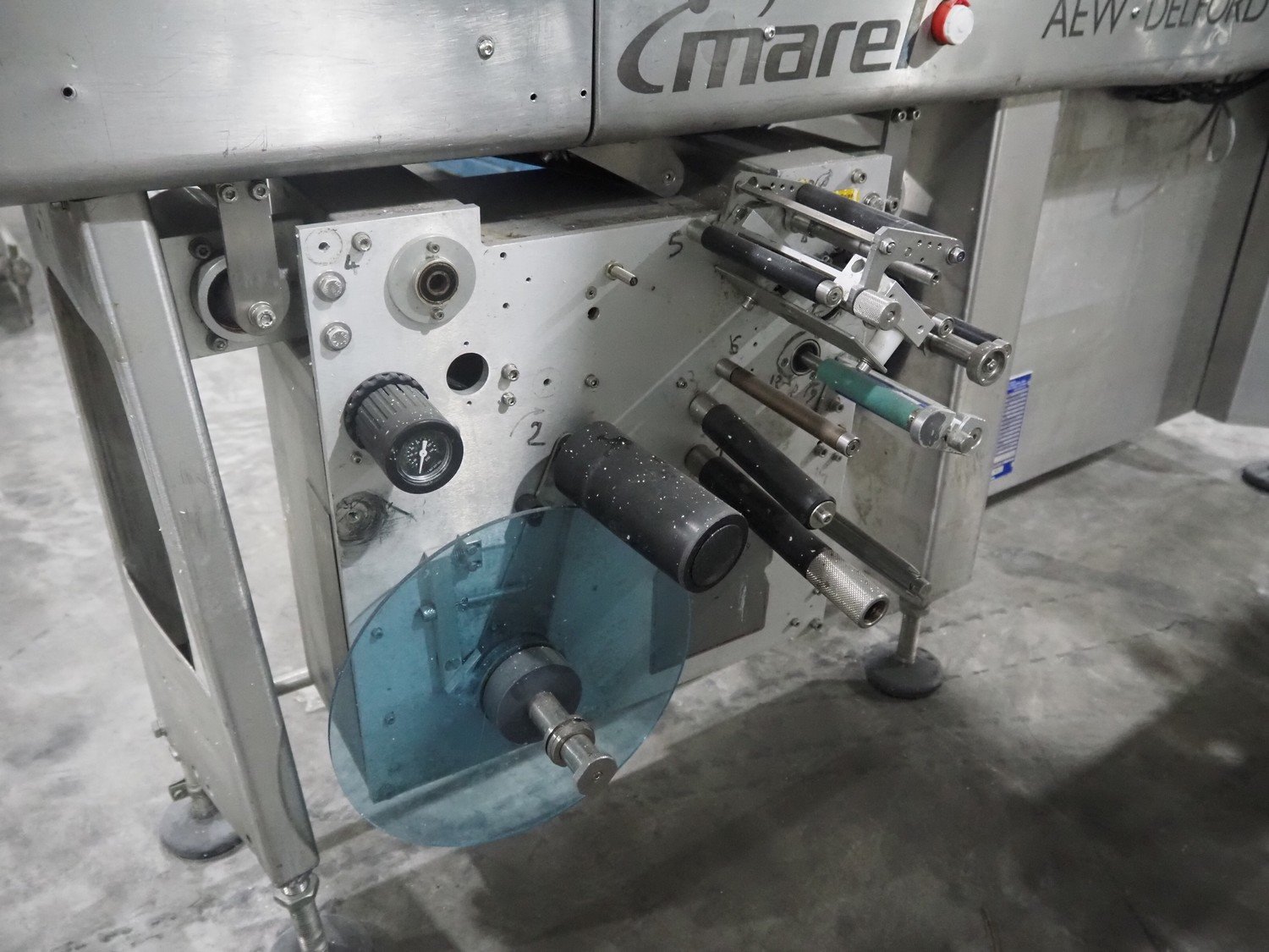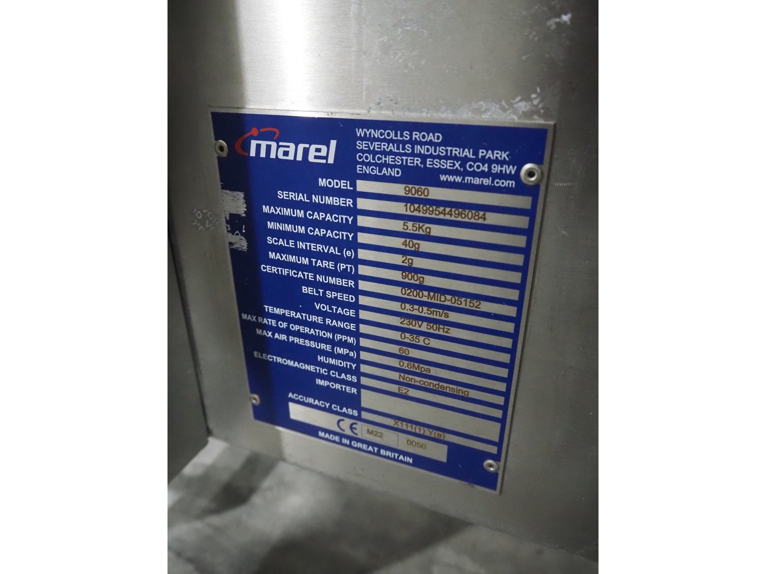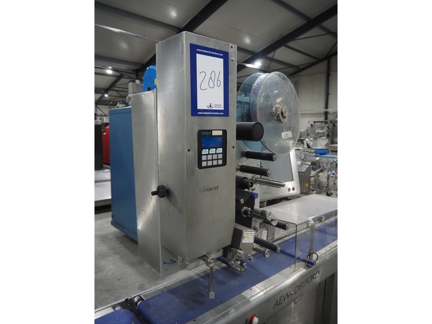 Marel / AEW Delford weighing and labelling machine, model: 9060, serial number: 1049954496084, Max capacity: 5.5 kg, 230 V, 50 Hz, belt speed: 0.3-0.5 m/s, plastic belt, belt width: 195 mm, total dimensions: 2600 mm x 650 mm x 1780 mm. Kavel locatie: Langereijt 29A, 5091 JP Middelbeers, Nederland