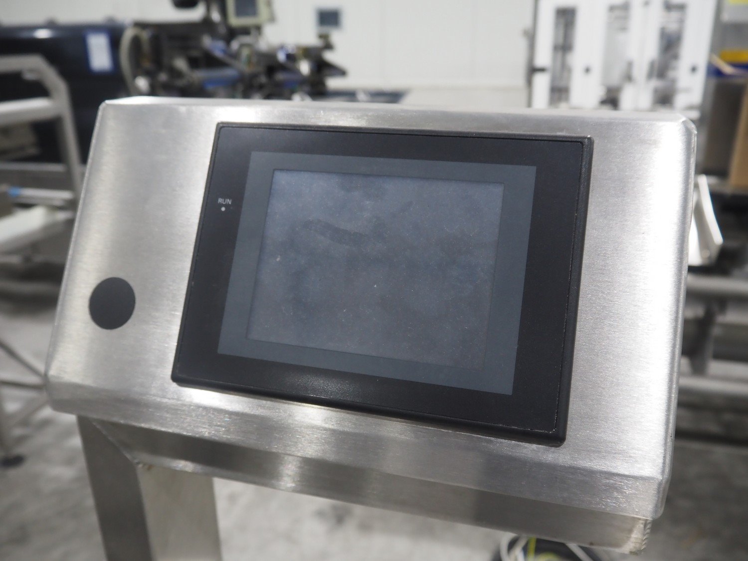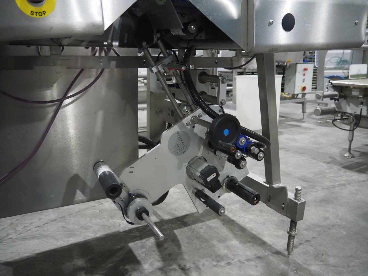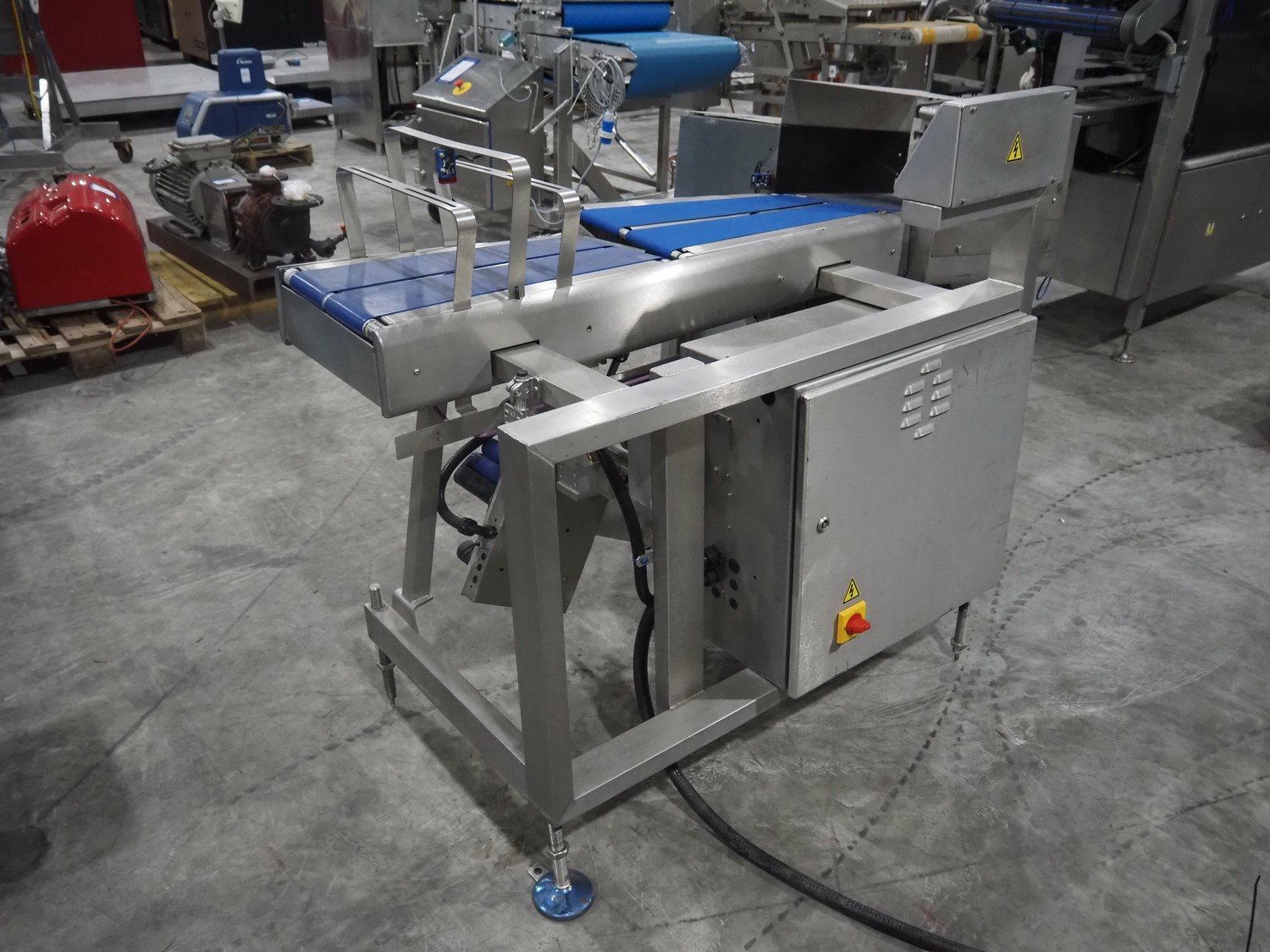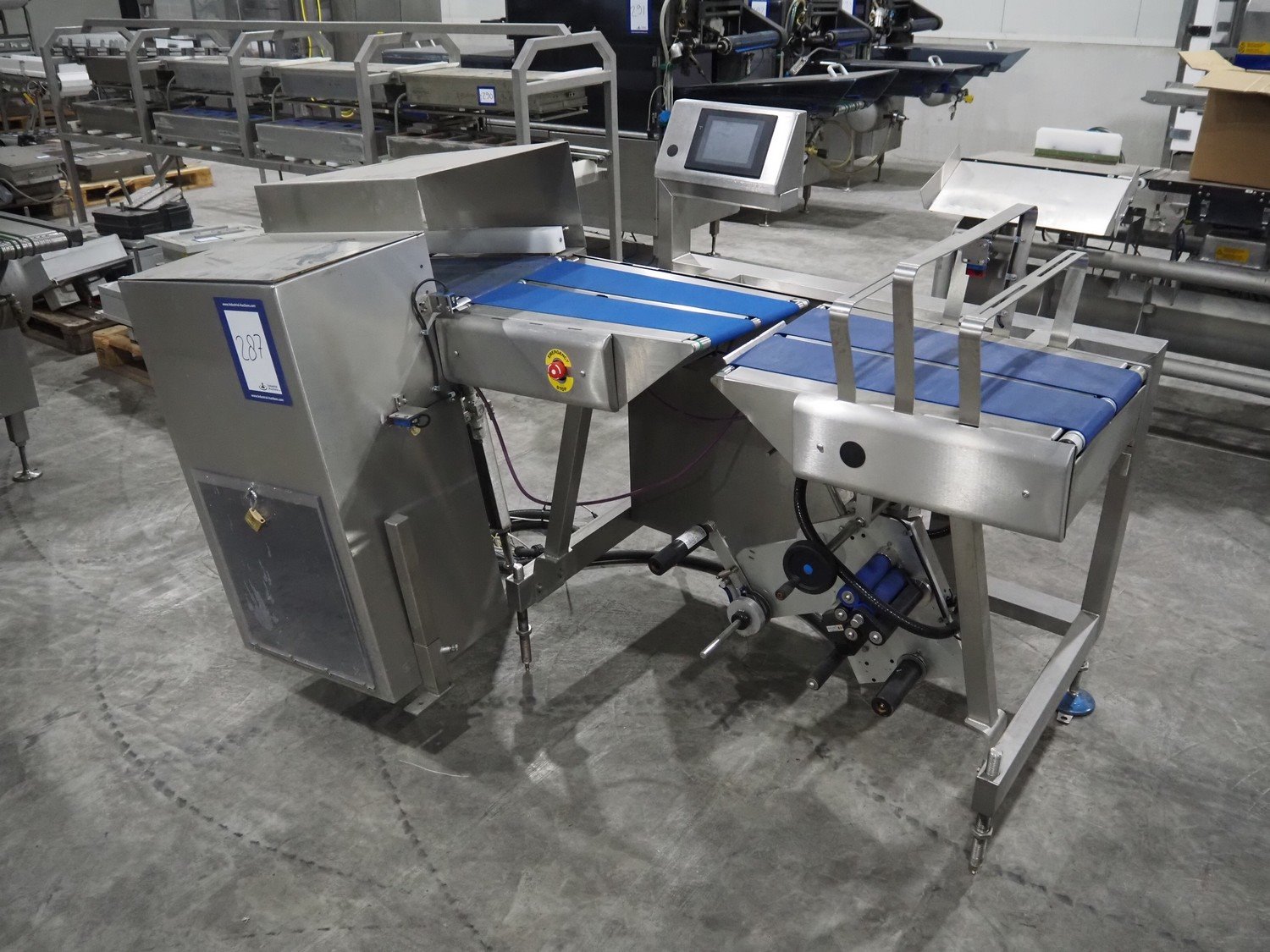 Marel weighing and labelling machine with rejector, plastic belt, belt width: (2x) 136 mm and 285 mm, total dimensions: 1720 mm x 1120 mm x 1220 mm. Kavel locatie: Langereijt 29A, 5091 JP Middelbeers, Nederland