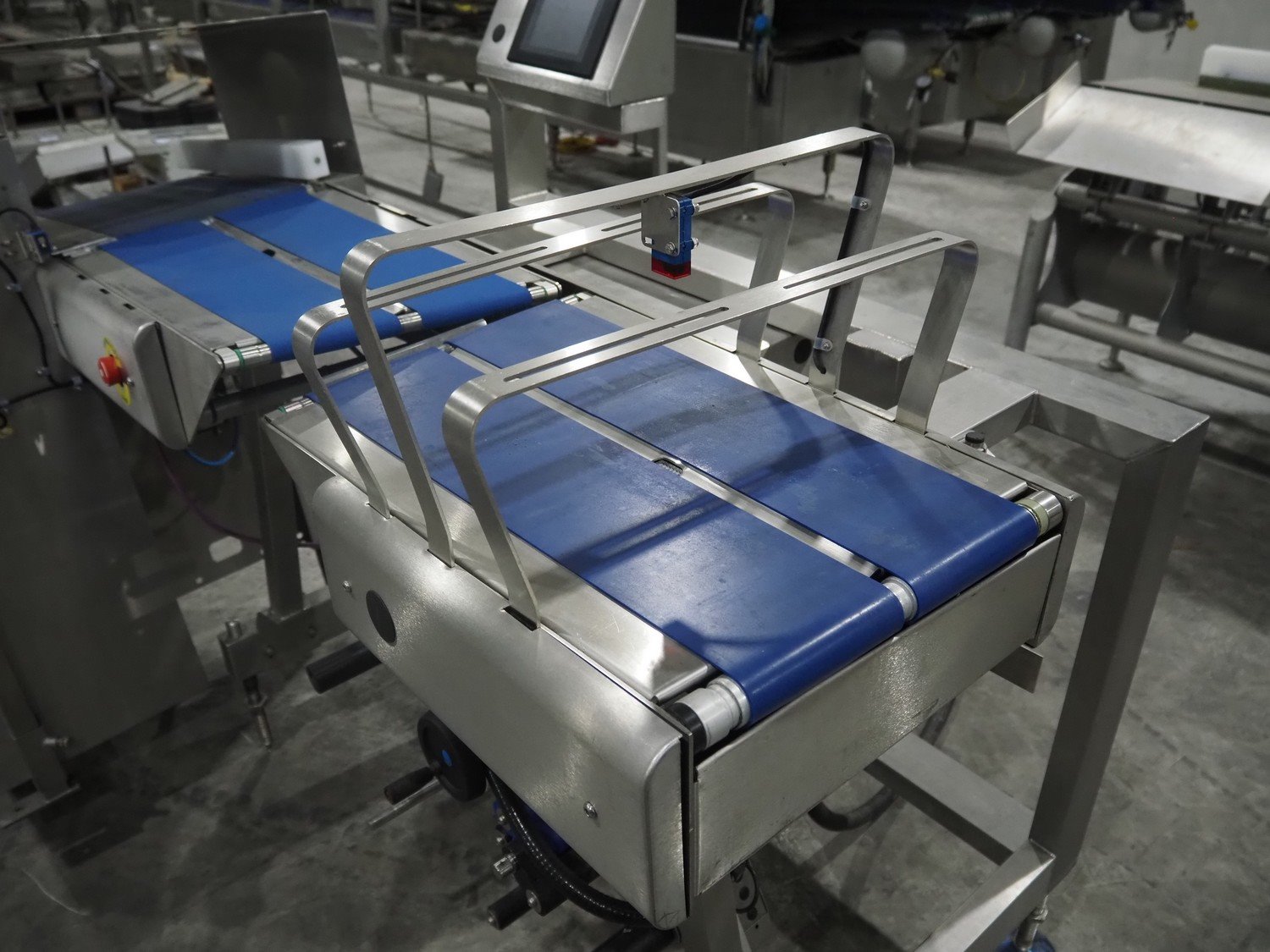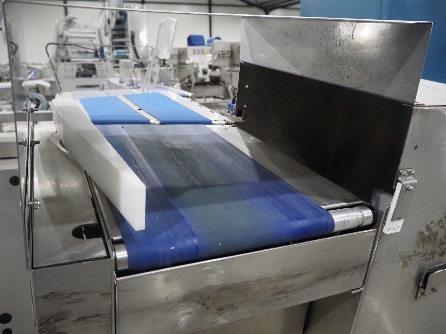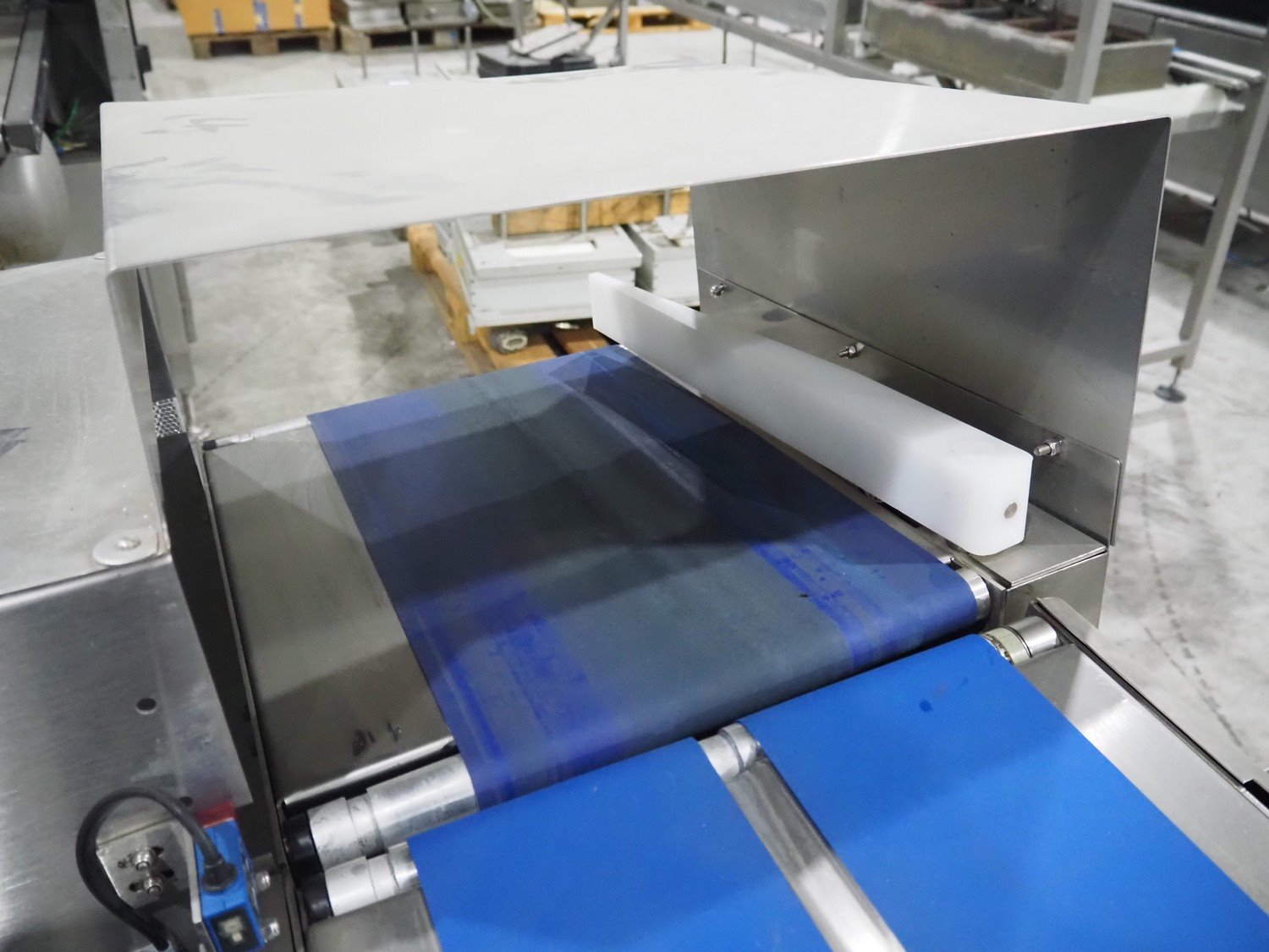 Marel weighing and labelling machine with rejector, plastic belt, belt width: (2x) 136 mm and 285 mm, total dimensions: 1720 mm x 1120 mm x 1220 mm. Kavel locatie: Langereijt 29A, 5091 JP Middelbeers, Nederland