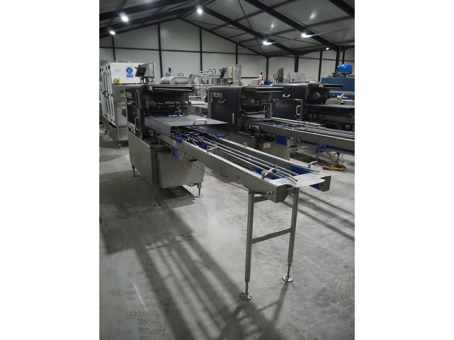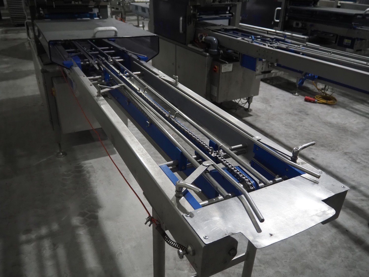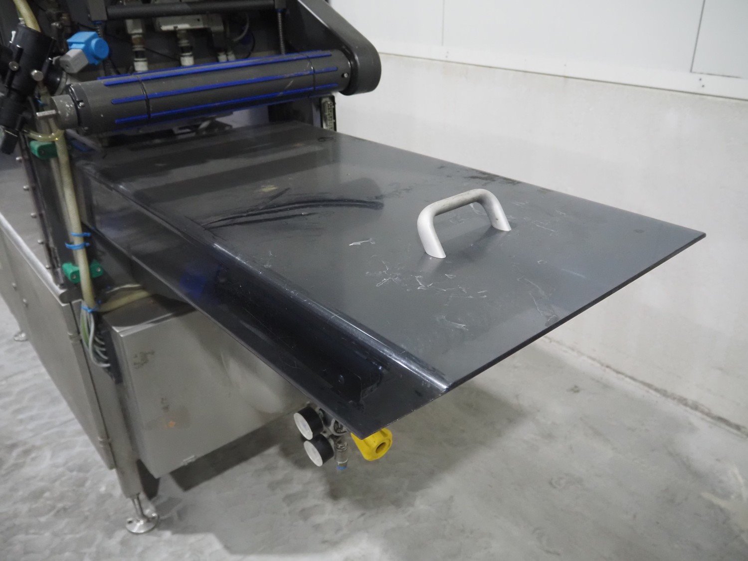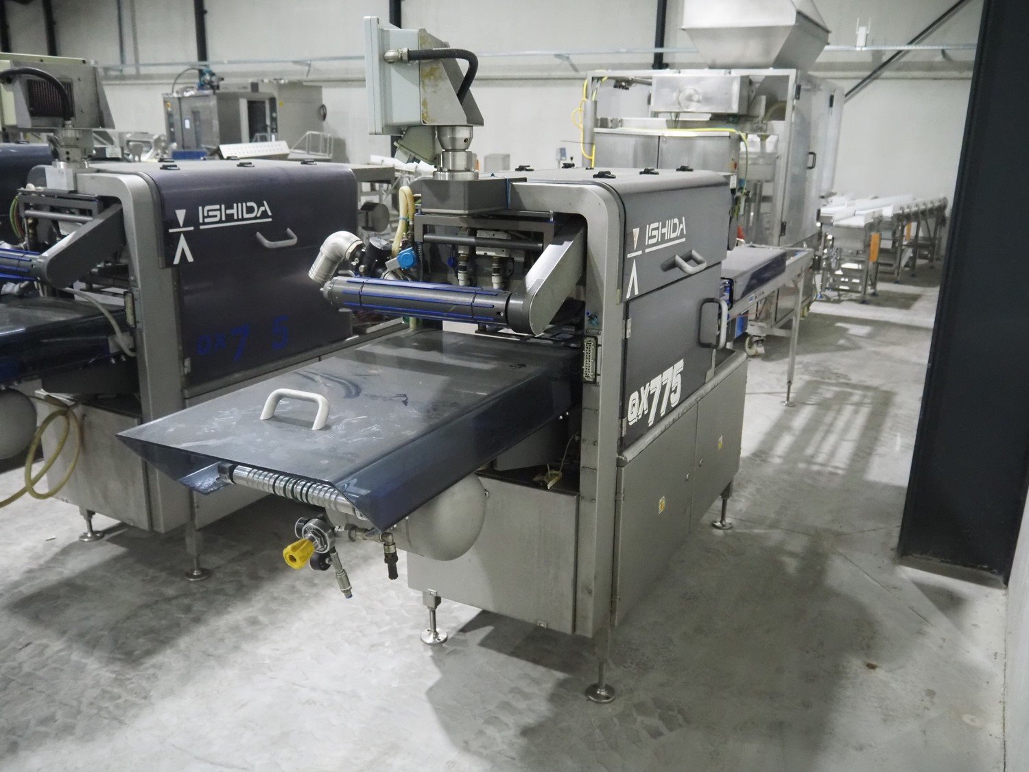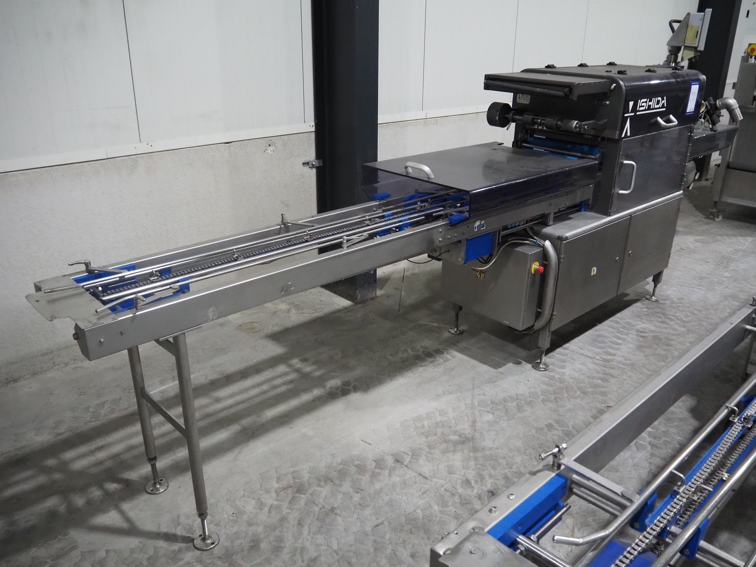 Ishida traysealer, model: QX775, s/s chain conveyor with dividers, distance between dividers: 300 mm, dimensions dye: (4x) 180 mm x 280 mm, total dimensions: 4750 mm x 800 mm x 1820 mm. Kavel locatie: Langereijt 29A, 5091 JP Middelbeers, Nederland