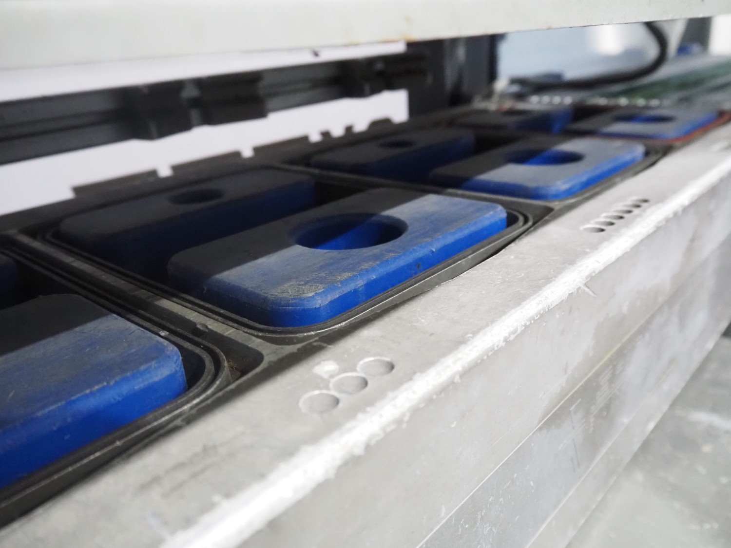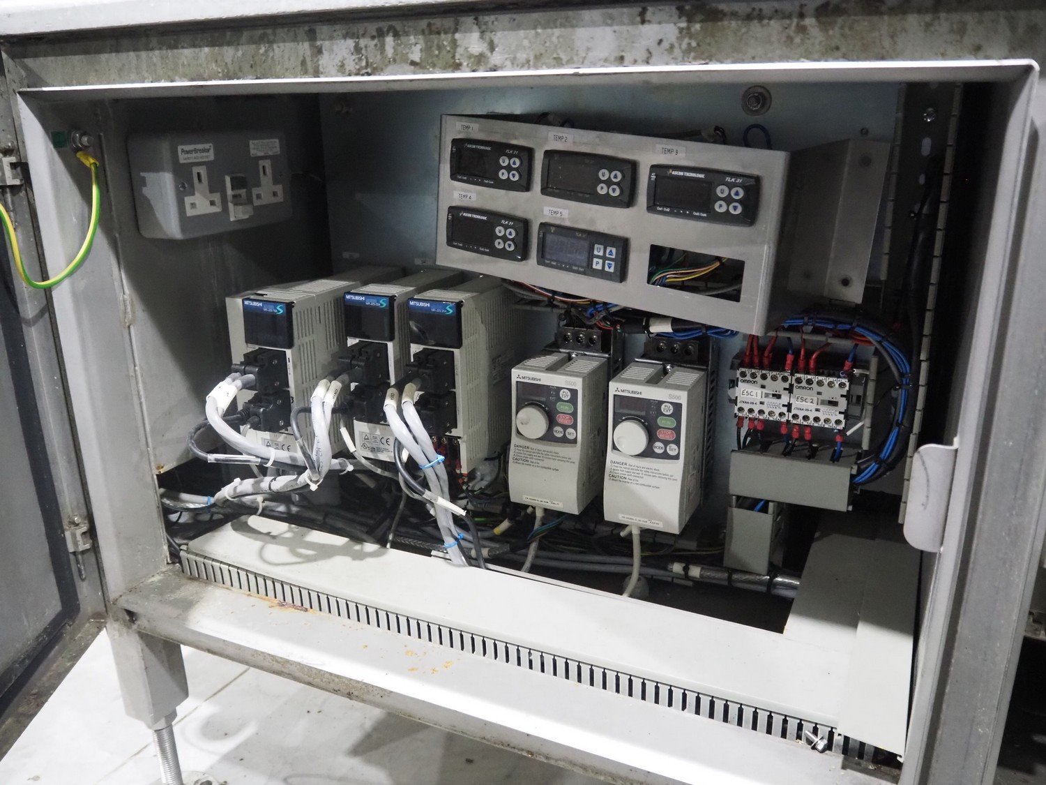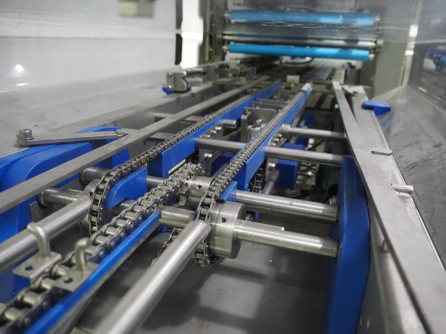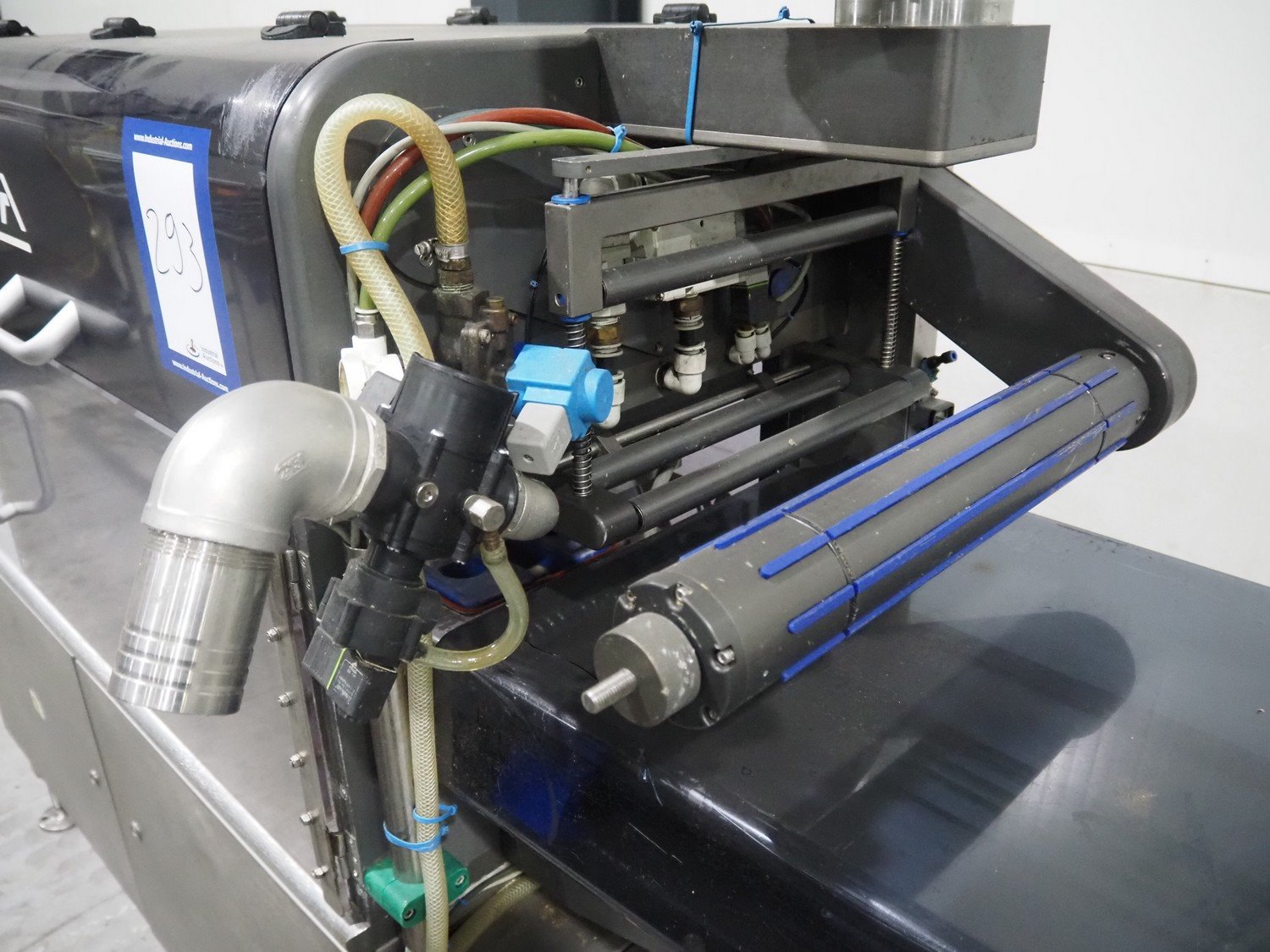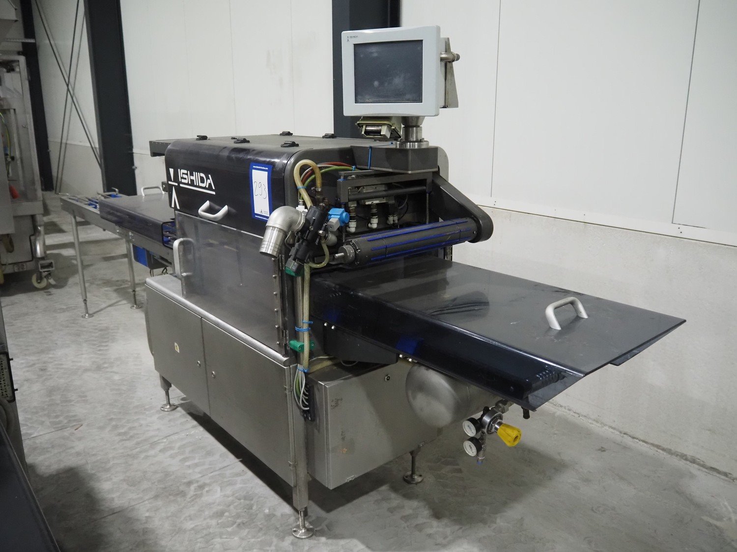 Ishida traysealer, model: QX775, s/s chain conveyor with dividers, distance between dividers: 300 mm, dimensions dye: (4x) 180 mm x 280 mm, total dimensions: 4750 mm x 800 mm x 1820 mm. Kavel locatie: Langereijt 29A, 5091 JP Middelbeers, Nederland