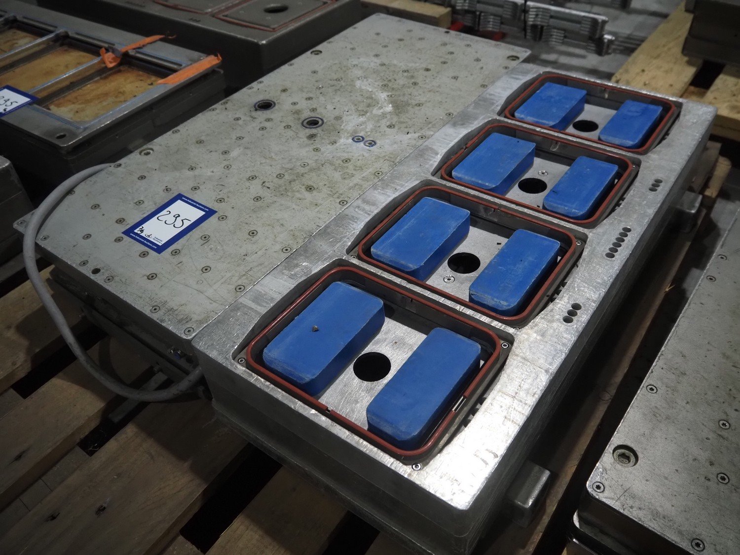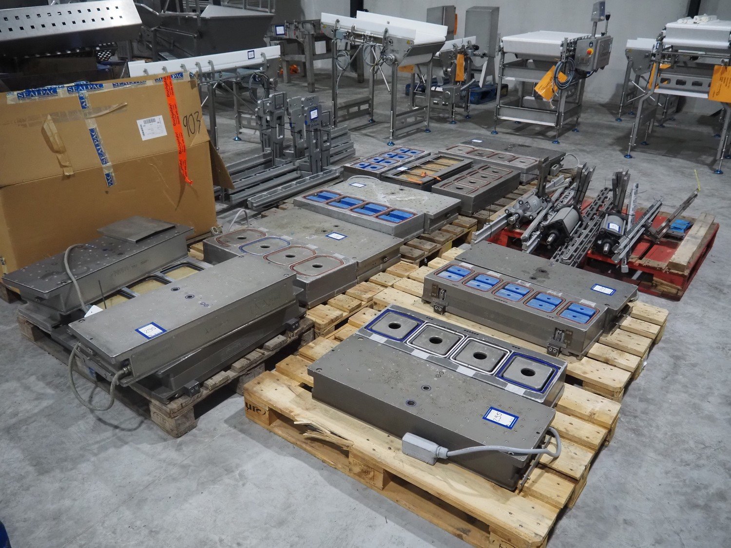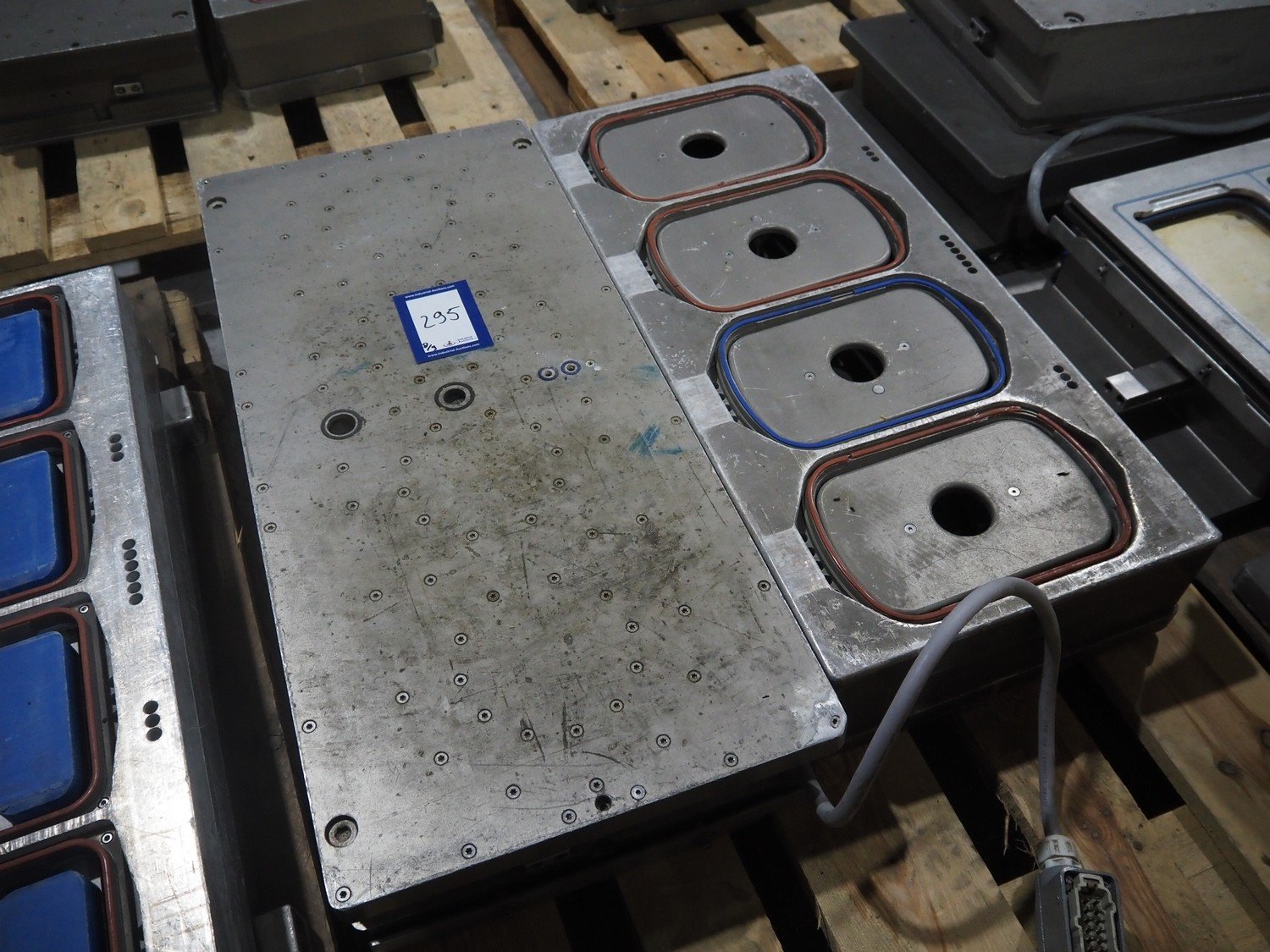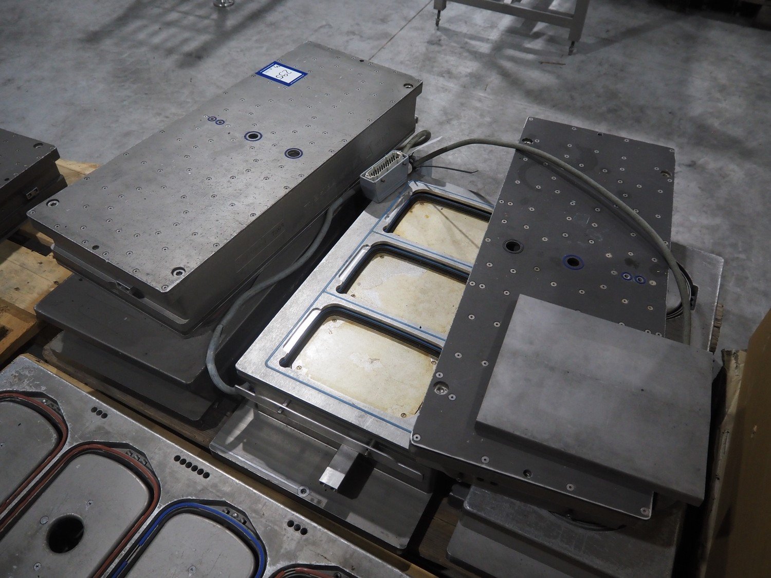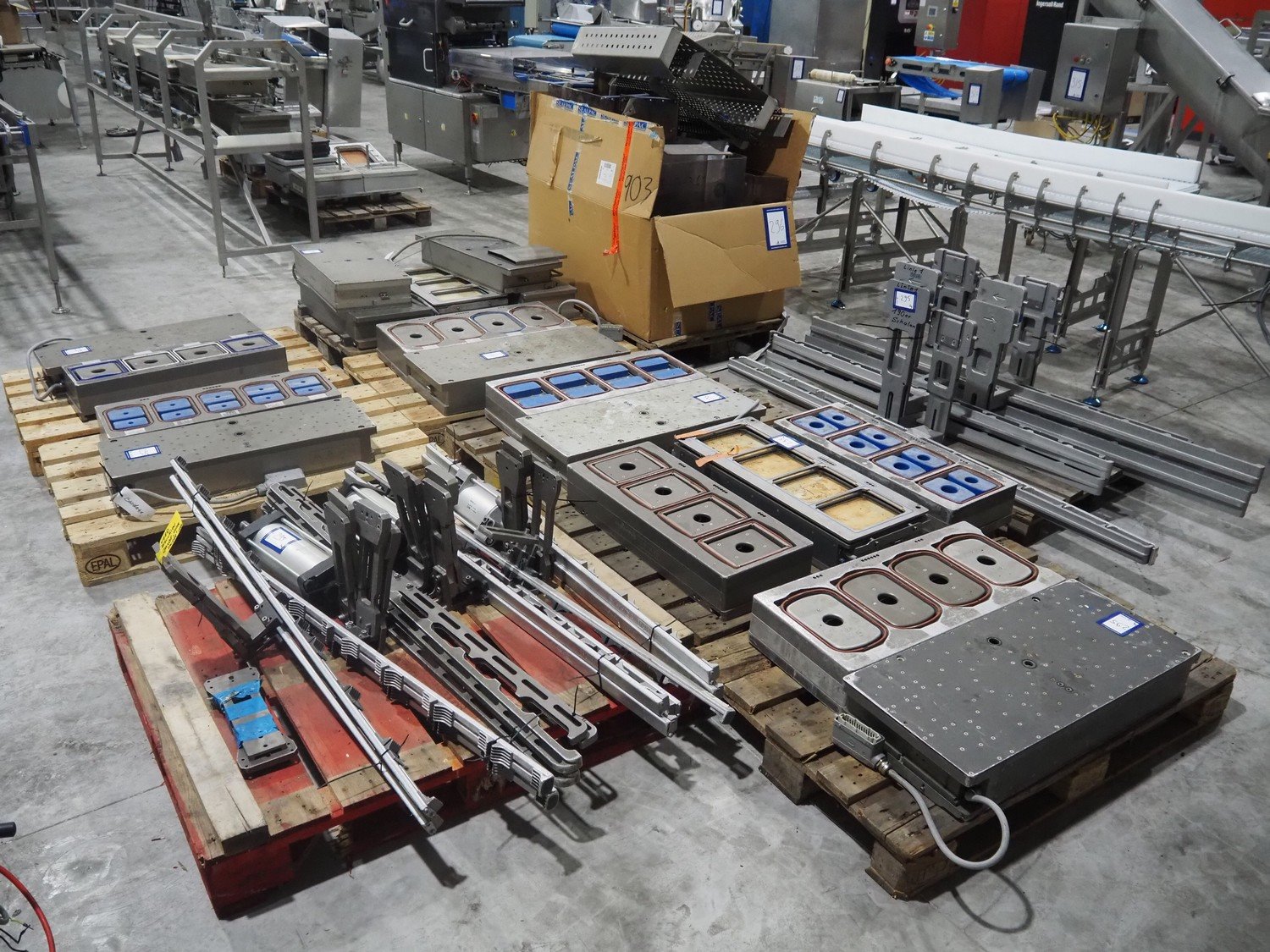 8 pallets with dyes for Ishida traysealer, dimensions: (4x) 210 mm x 160 mm, (4x) 245 mm x 155 mm, (4x) 205 mm x 165 mm, (4x) 200 mm x 160 mm, (5x) 170 mm x 120 mm, (4x) 165 mm x 165 mm, (4x) 245 mm x 160 mm, (3x) Ø 180 mm, (3x) 280 mm x 190 mm, (3x) 230 mm x 150 mm. Including pallet with grippers. Kavel locatie: Langereijt 29A, 5091 JP Middelbeers, Nederland