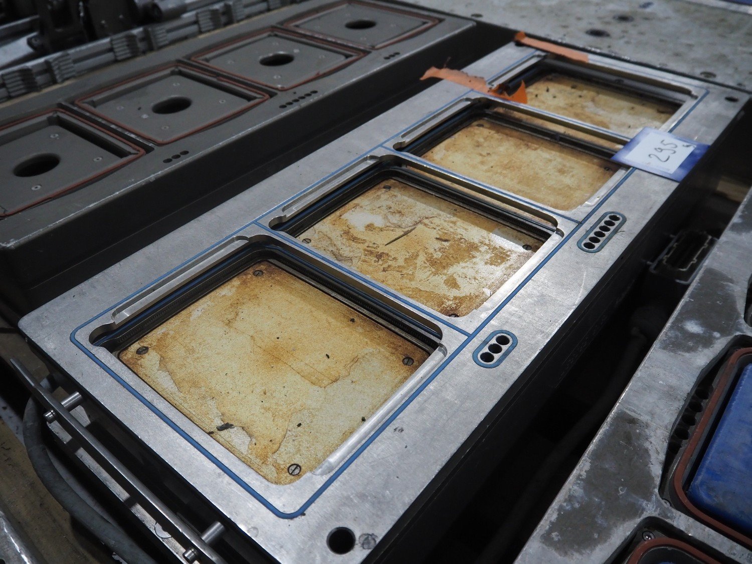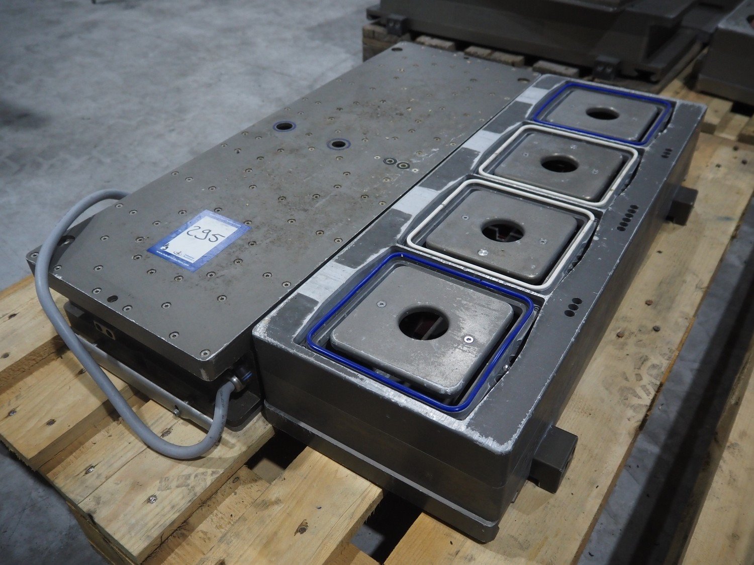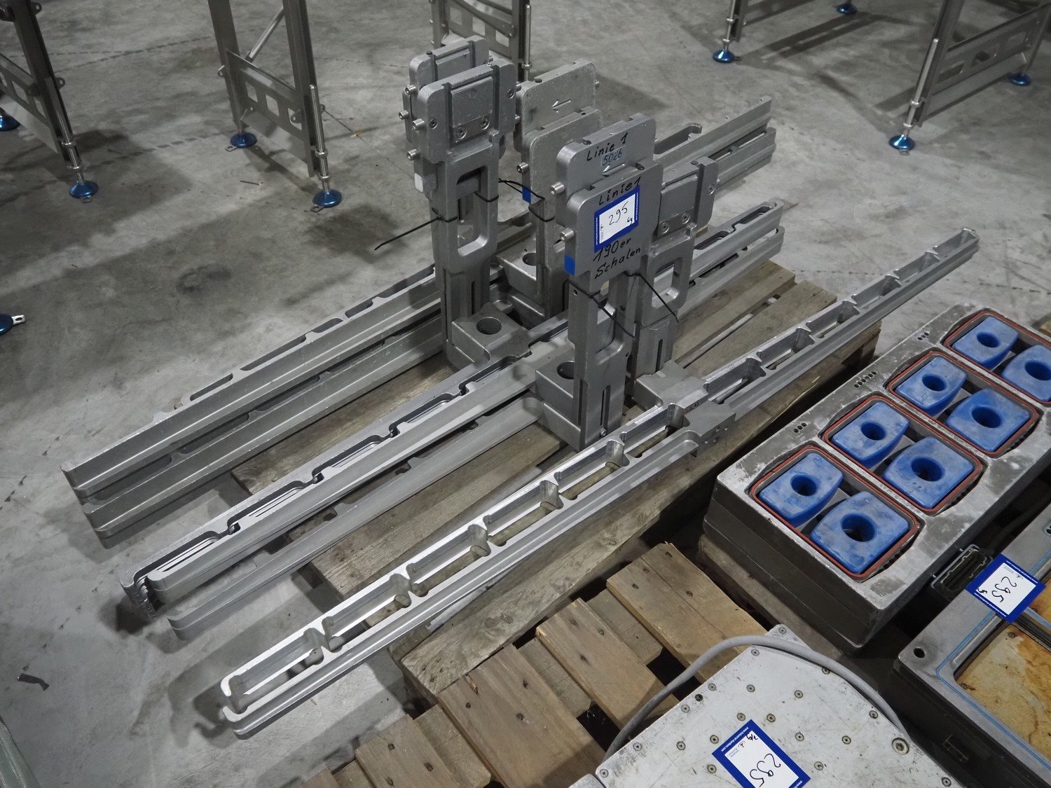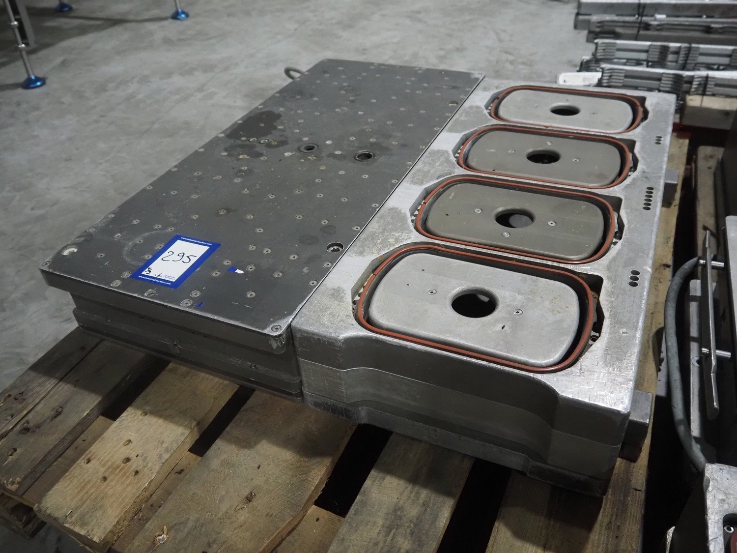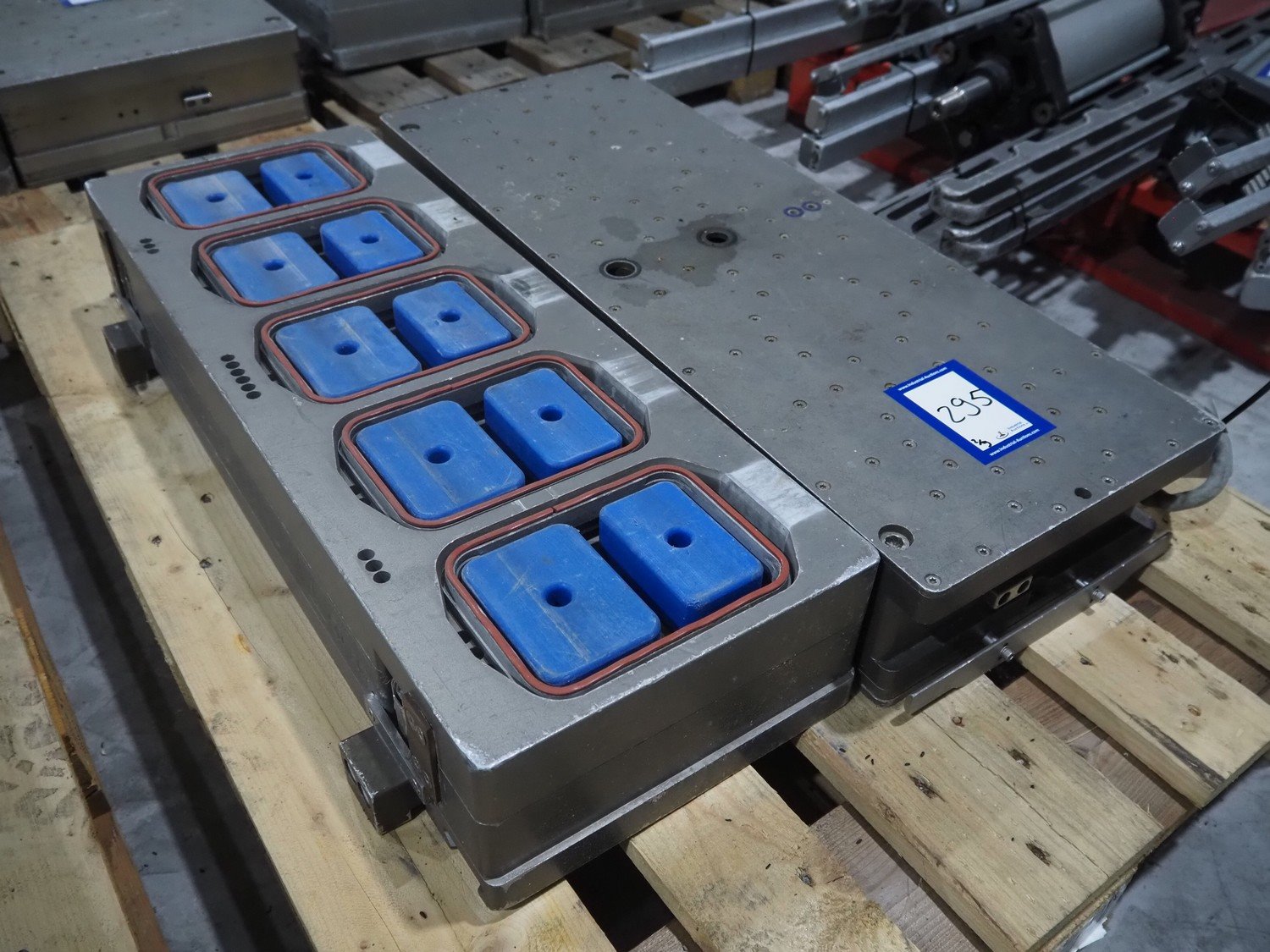 8 pallets with dyes for Ishida traysealer, dimensions: (4x) 210 mm x 160 mm, (4x) 245 mm x 155 mm, (4x) 205 mm x 165 mm, (4x) 200 mm x 160 mm, (5x) 170 mm x 120 mm, (4x) 165 mm x 165 mm, (4x) 245 mm x 160 mm, (3x) Ø 180 mm, (3x) 280 mm x 190 mm, (3x) 230 mm x 150 mm. Including pallet with grippers. Kavel locatie: Langereijt 29A, 5091 JP Middelbeers, Nederland