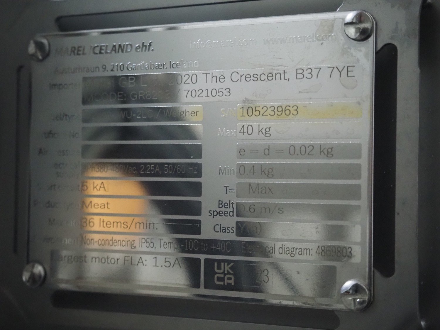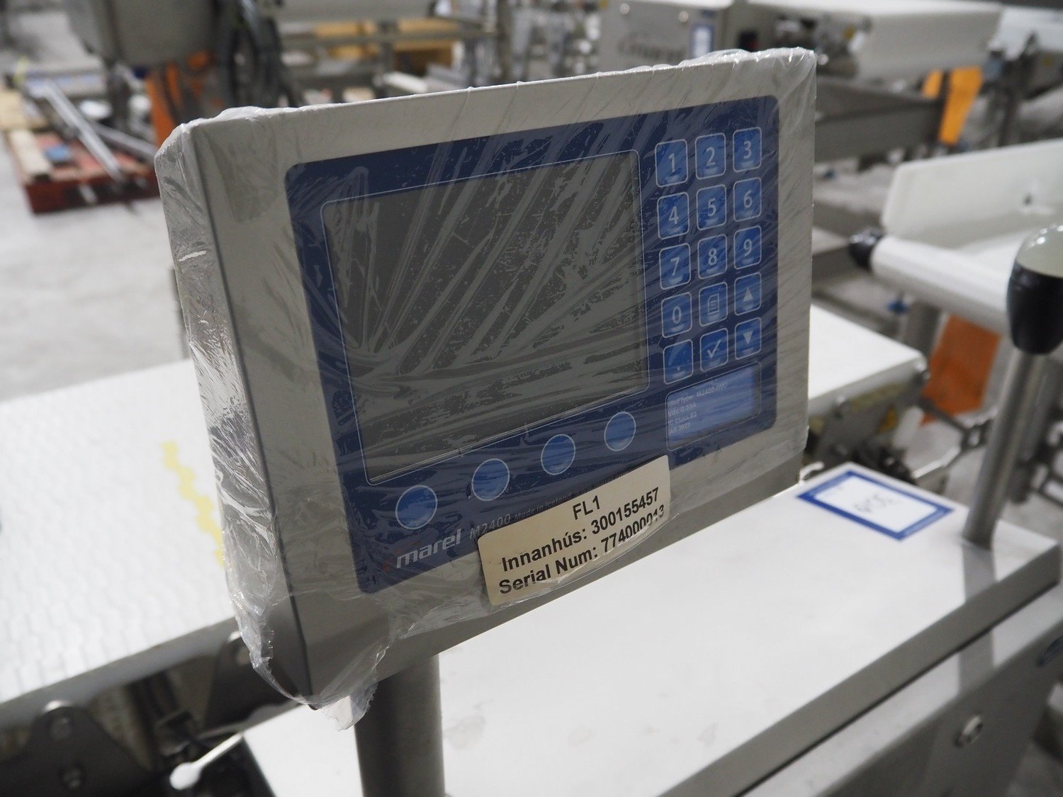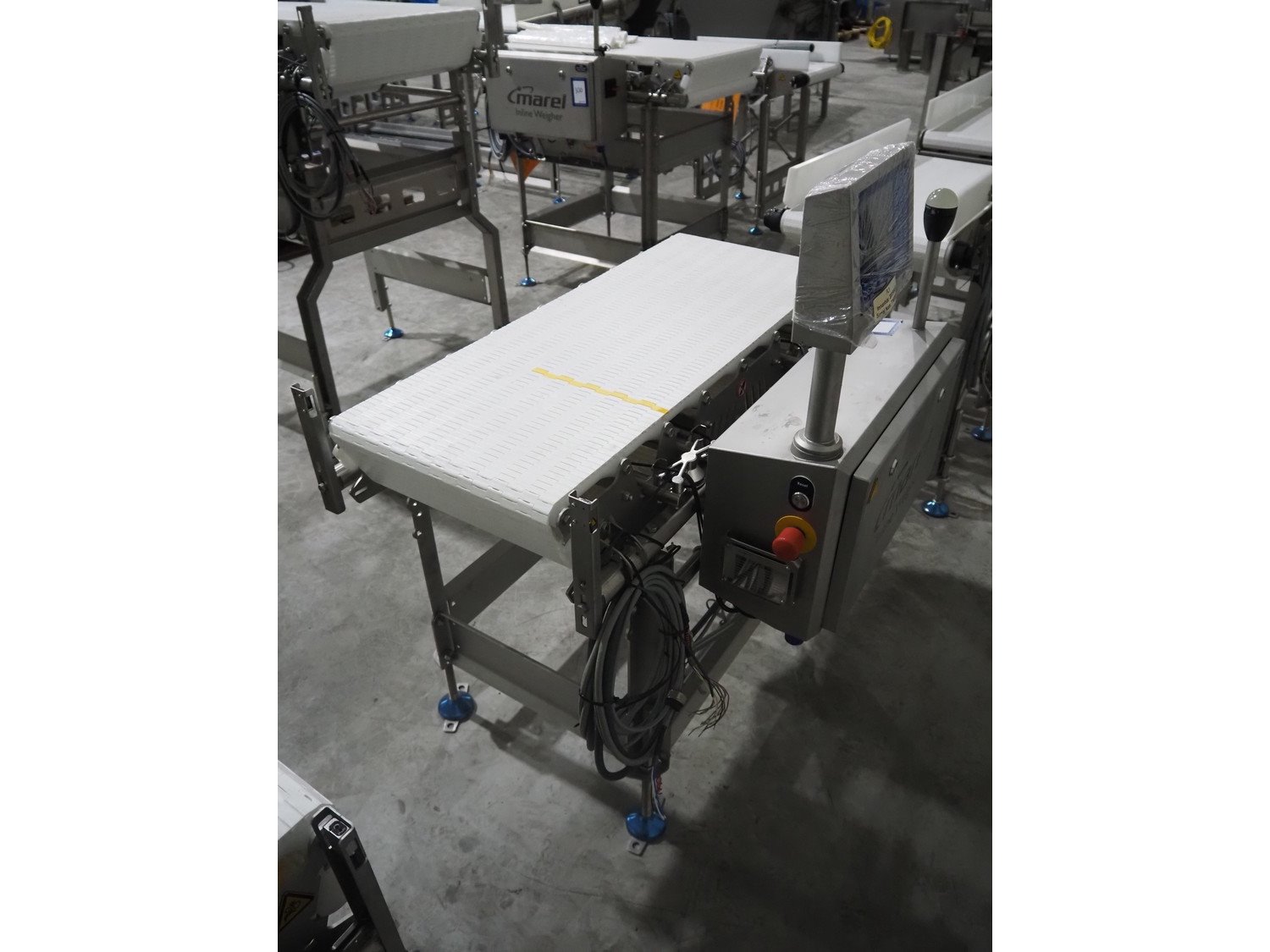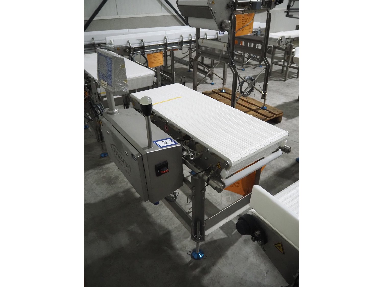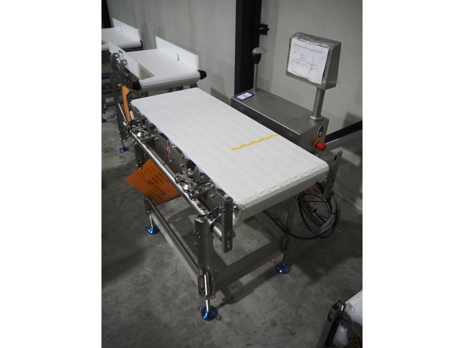 Marel inline weigher, model: M2400-IWU-2LC, serial number: 10523963, year of construction: 2023, max: 40 Kg, min: 0.4 Kg, e=d=0.02 Kg, plastic belt, belt width: 405 mm, total dimensions: 1050 mm x 800 mm x 1230 mm. Kavel locatie: Langereijt 29A, 5091 JP Middelbeers, Nederland