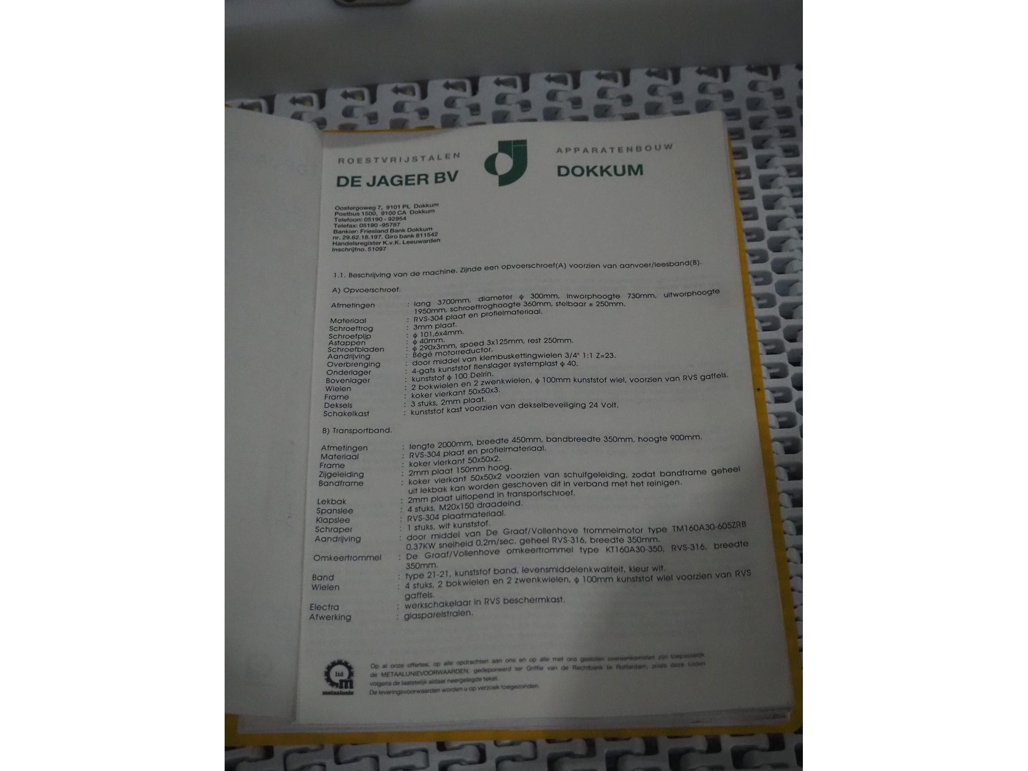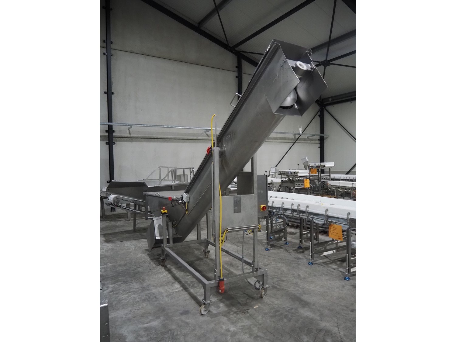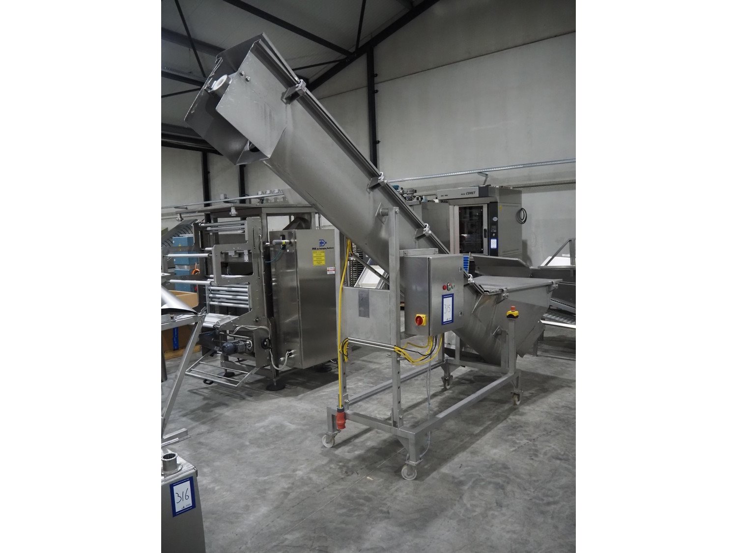 Roestvrijstalen-Apparatenbouw De Jager BV mobile elevating screw, number: 689.010, year of construction: March 1995, s/s screw, diameter screw: 250 mm, tier: 140 mm, elevating height: 2100 mm, total dimensions: 3800 mm x 1100 mm x 2600 mm. Kavel locatie: Langereijt 29A, 5091 JP Middelbeers, Nederland