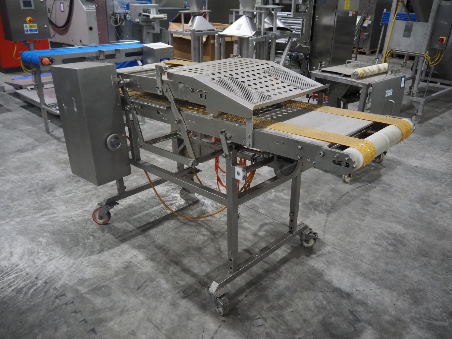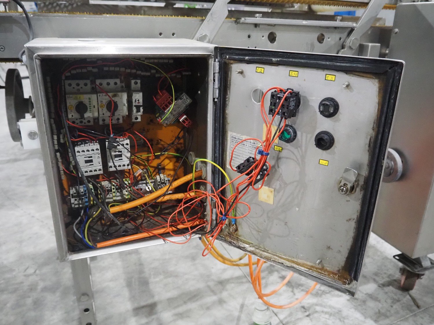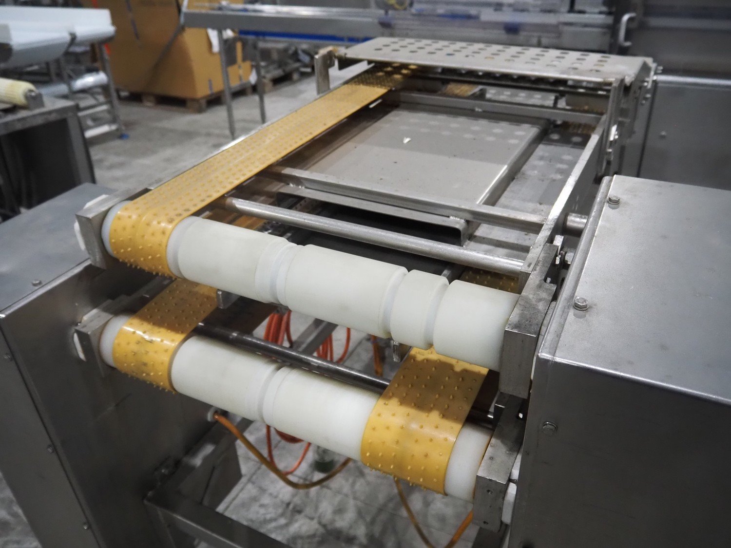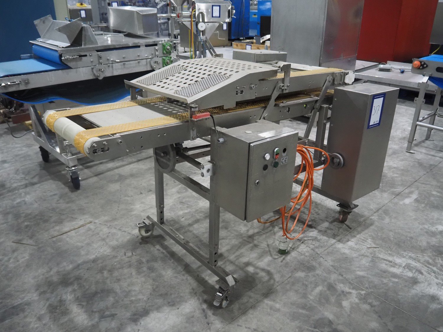 Maja Maschinenfabrik mobile slicer for cordon blue, type: FS 90-540-2, serial number: H0143, year of construction: 2000, 400 V, 3 Ph, 50 Hz, 2.4 A, 1.3 kW, plastic belt, belt width: (2x) 100 mm, total dimensions: 1800 mm x 1100 mm x 1150 mm. Missing knives and one of the belts is missing. Kavel locatie: Langereijt 29A, 5091 JP Middelbeers, Nederland