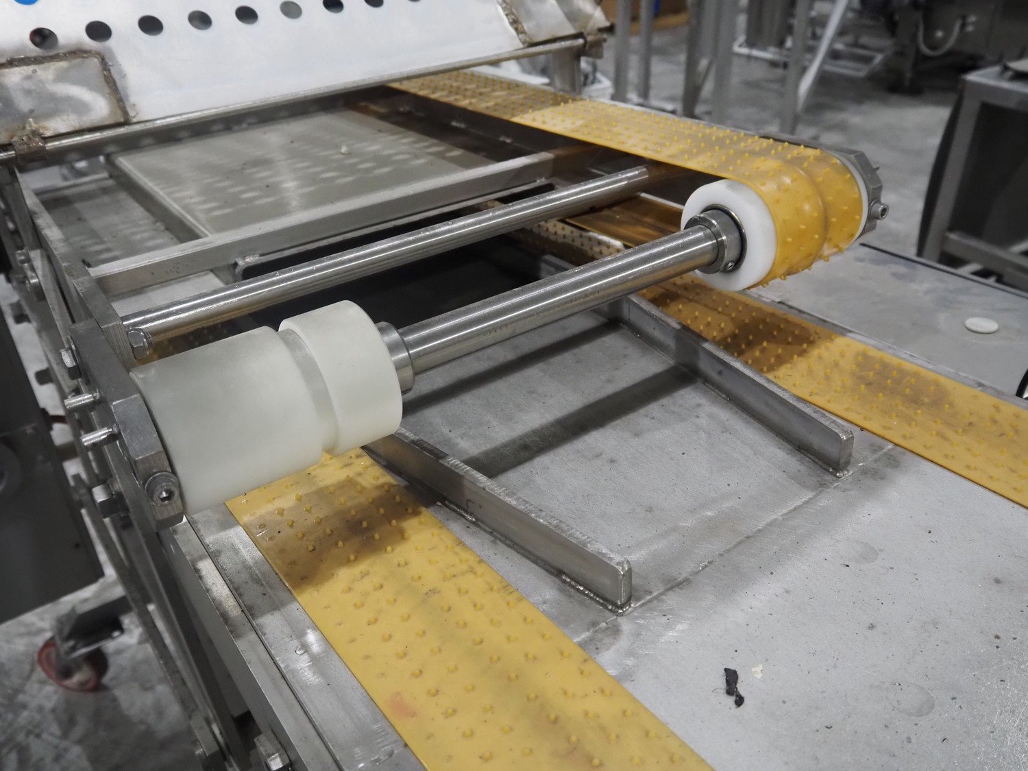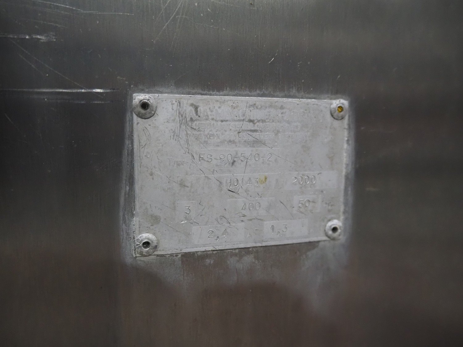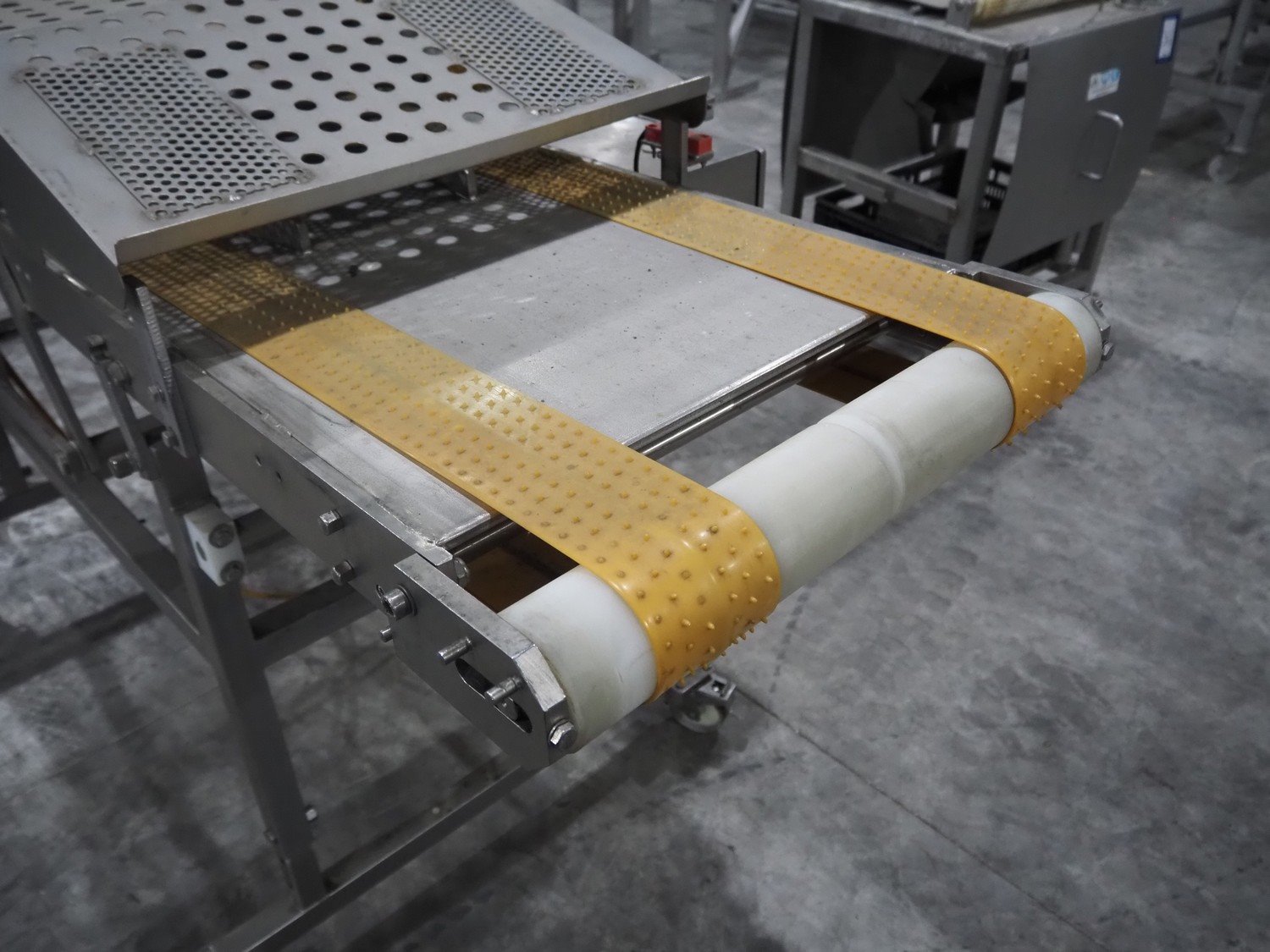 Maja Maschinenfabrik mobile slicer for cordon blue, type: FS 90-540-2, serial number: H0143, year of construction: 2000, 400 V, 3 Ph, 50 Hz, 2.4 A, 1.3 kW, plastic belt, belt width: (2x) 100 mm, total dimensions: 1800 mm x 1100 mm x 1150 mm. Missing knives and one of the belts is missing. Kavel locatie: Langereijt 29A, 5091 JP Middelbeers, Nederland