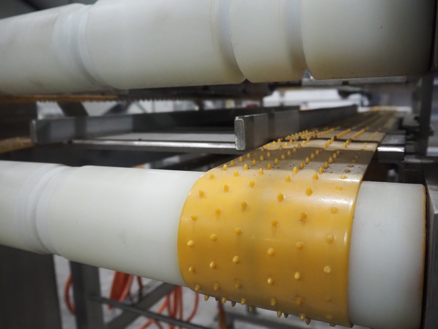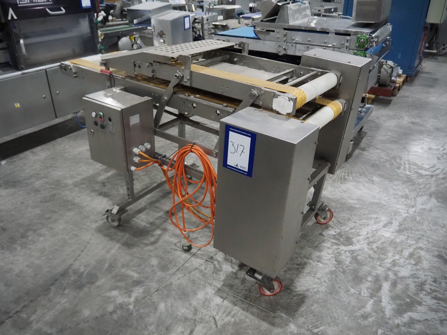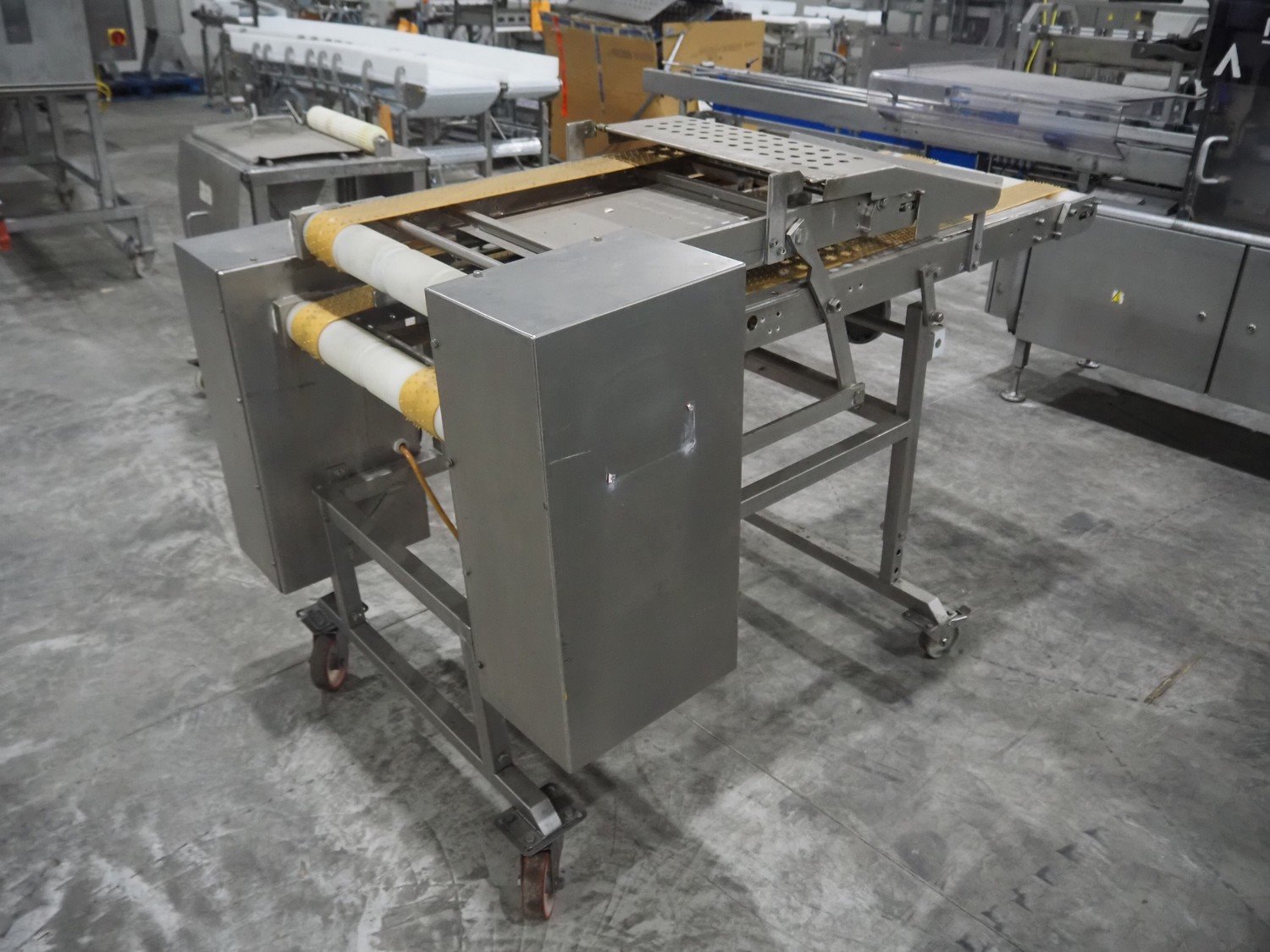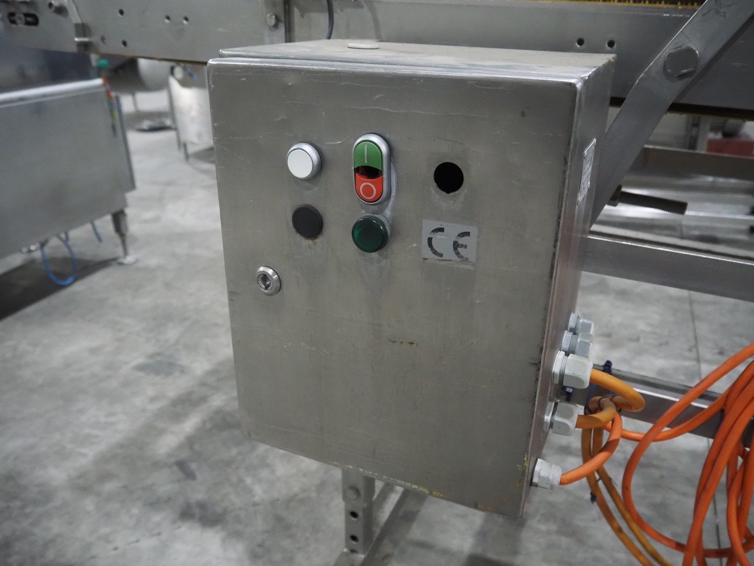 Maja Maschinenfabrik mobile slicer for cordon blue, type: FS 90-540-2, serial number: H0143, year of construction: 2000, 400 V, 3 Ph, 50 Hz, 2.4 A, 1.3 kW, plastic belt, belt width: (2x) 100 mm, total dimensions: 1800 mm x 1100 mm x 1150 mm. Missing knives and one of the belts is missing. Kavel locatie: Langereijt 29A, 5091 JP Middelbeers, Nederland
