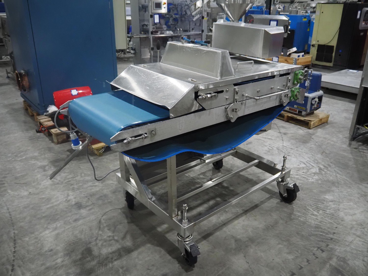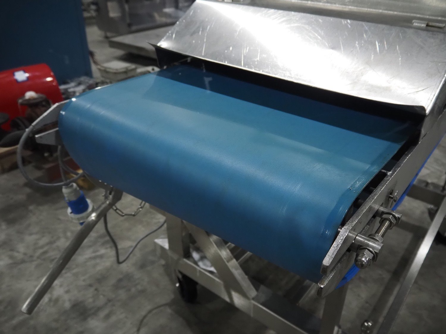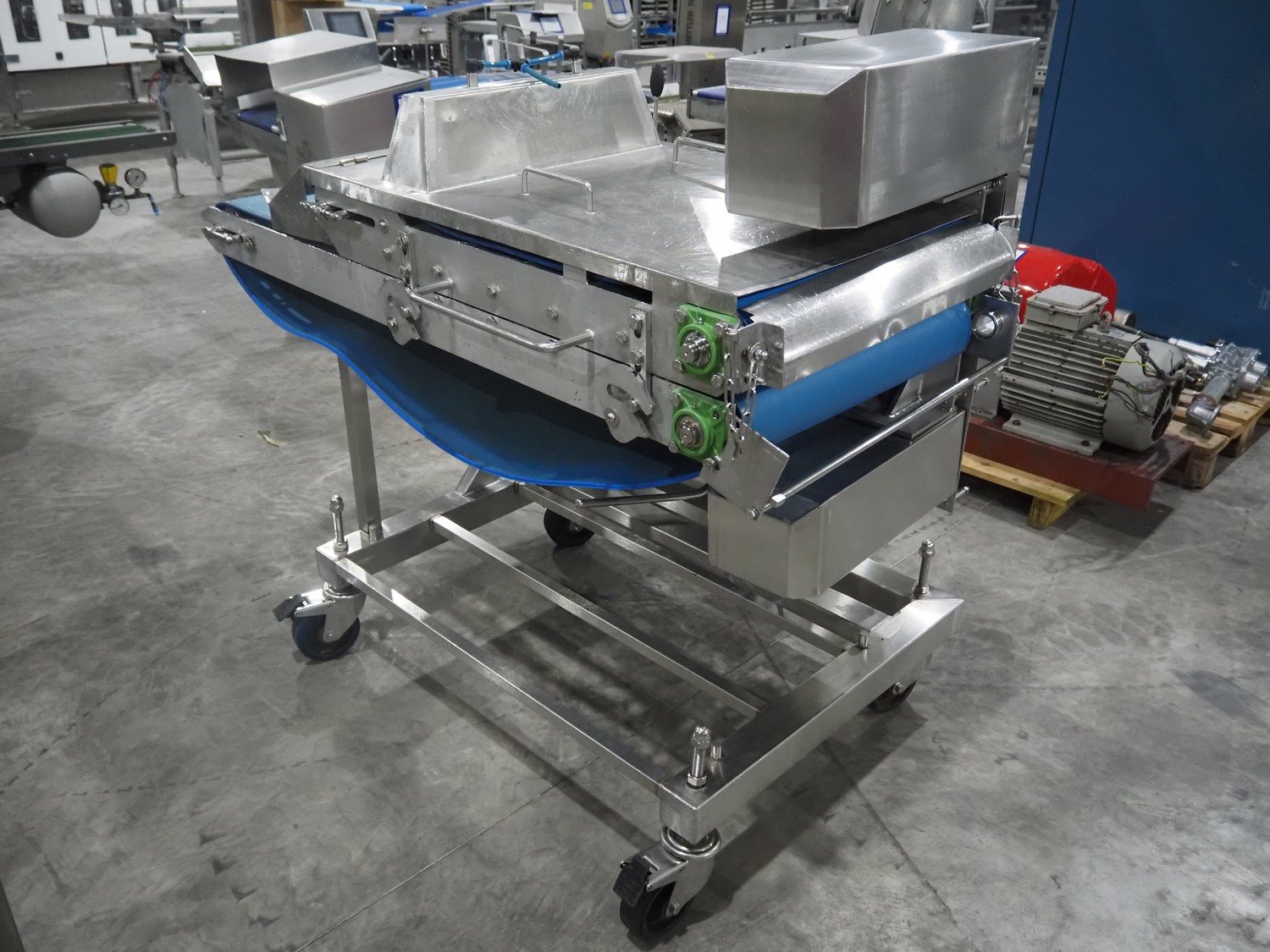 Mobile flattener, plastic belt, belt width: (2x) 600 mm, clearance: 600 mm x 40 mm, total dimensions: 1850 mm x 1200 mm x 1400 mm. Kavel locatie: Langereijt 29A, 5091 JP Middelbeers, Nederland
