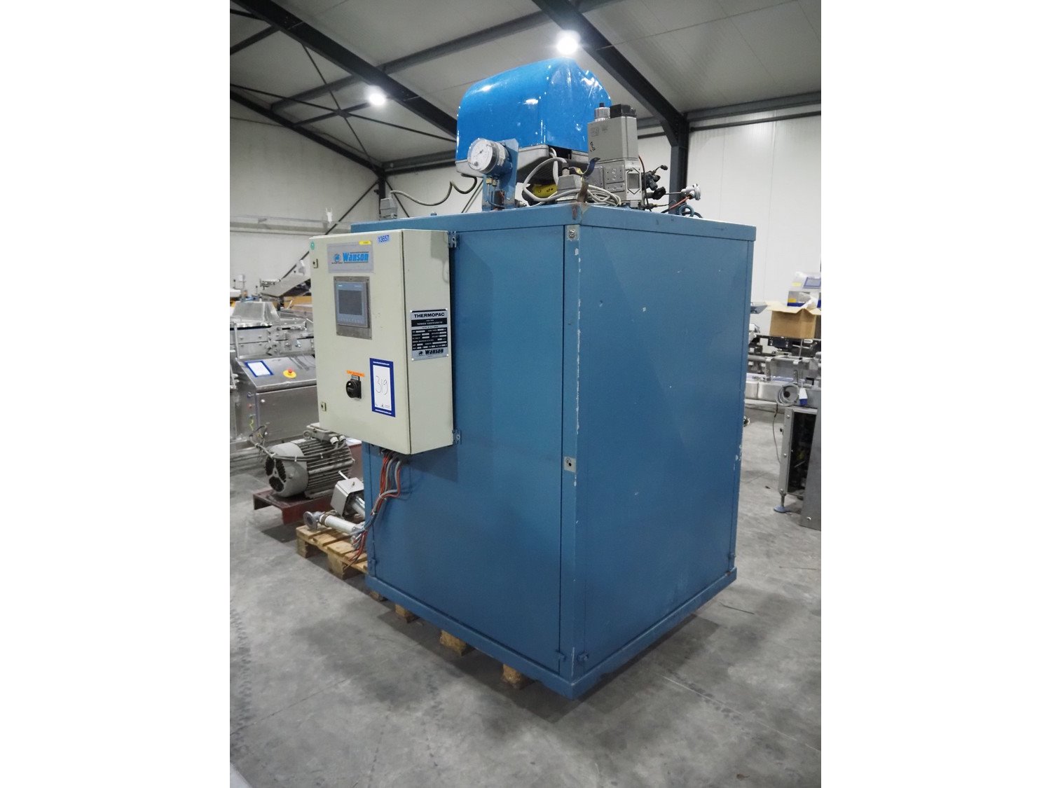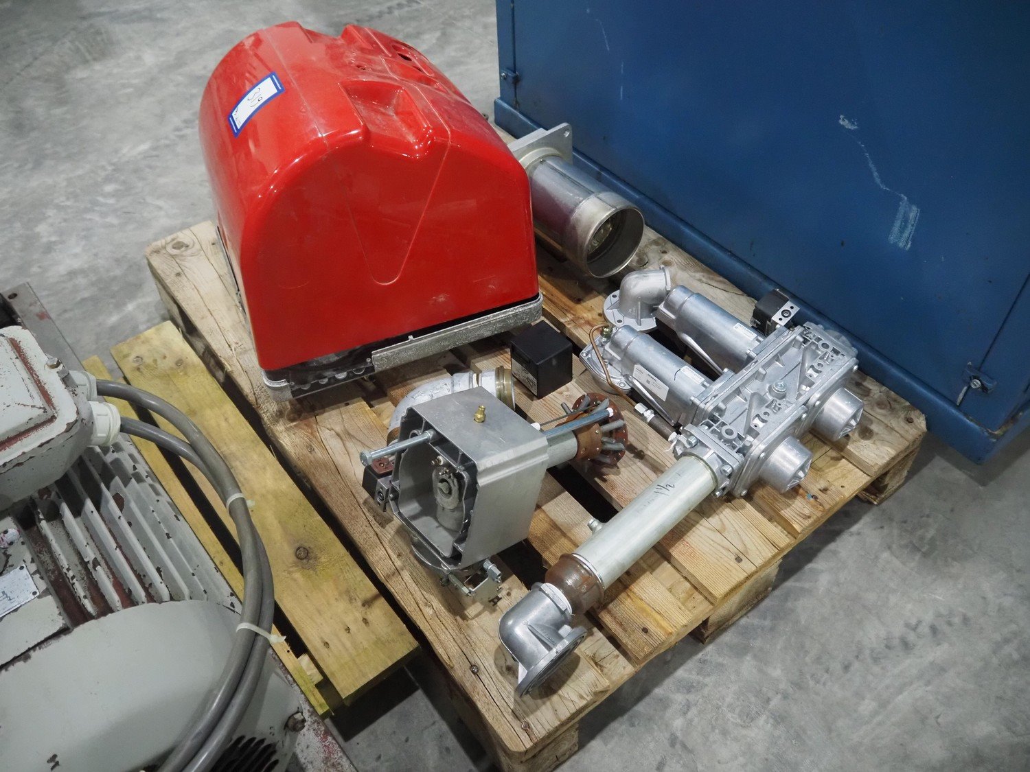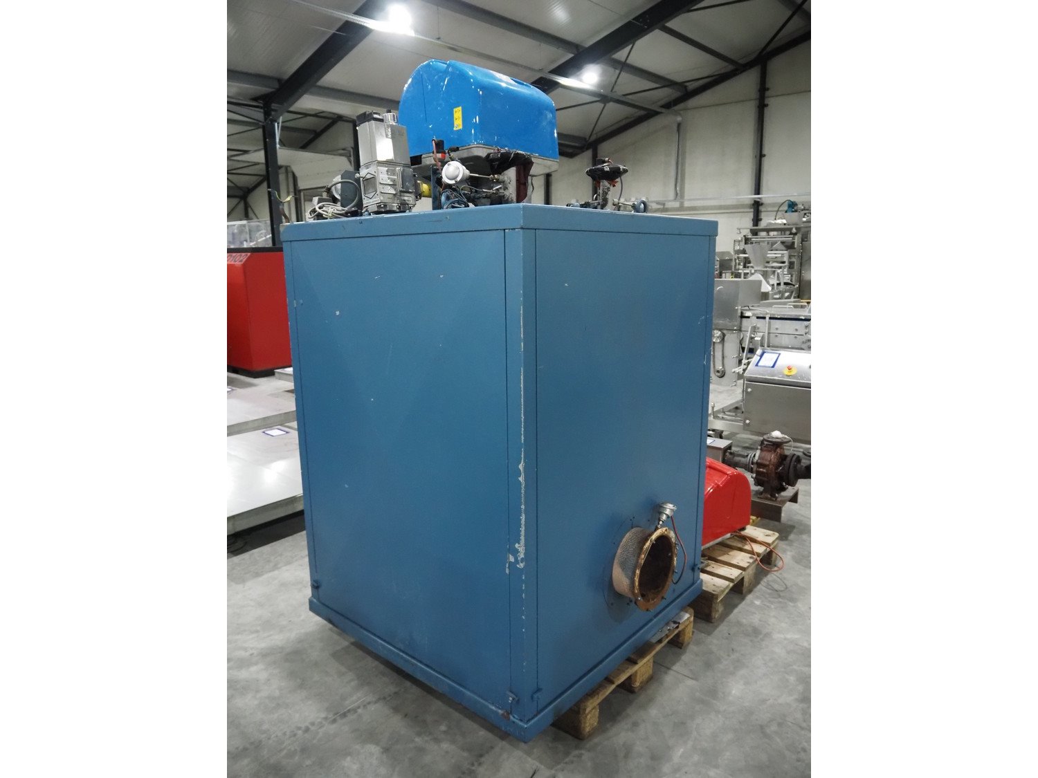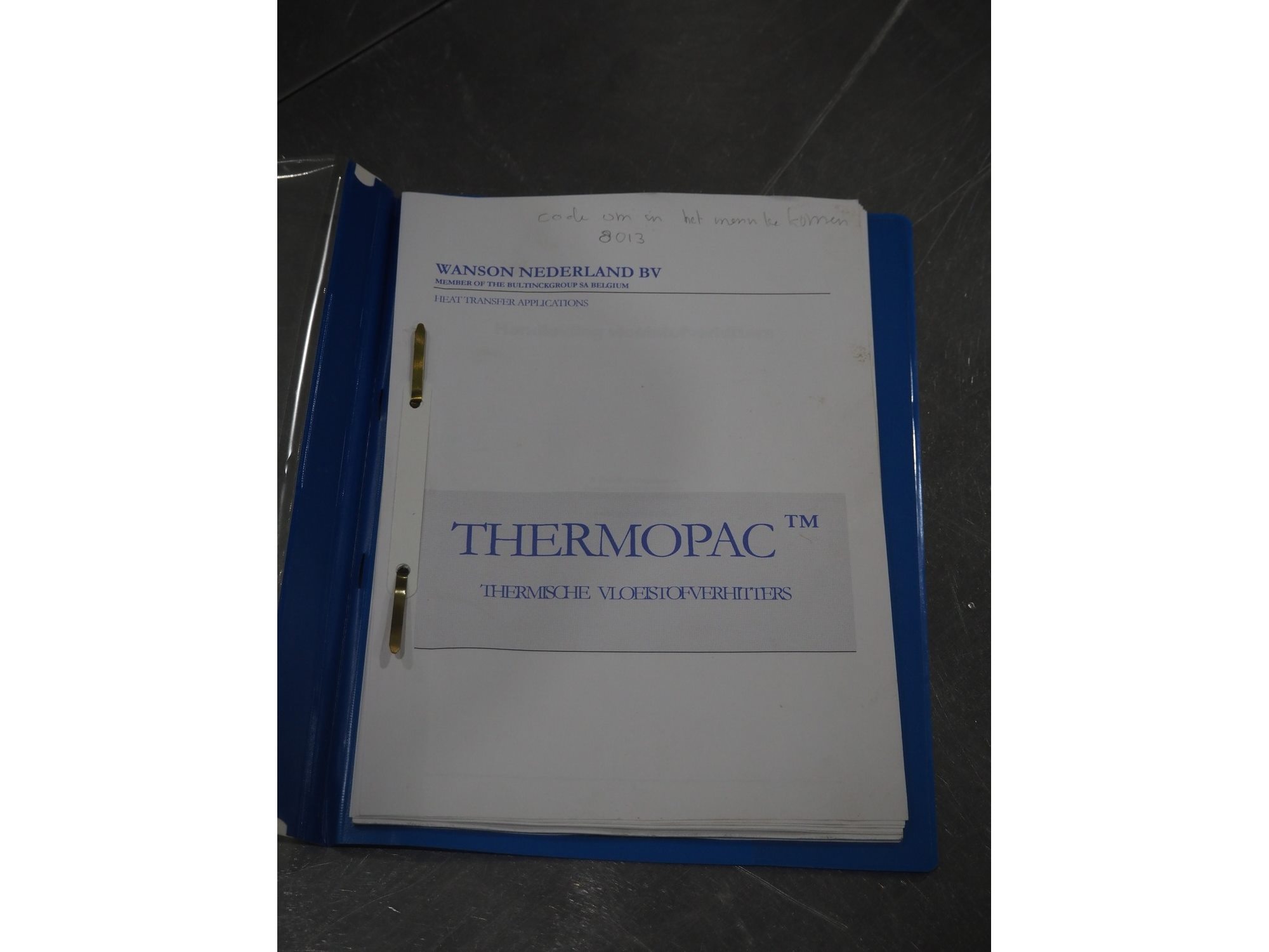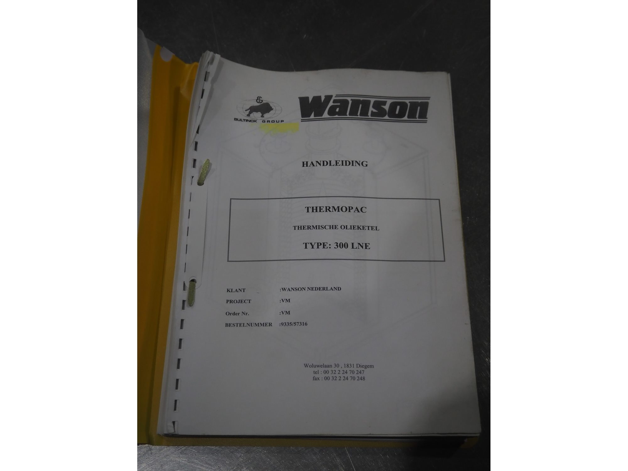 Thermopac Wanson thermic fluid heater, type: 300 LNE, year of construction: 1999, gas heated, 380 V, 3 Ph, capacity: 349 kW, dimensions: 1550 mm x 1200 mm x 2300 mm, rotor pump, type: XF160MK02 810 X, 380 V, 11/15 kW, dimensions: 1450 mm x 370 mm x 520 mm. Including pallet with parts. Kavel locatie: Langereijt 29A, 5091 JP Middelbeers, Nederland