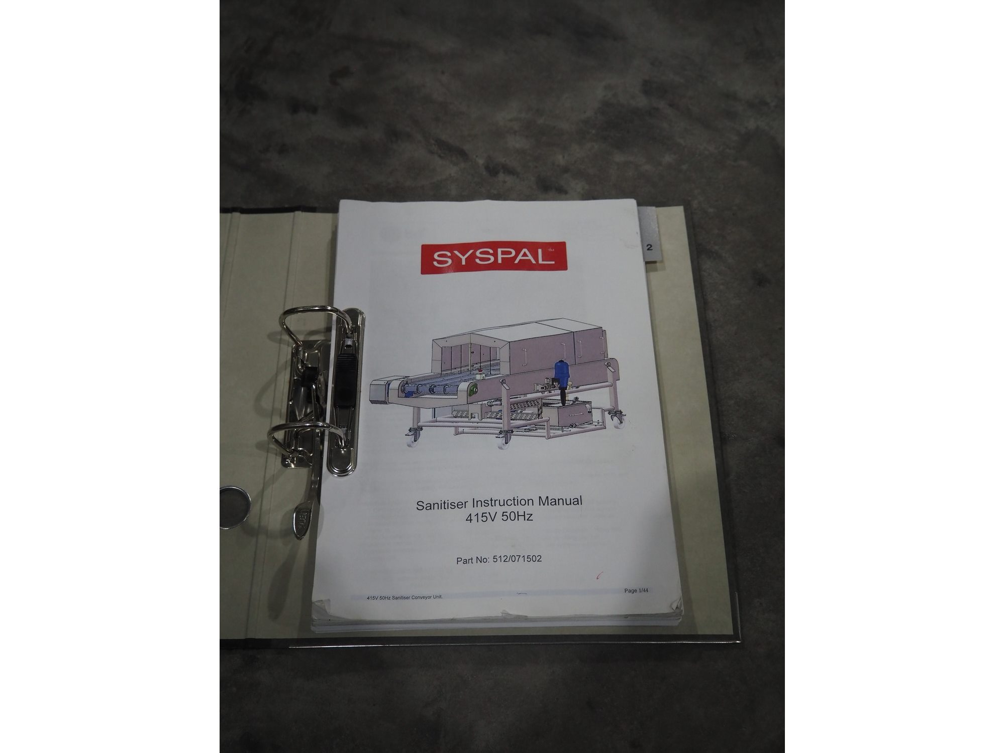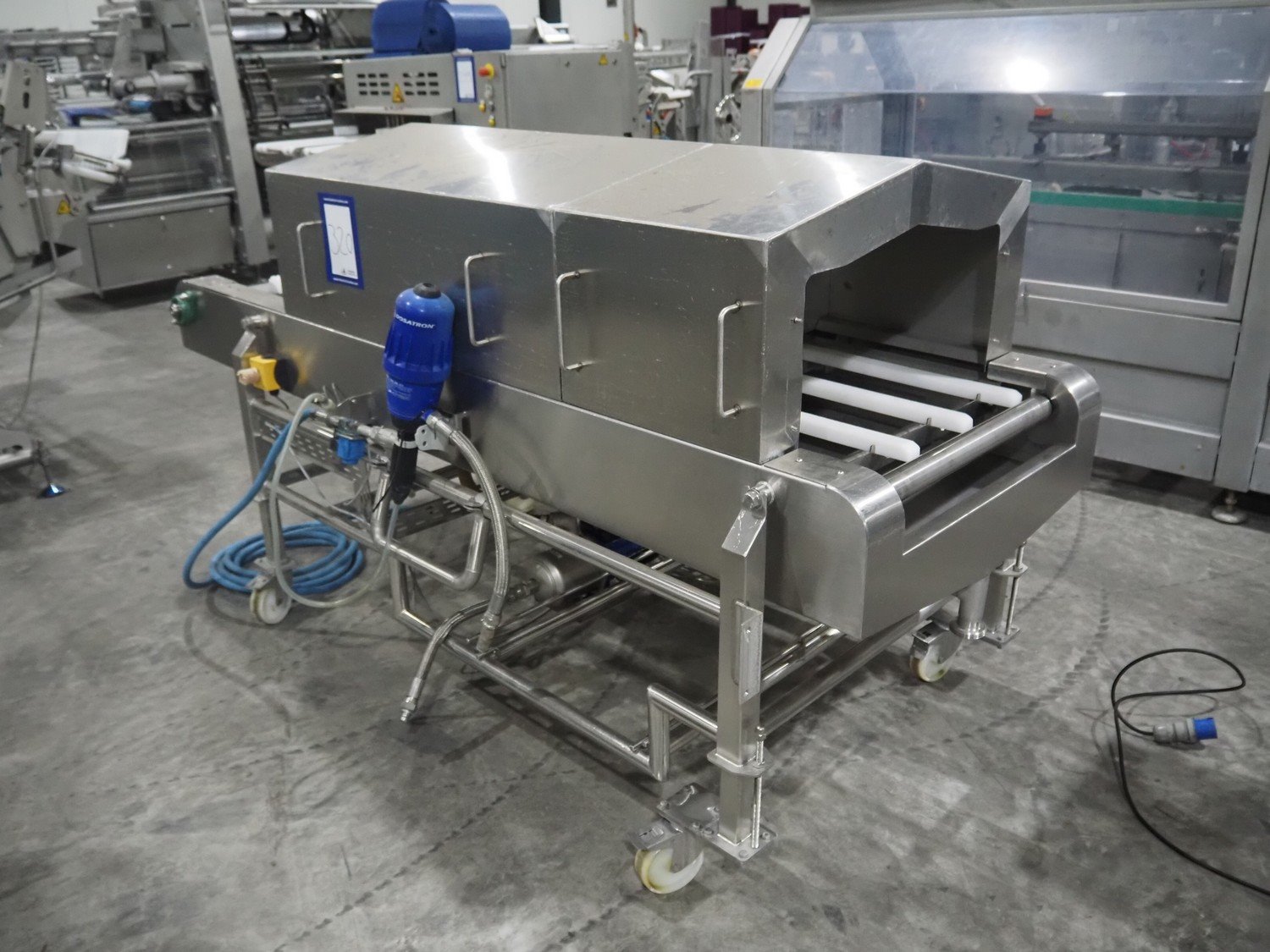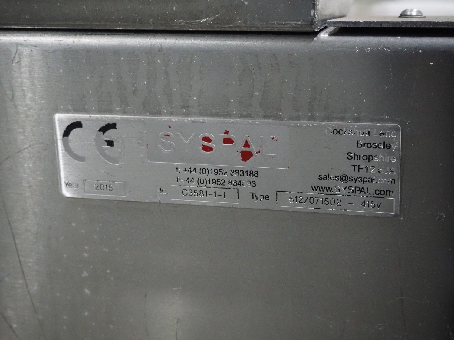 Syspal mobile crate washer, type: 512/071502-415V, number: C3581-1-1, year of construction: 2015, clearance: 610 mm x 300 mm, total dimensions: 2300 mm x 1200 mm x 1300 mm. Belt is missing. Kavel locatie: Langereijt 29A, 5091 JP Middelbeers, Nederland