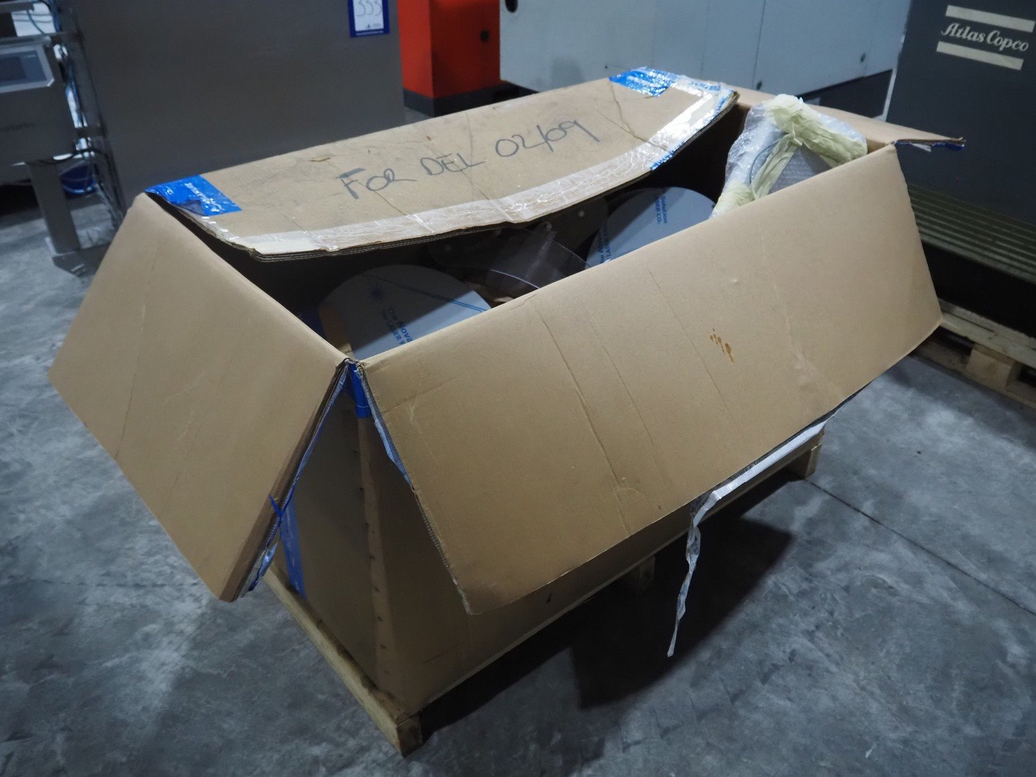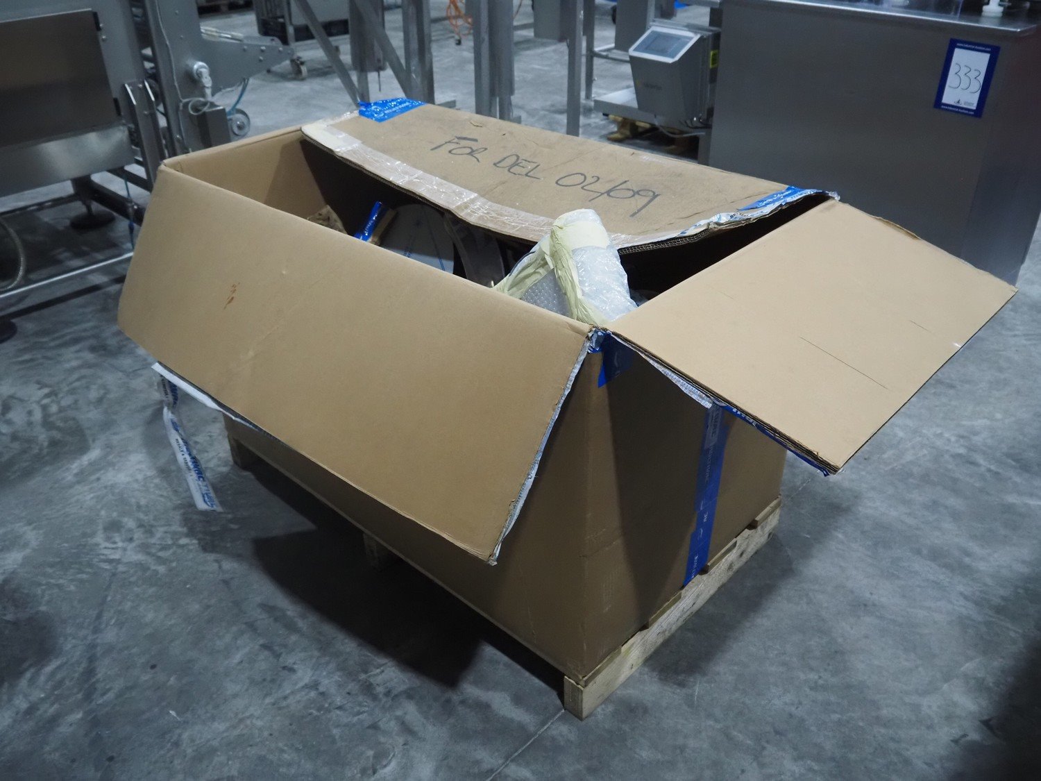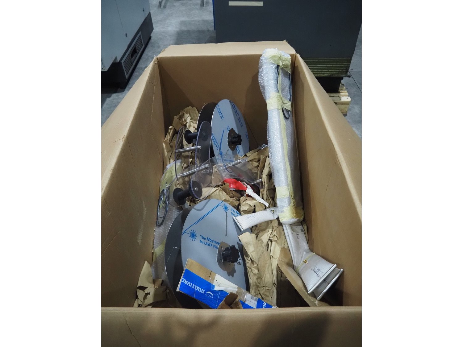 Carton box with Multivac parts for thermoformer, dimensions: 1300 mm x 750 mm x 850 mm. Kavel locatie: Langereijt 29A, 5091 JP Middelbeers, Nederland