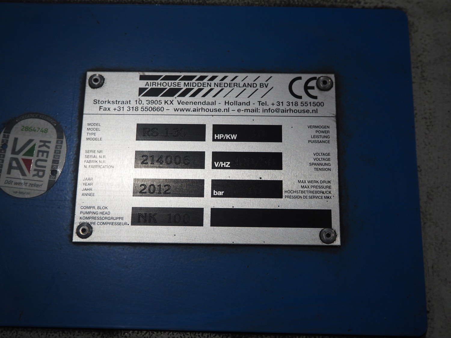 Falcon air compressor, type: RS 130, serial number: 18447, year of construction: 2008, 400 V, 50 Hz, maximum pressure: 10 bar, dimensions: 1300 mm x 900 mm x 1300 mm. Kavel locatie: Langereijt 29A, 5091 JP Middelbeers, Nederland
