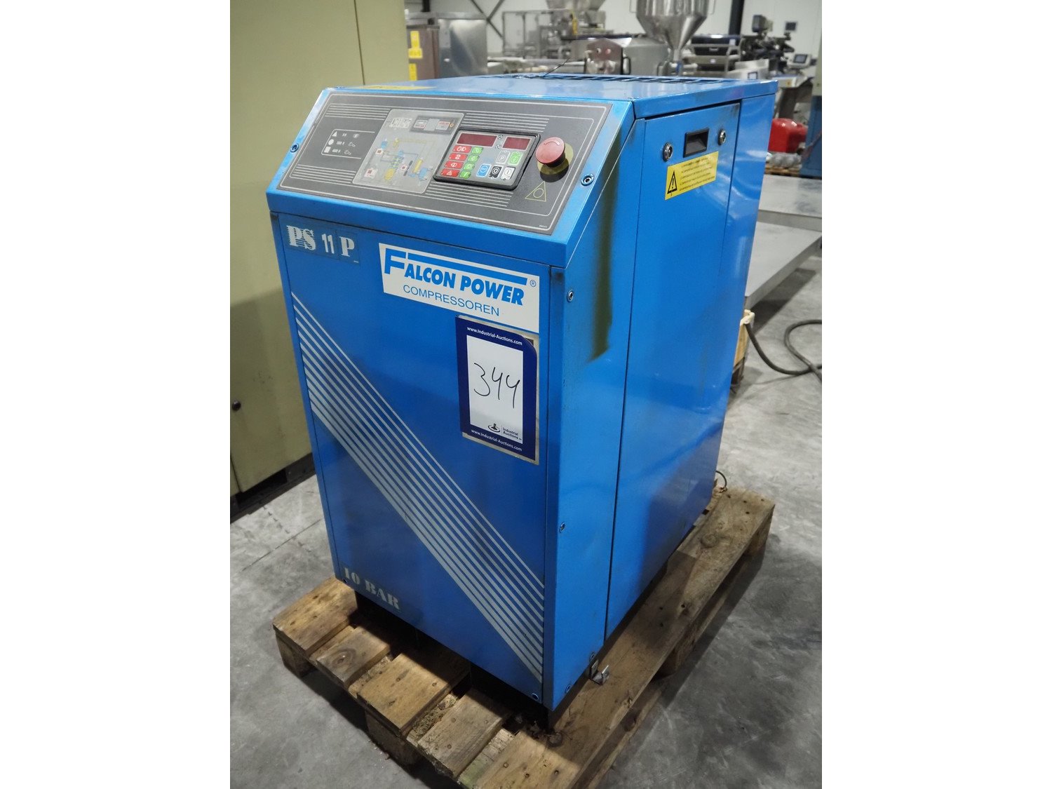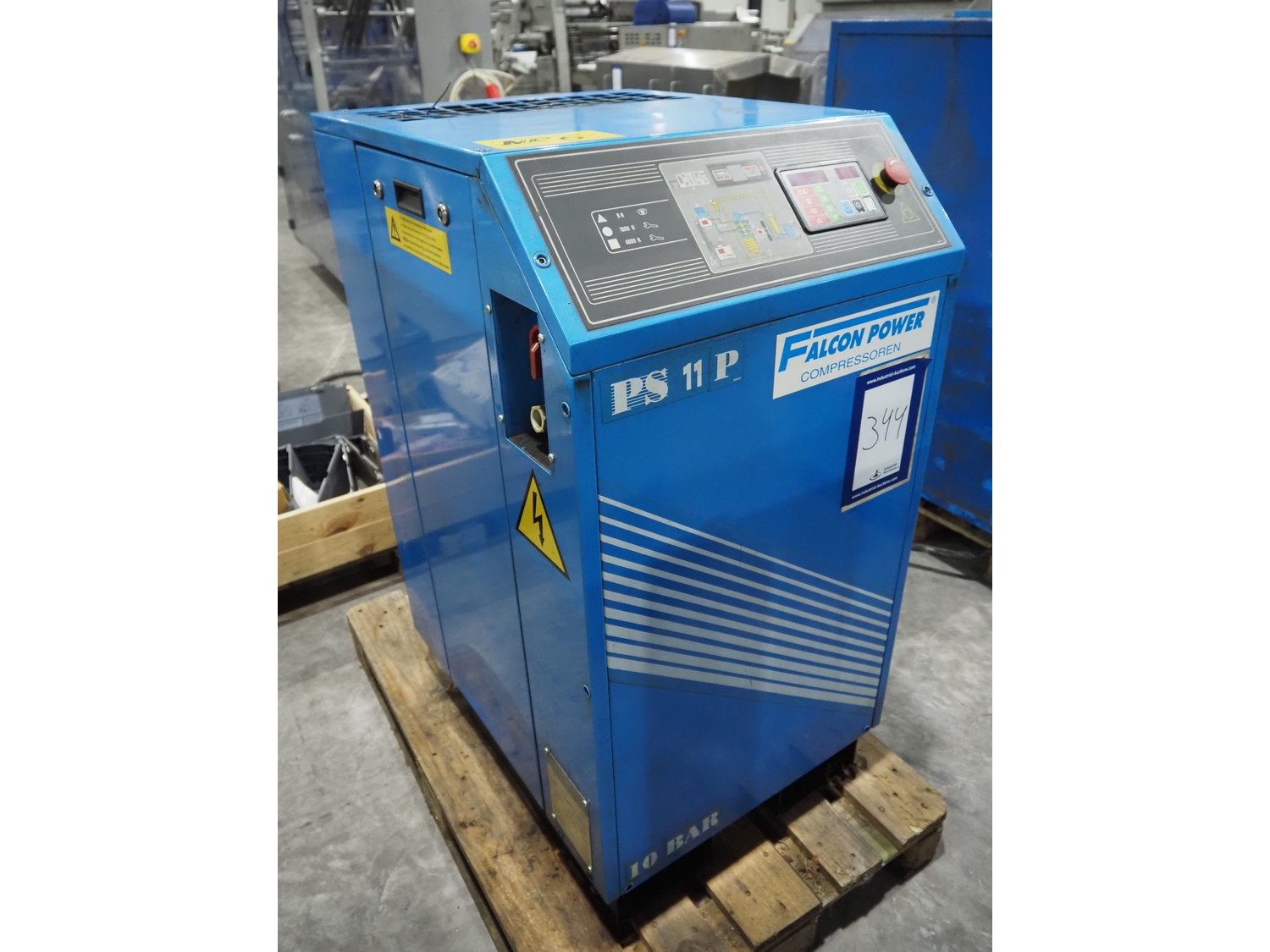 Falcon air compressor, type: PS11P, serial number: 958915, year of construction: 1998, 400 V, 50 Hz, 11 kW, maximum pressure: 10 bar, dimensions: 800 mm x 600 mm x 1150 mm. Kavel locatie: Langereijt 29A, 5091 JP Middelbeers, Nederland