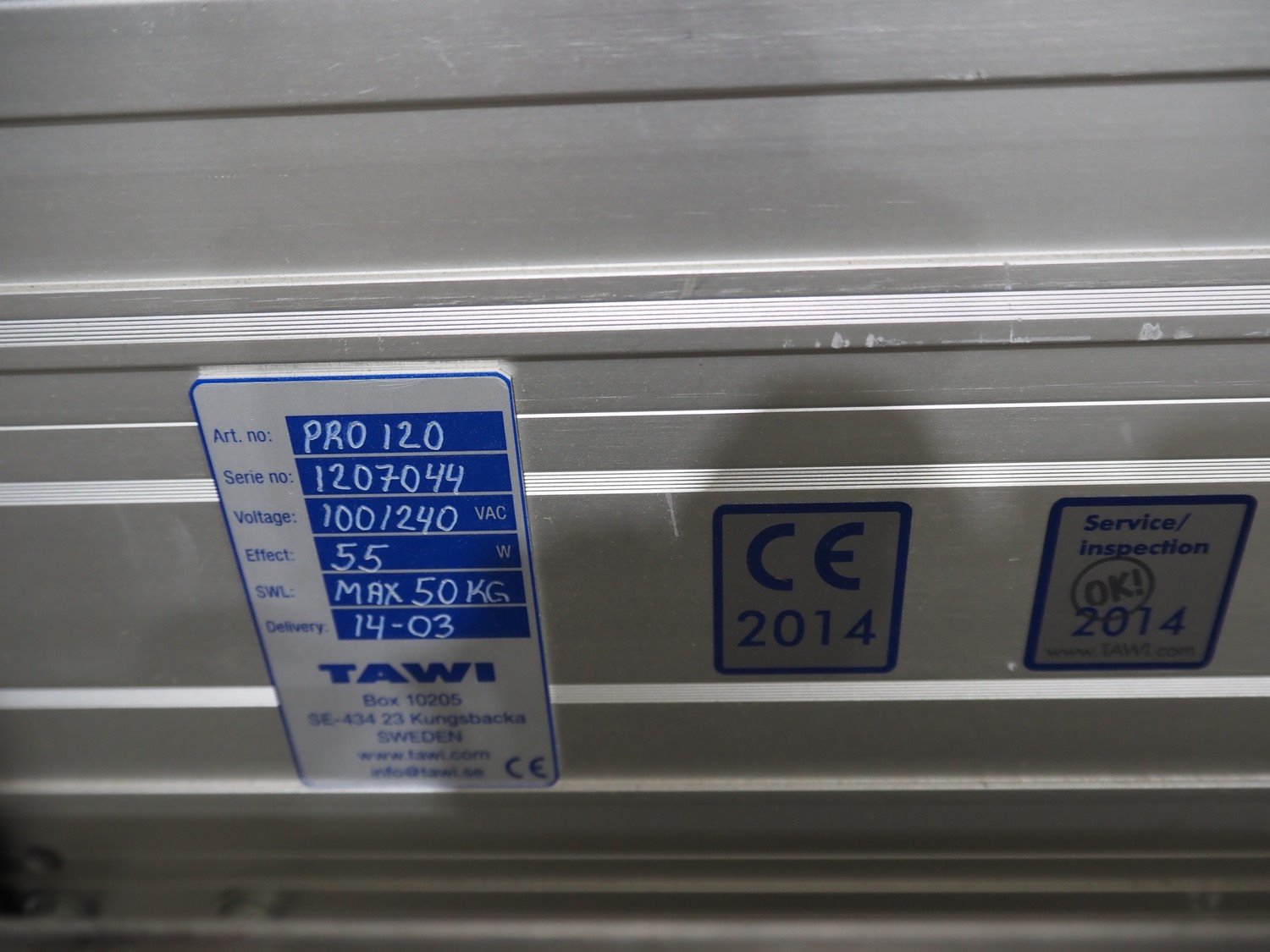 Tawi mobile lifter, model: PRO 120, serial number: 1207044, year of construction: 14-03, 100/240 V, 55 W, capacity: 50 kg, lifting height: 1980 mm, total dimensions: 1450 mm x 630 mm x 1990 mm. Kavel locatie: Langereijt 29A, 5091 JP Middelbeers, Nederland