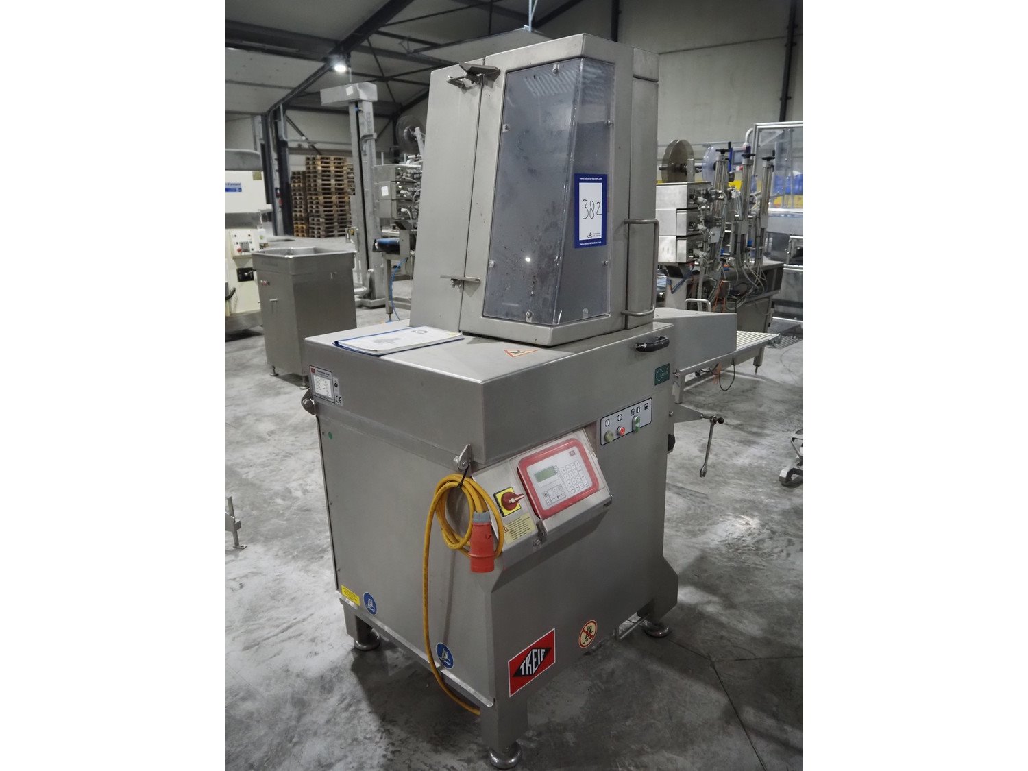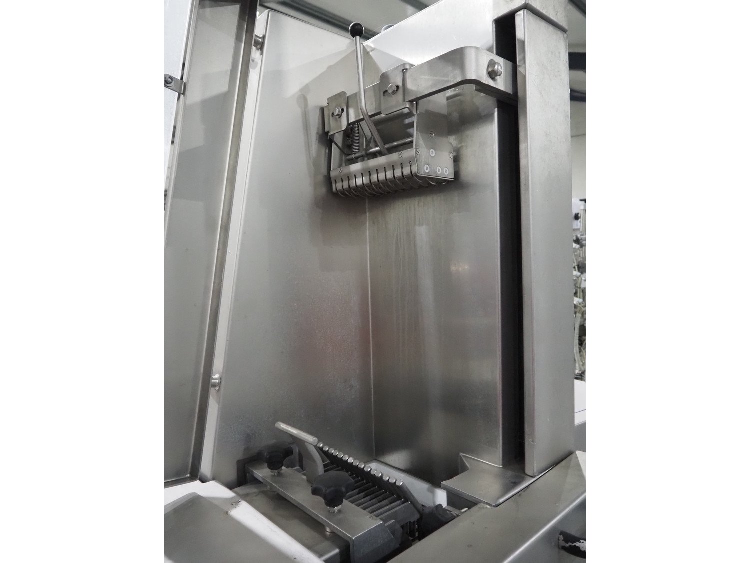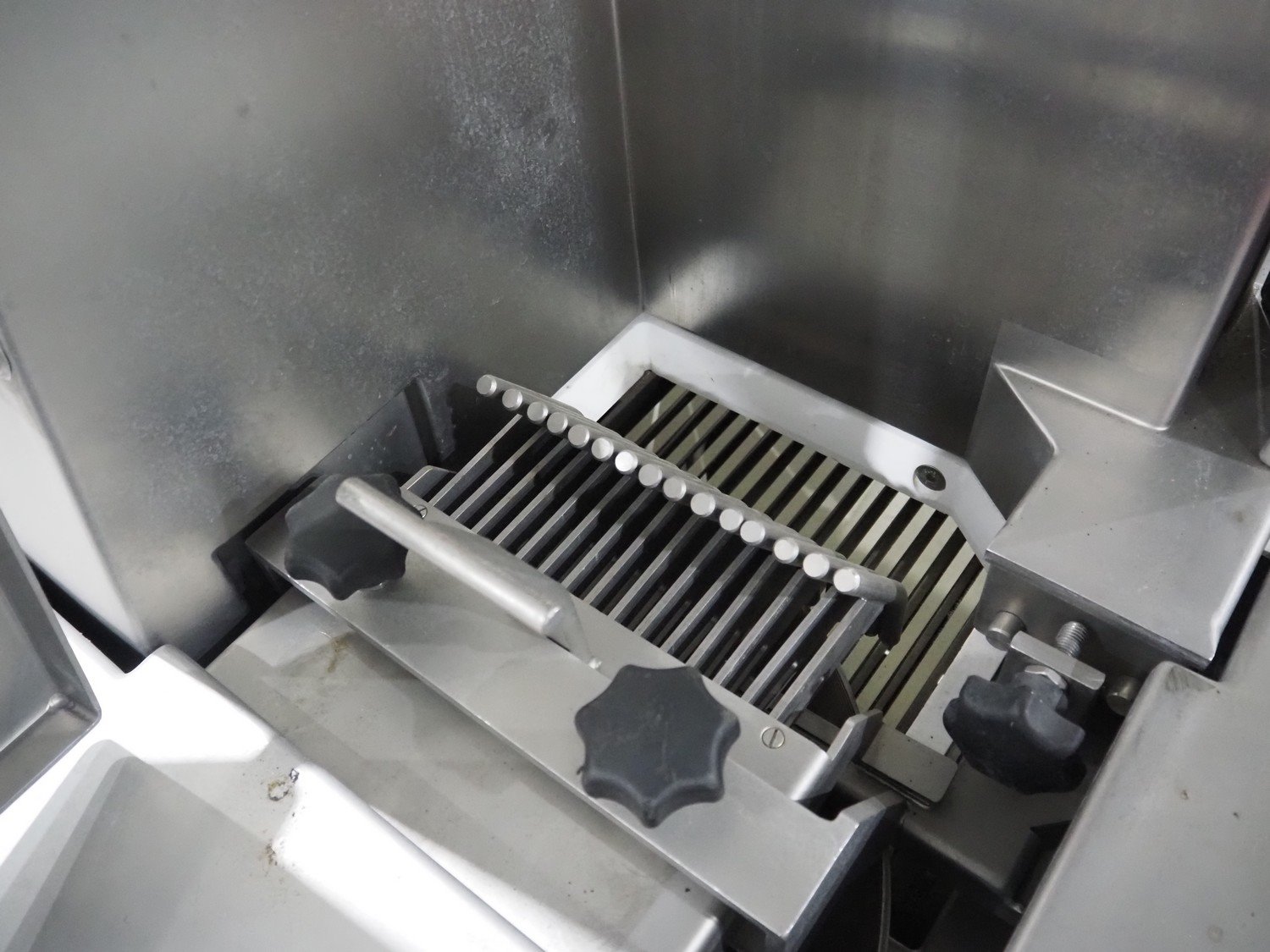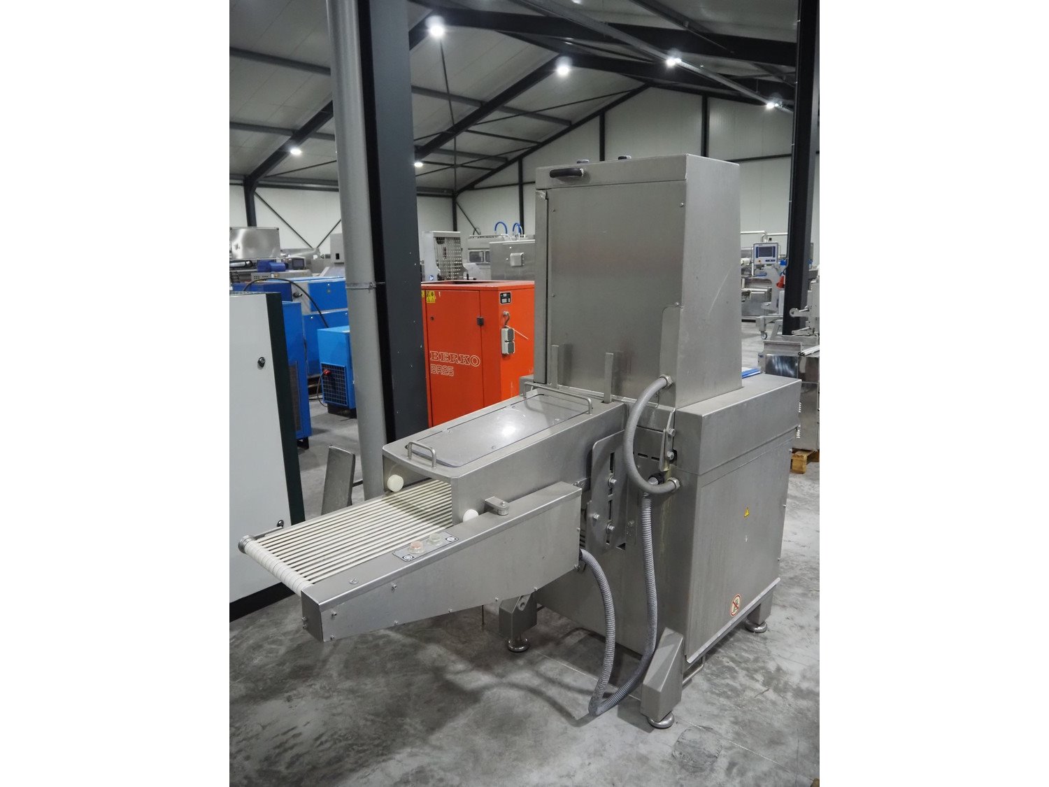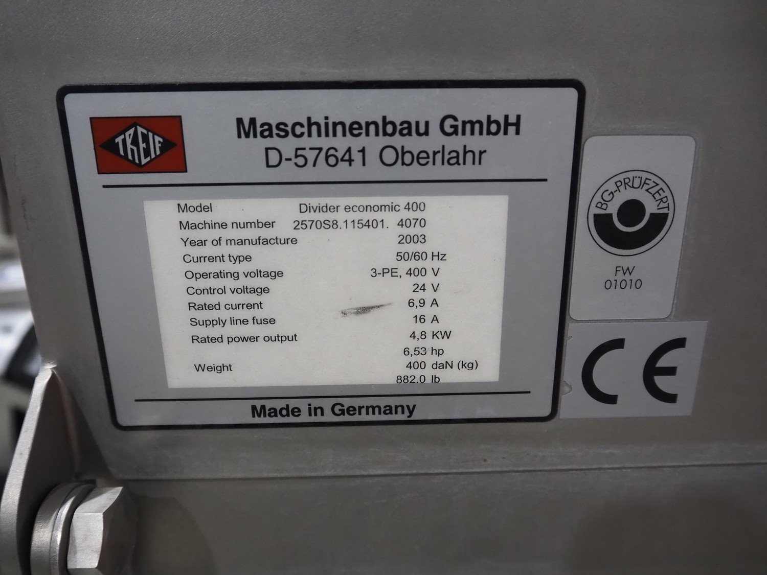 Treif Maschinenbau GmbH slicer, model: Divider economic 400, serial number: 2570S8.115401.4070, year of construction: 2003, 400 V, 3 Ph, 50/60 Hz, 6,9/16 A, 4,8 kW, weight: 400 Kg, clearance: 250 mm x 100 mm, plastic string outfeed belt, belt width: 310 mm, total dimensions: 2150 mm x 1950 mm x 1950 mm. Including trolley and knife holder, trolley dimensions: 750 mm x 550 mm x 850 mm. Kavel locatie: Langereijt 29A, 5091 JP Middelbeers, Nederland