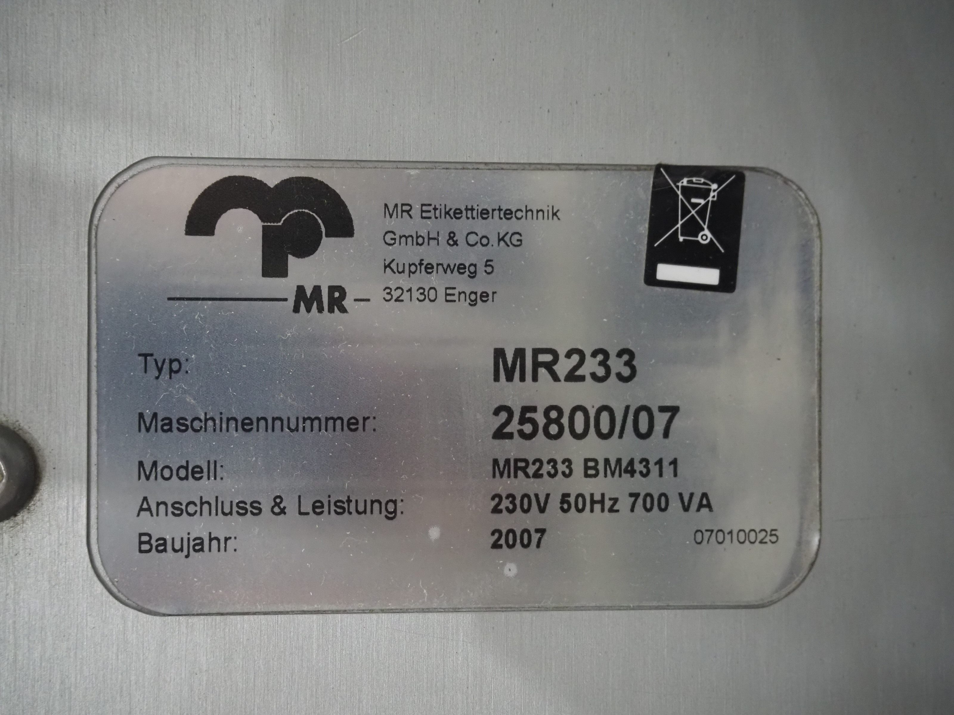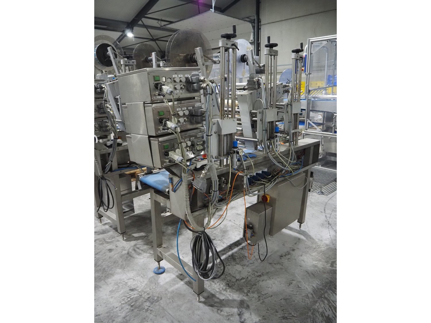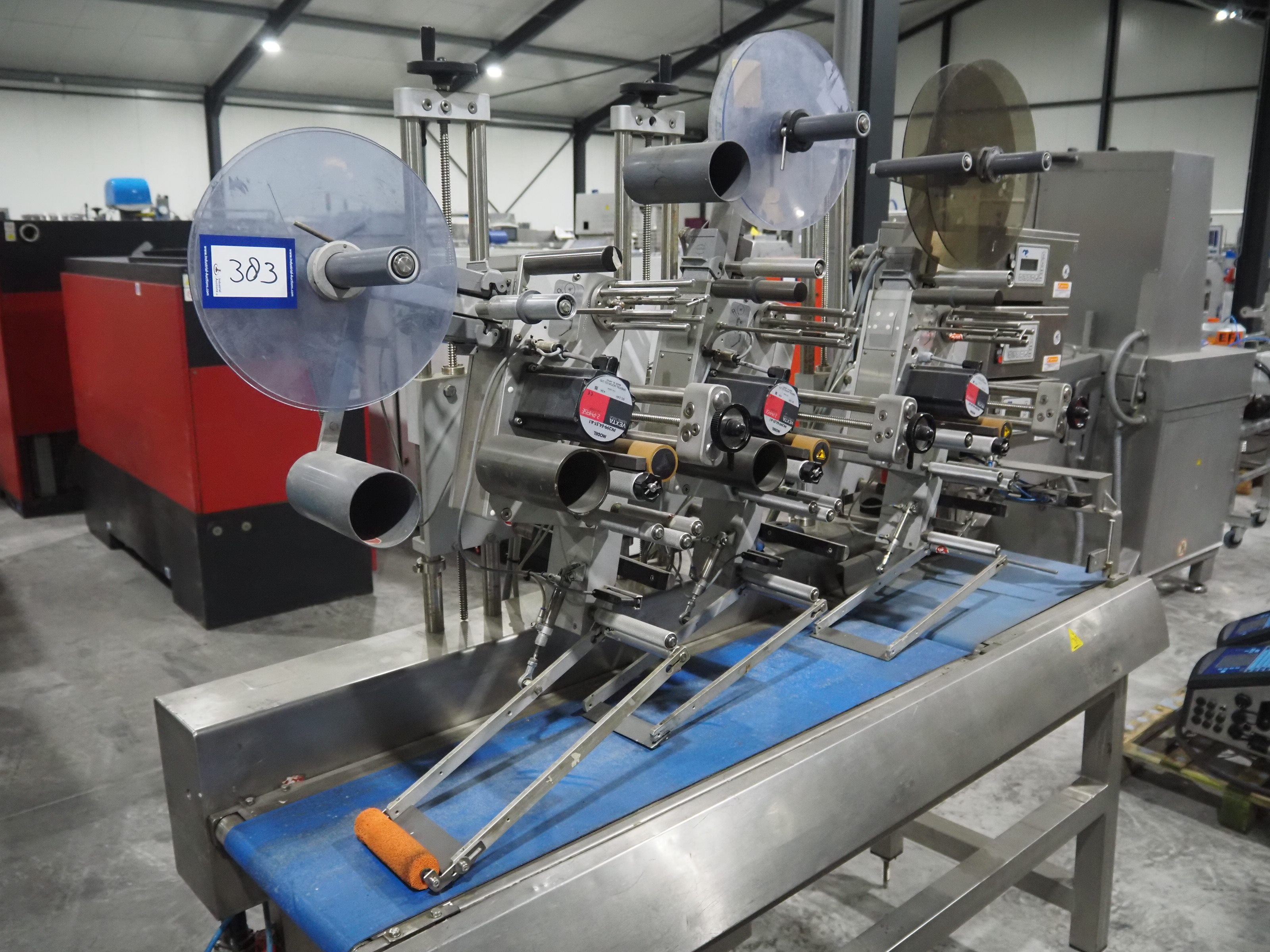 Espera labelling machine with 3 MR Etikettiertechnik labellers, Espera model: ES 7000, labeller type: (3x) MR233, year of construction: 2007, 230 V, 50 Hz, maximum label width: 150 mm, plastic belts, belt width: 350 mm, total dimensions: 2050 mm x 750 mm x 1950 mm. Kavel locatie: Langereijt 29A, 5091 JP Middelbeers, Nederland