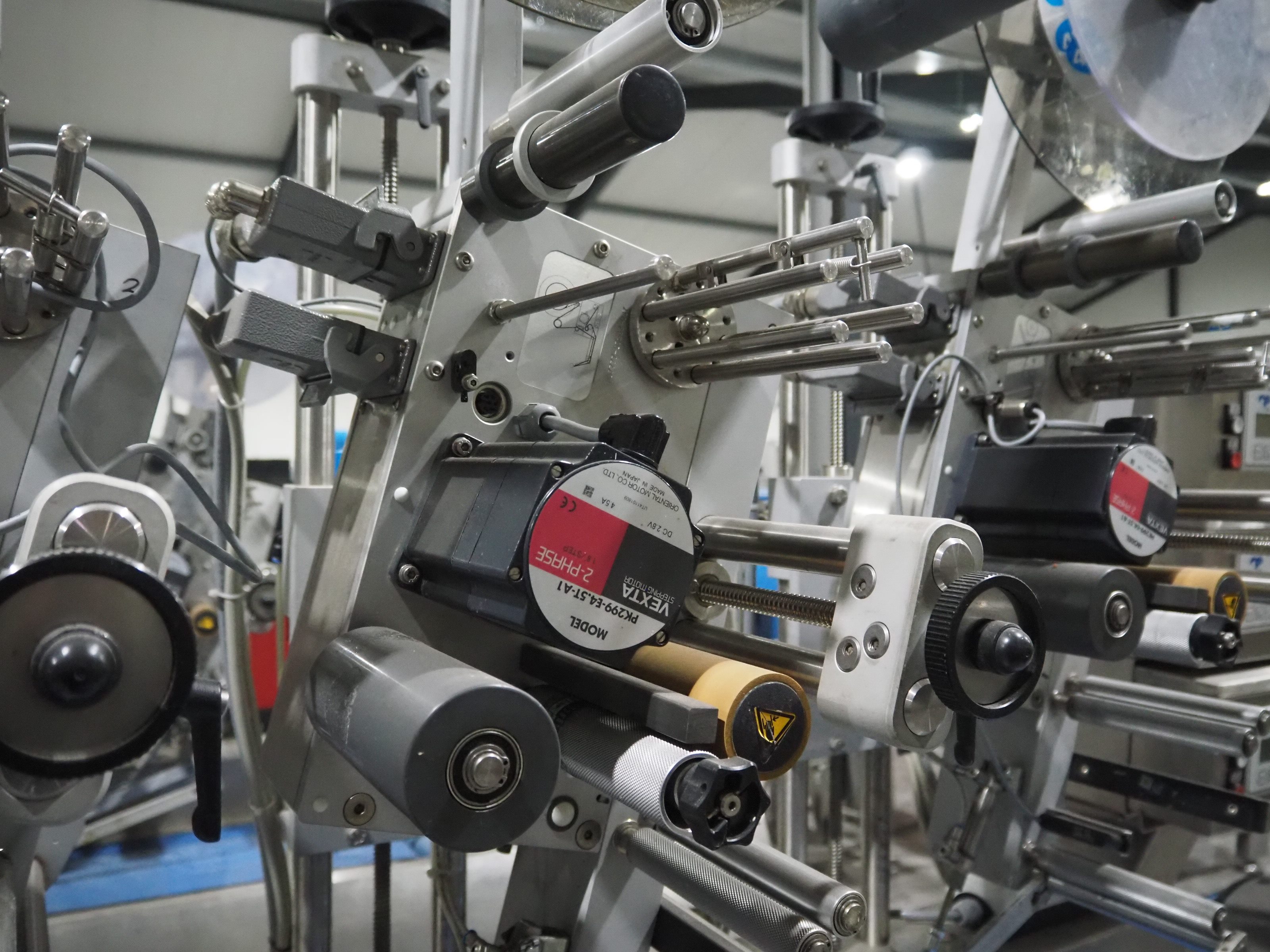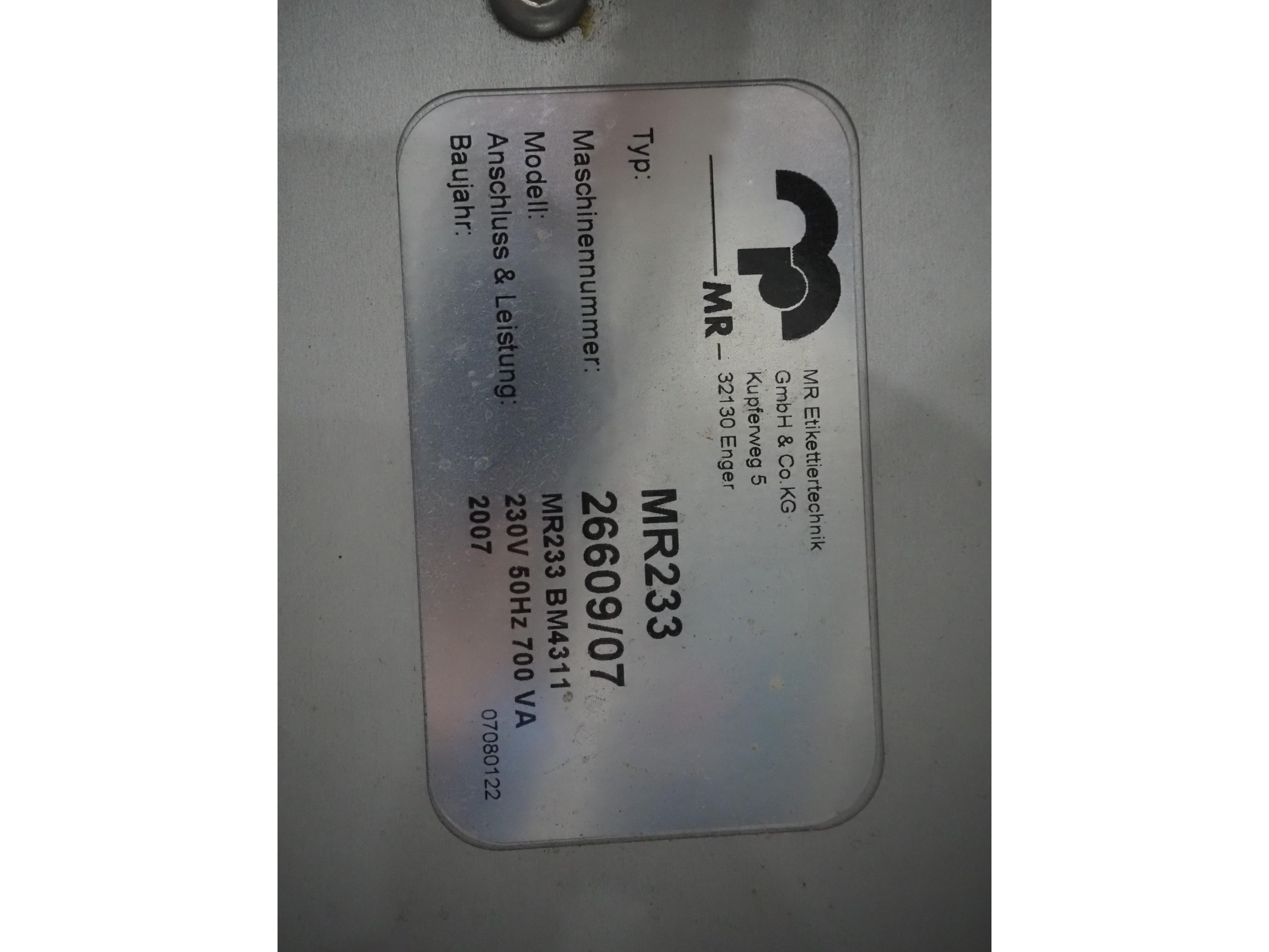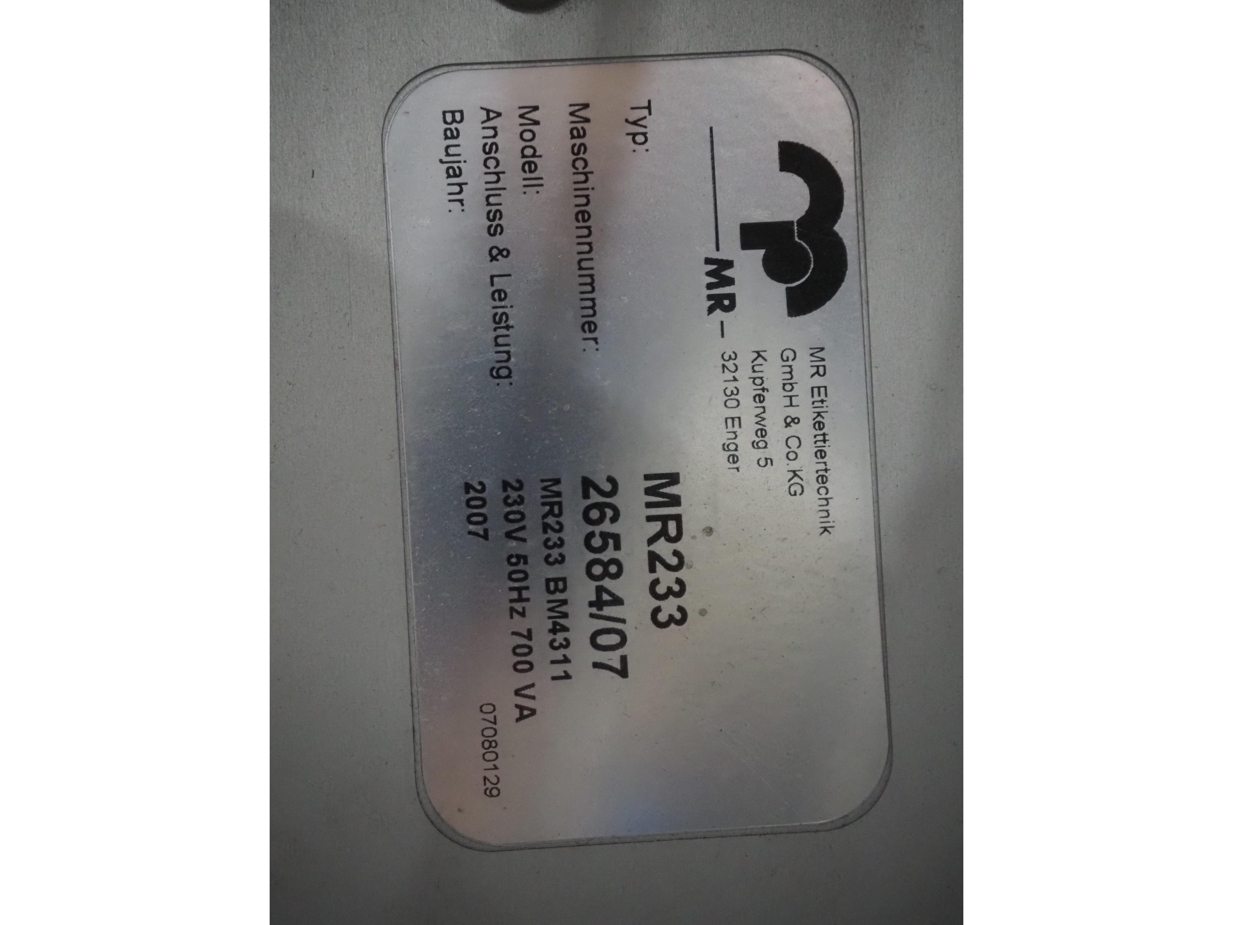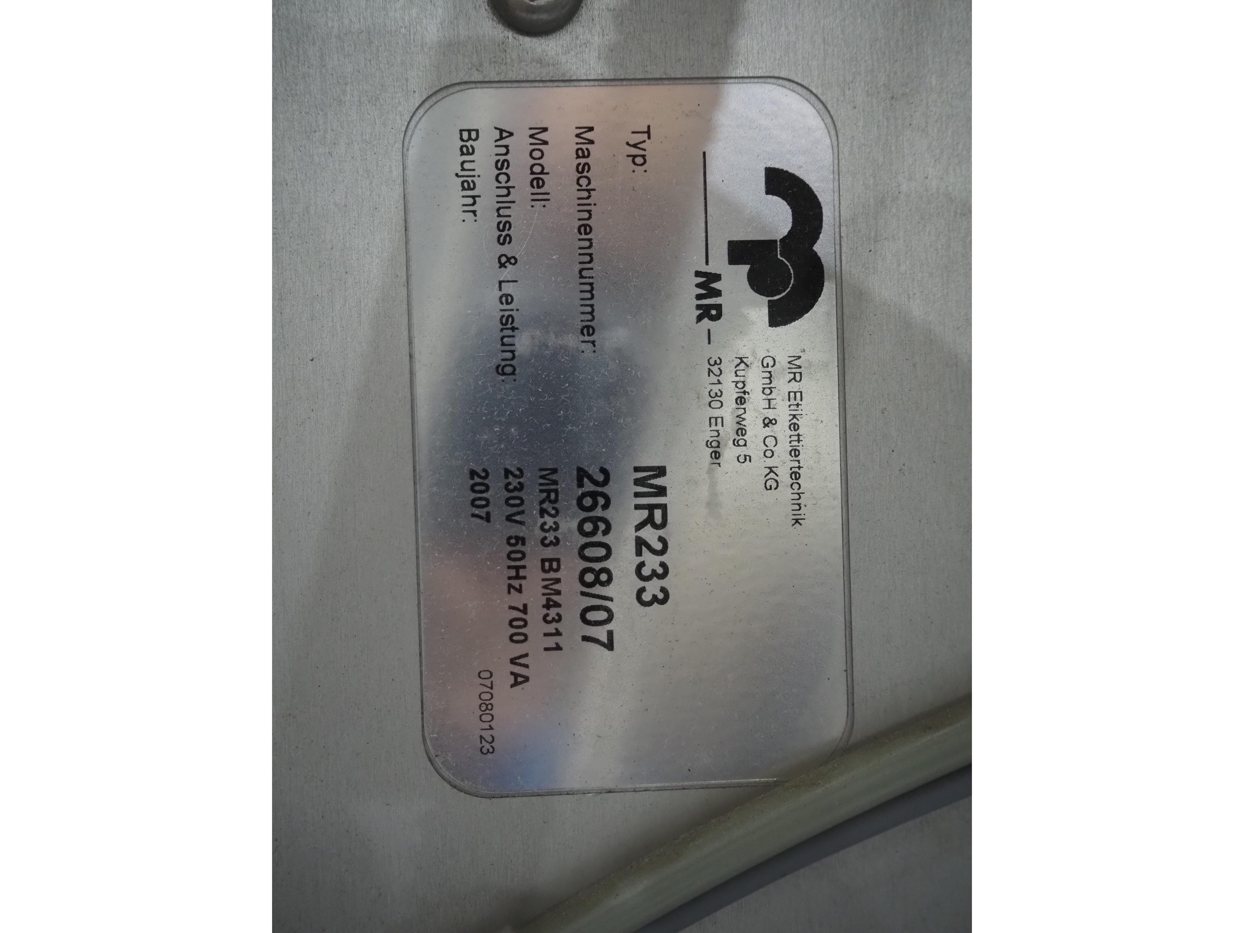 Espera labelling machine with 3 MR Etikettiertechnik labellers, Espera model: ES 7000, labeller type: (3x) MR233, year of construction: 2007, 230 V, 50 Hz, maximum label width: 150 mm, plastic belts, belt width: 350 mm, total dimensions: 2050 mm x 750 mm x 2150 mm. Kavel locatie: Langereijt 29A, 5091 JP Middelbeers, Nederland