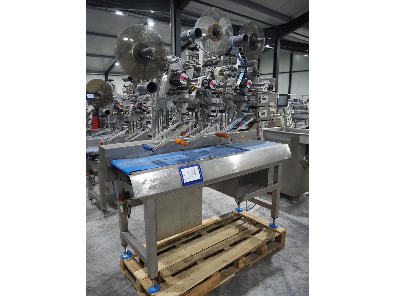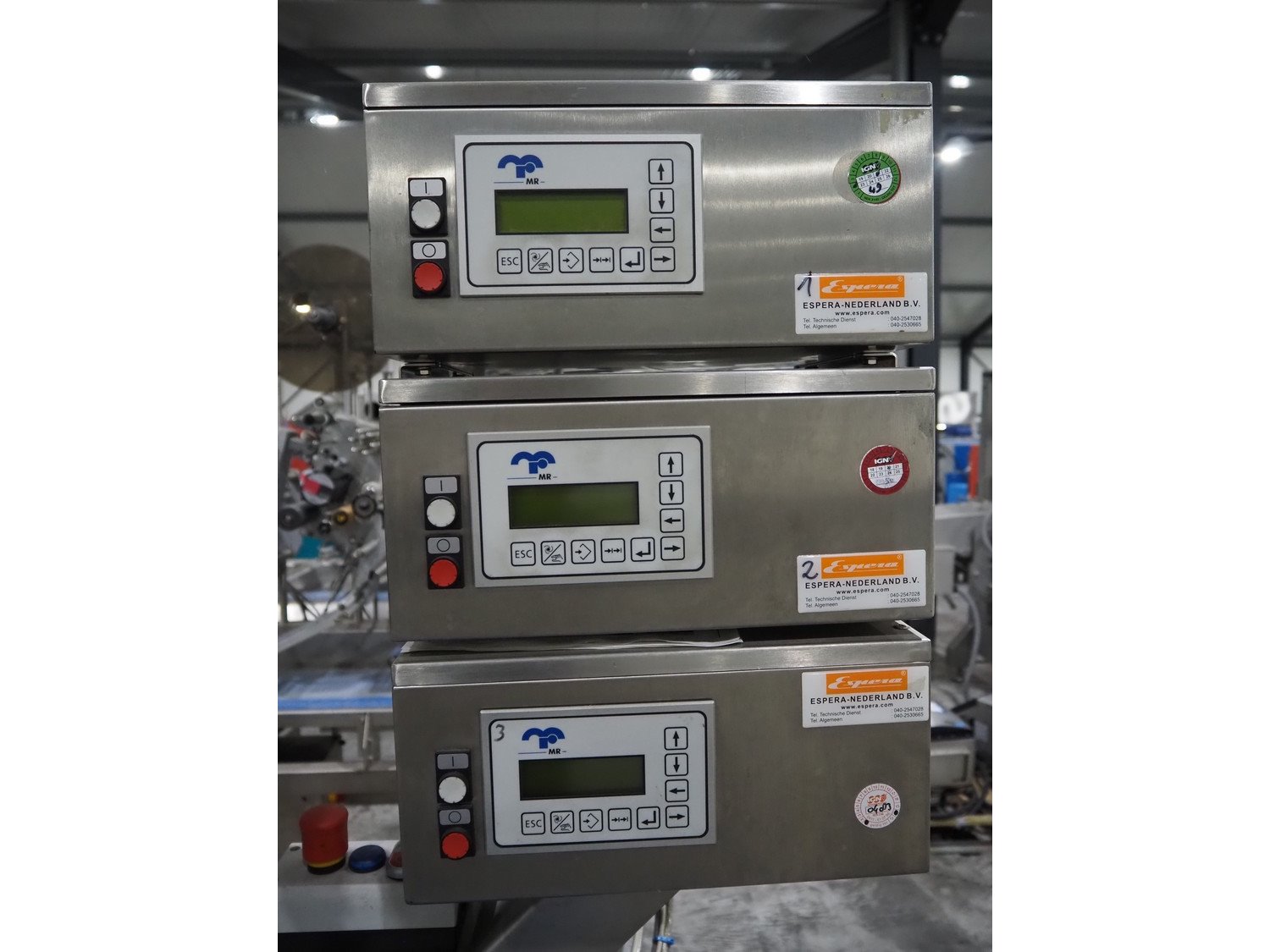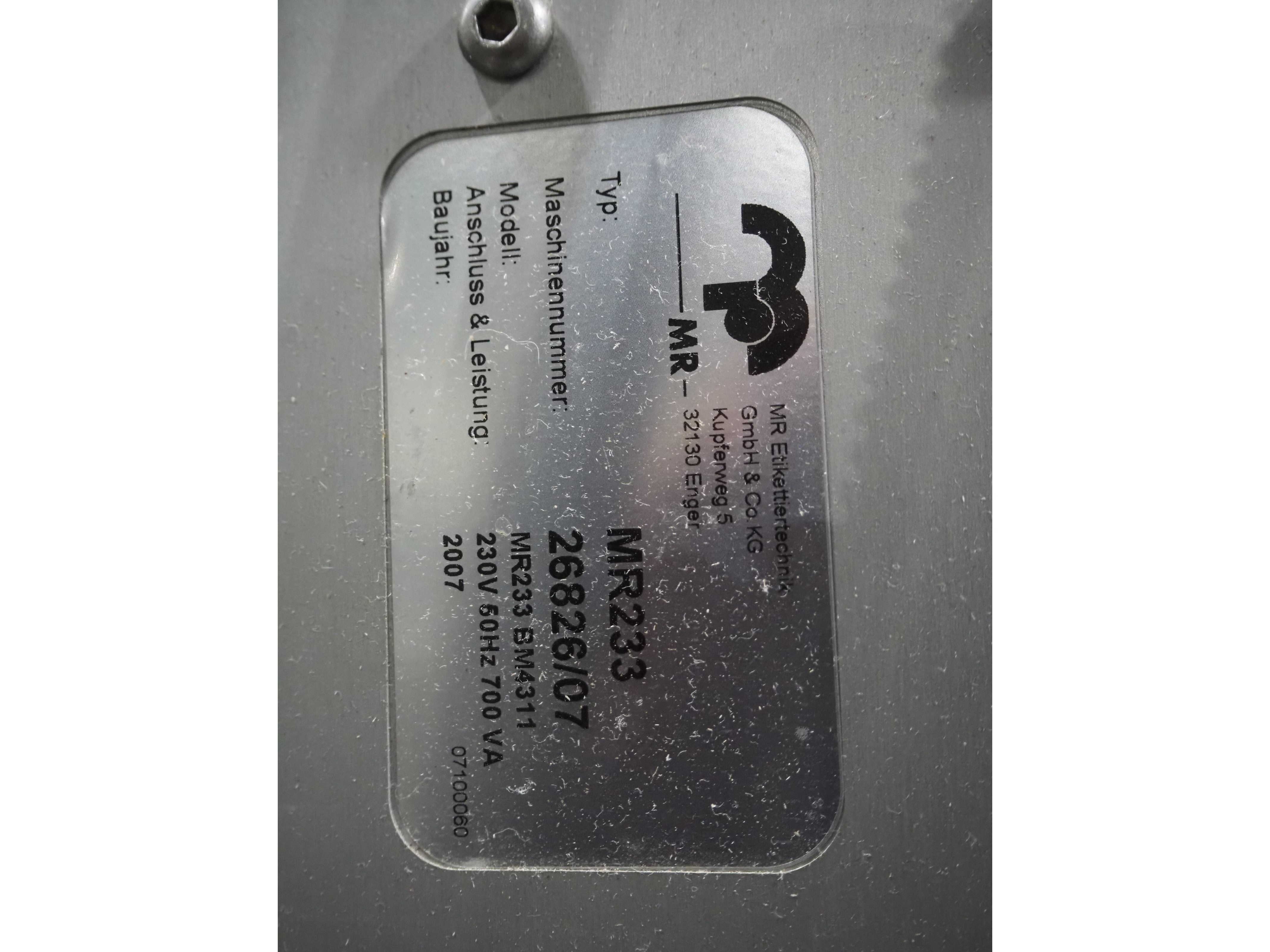 Espera labelling machine with 3 MR Etikettiertechnik labellers, Espera model: ES 7000, labeller type: (3x) MR233, year of construction: 2007, 230 V, 50 Hz, maximum label width: 150 mm, plastic belts, belt width: 350 mm, total dimensions: 2000 mm x 750 mm x 2200 mm. Kavel locatie: Langereijt 29A, 5091 JP Middelbeers, Nederland