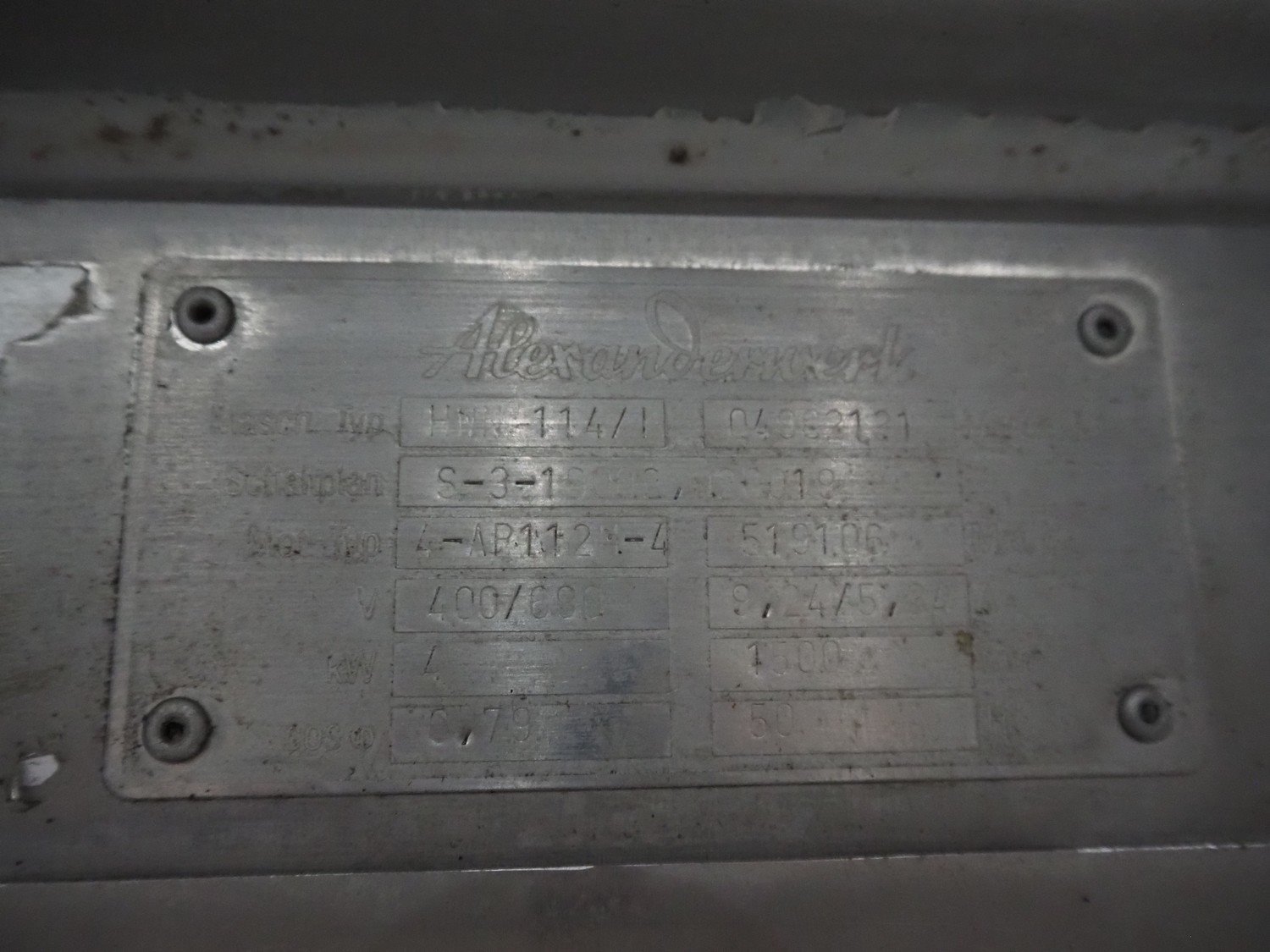 Alexanderwerk grinder, type: HWN 114/1, machine number: 04902131, 400/690 V, 50 Hz, 9.24/5.34 A, 4 kW, plate diameter: 114 mm, total dimensions: 1100 mm x 650 mm x 1130 mm. Kavel locatie: Langereijt 29A, 5091 JP Middelbeers, Nederland