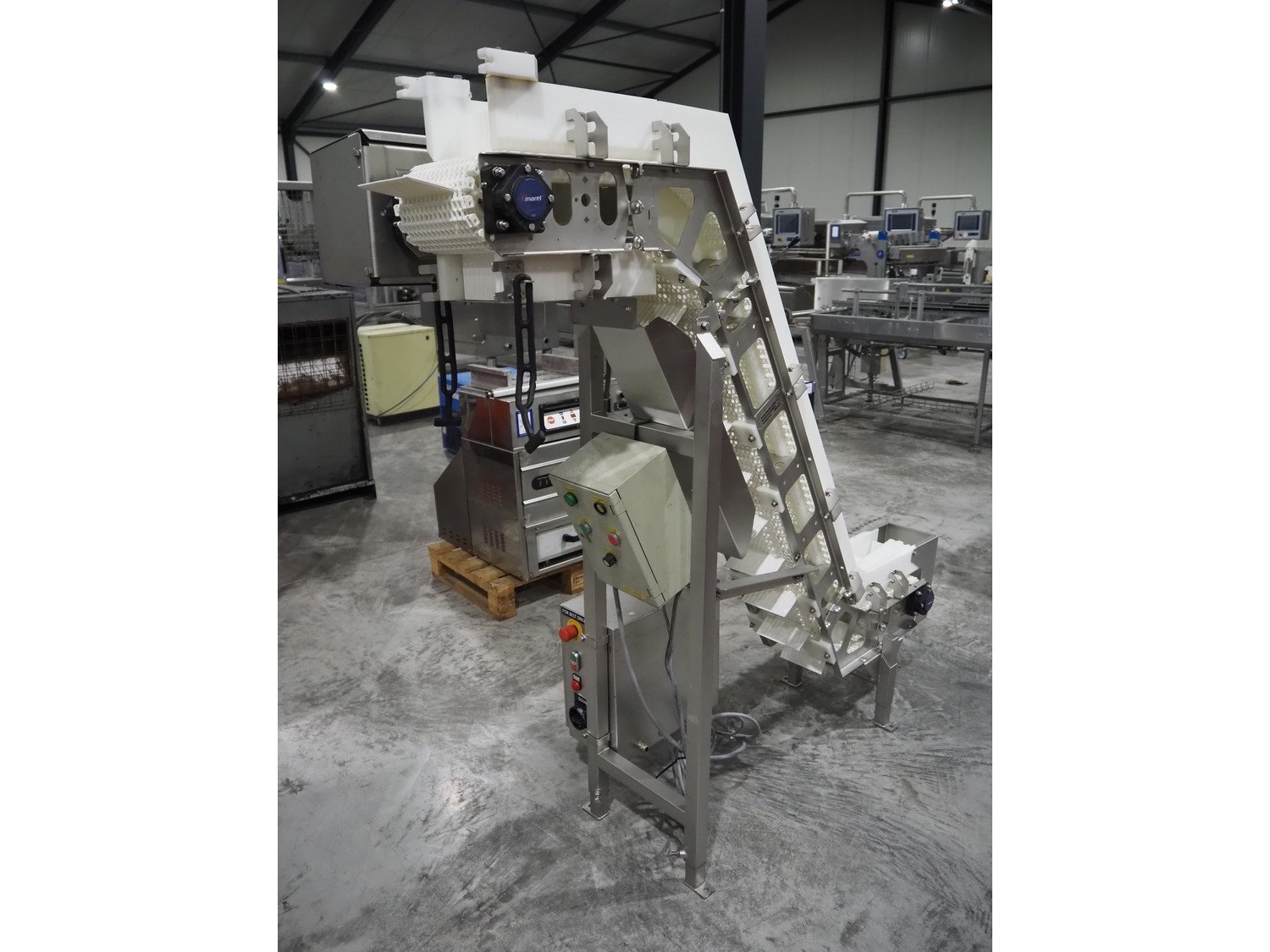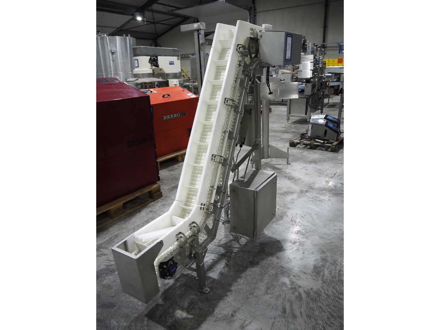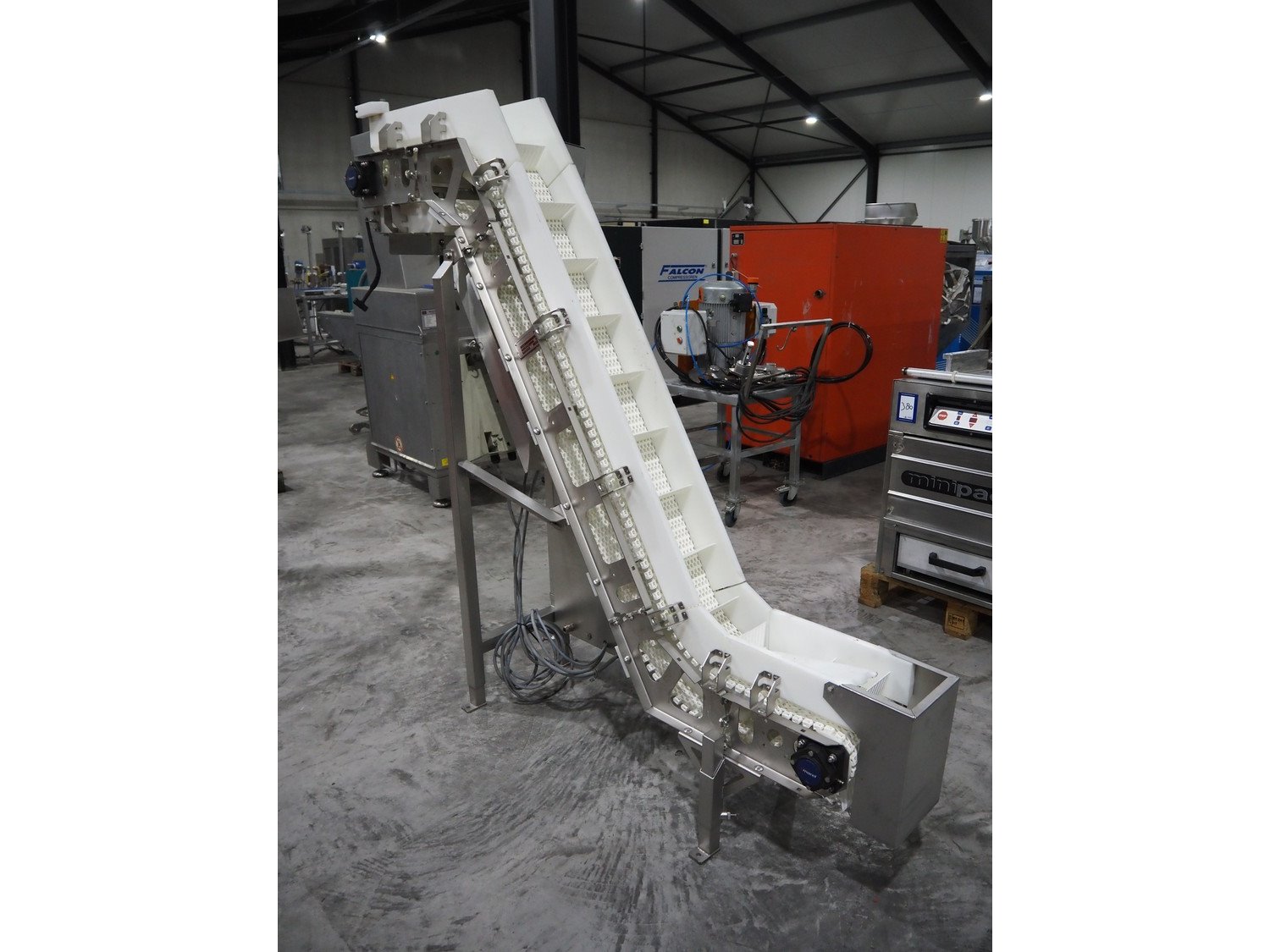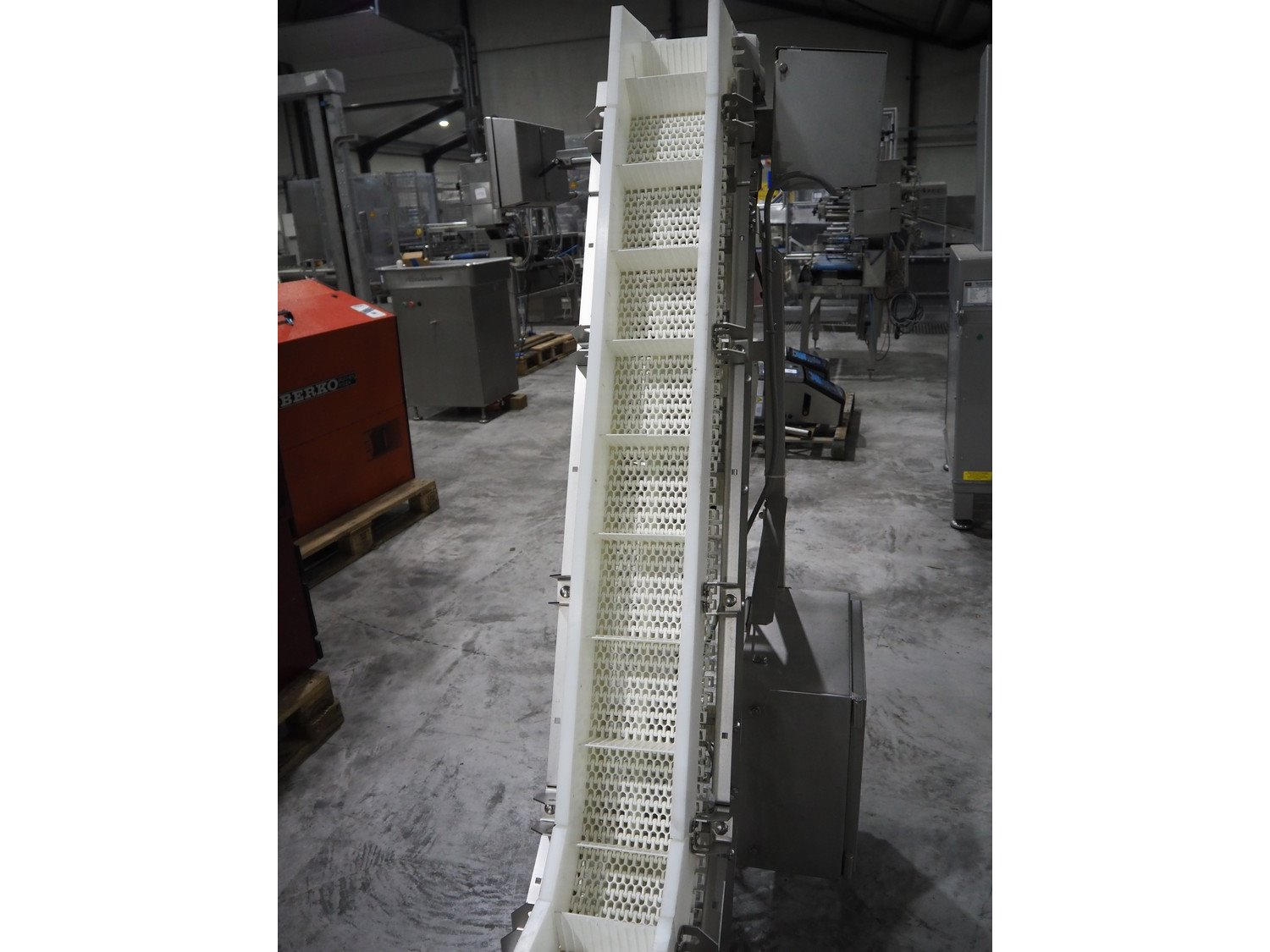 Marel elevating belt, plastic mesh belt, belt width: 200 mm, working width: 145 mm, distance between divider: 155 mm, divider height: 75 mm, elevating height: 1600 mm, total dimensions: 1850 mm x 600 mm x 1750 mm. Kavel locatie: Langereijt 29A, 5091 JP Middelbeers, Nederland
