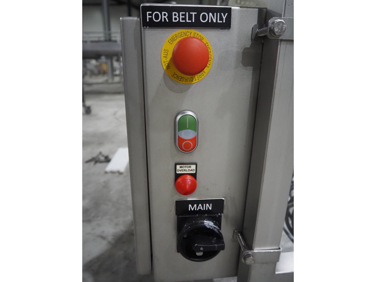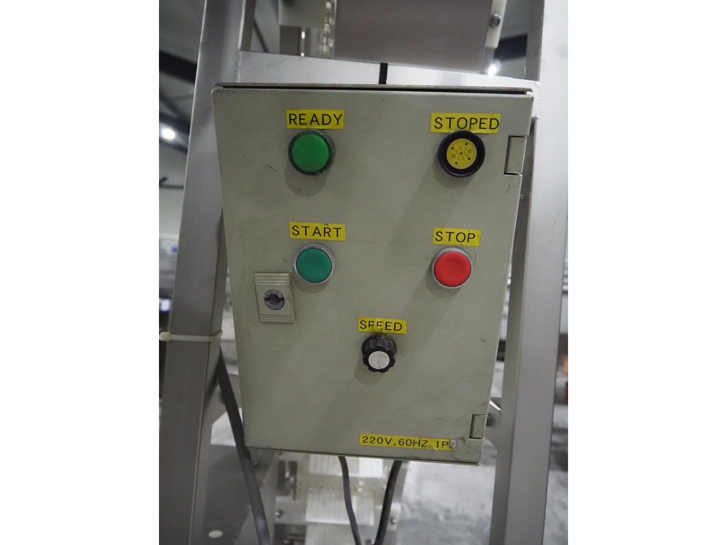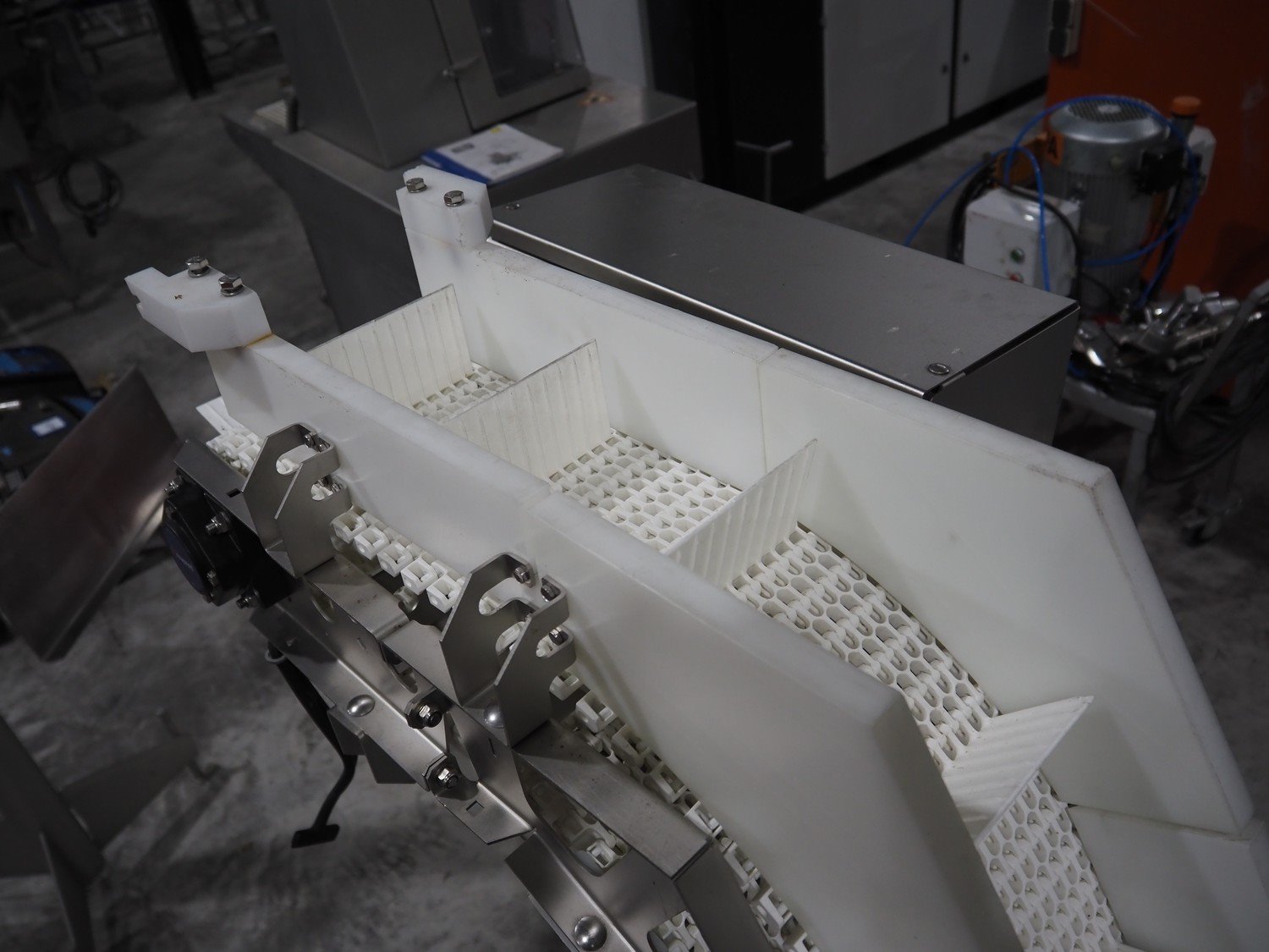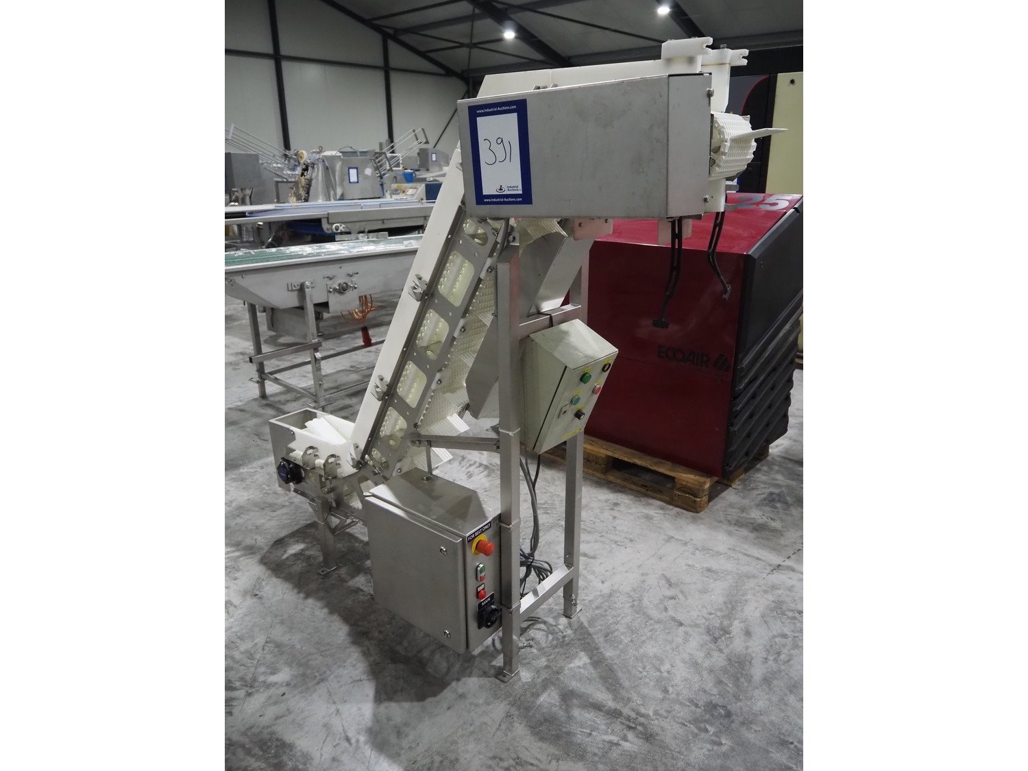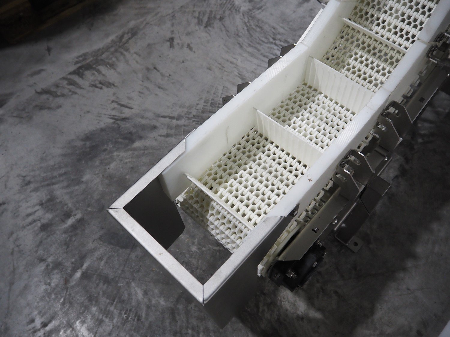 Marel elevating belt, plastic mesh belt, belt width: 200 mm, working width: 145 mm, distance between divider: 155 mm, divider height: 75 mm, elevating height: 1600 mm, total dimensions: 1850 mm x 600 mm x 1750 mm. Kavel locatie: Langereijt 29A, 5091 JP Middelbeers, Nederland