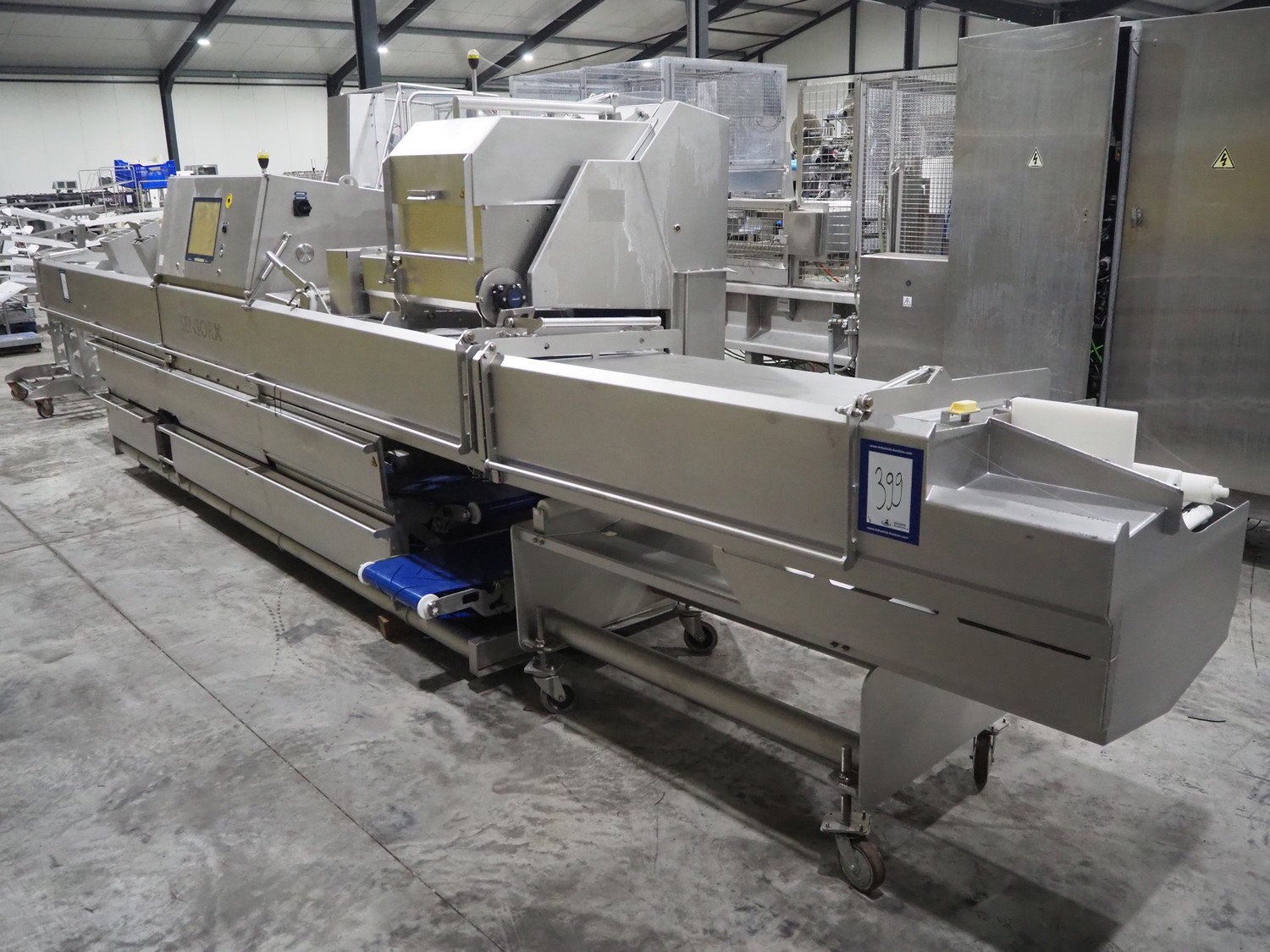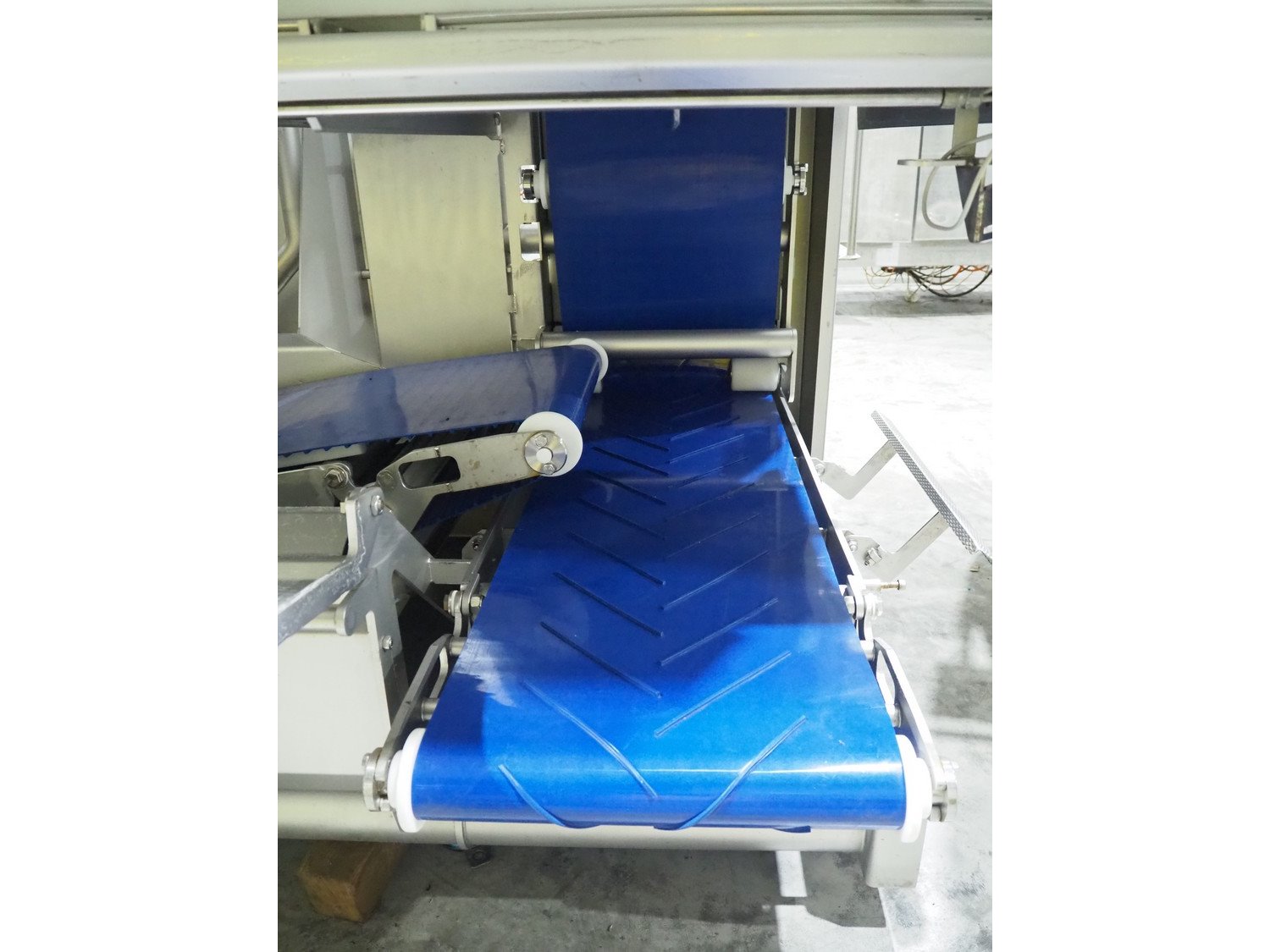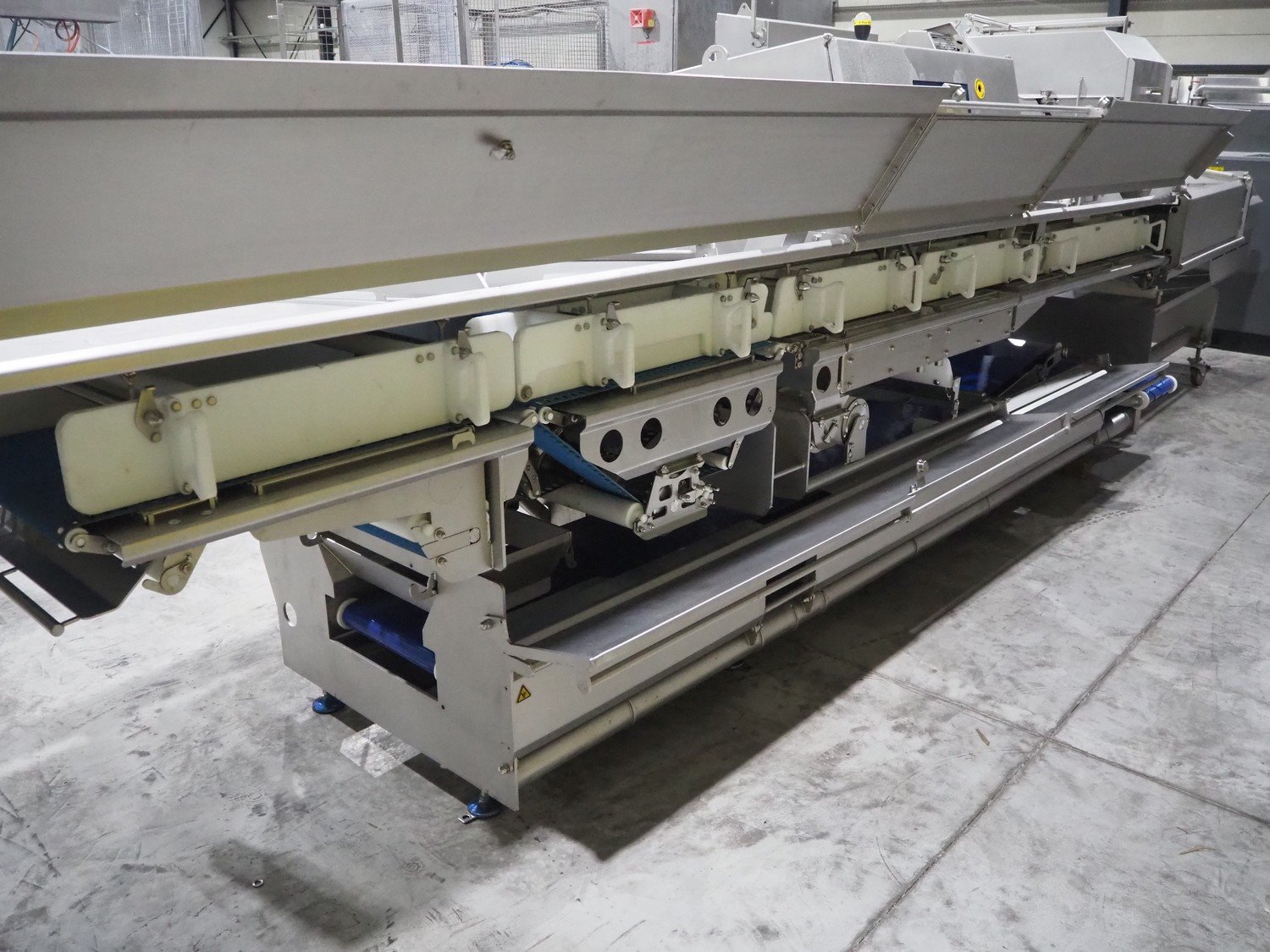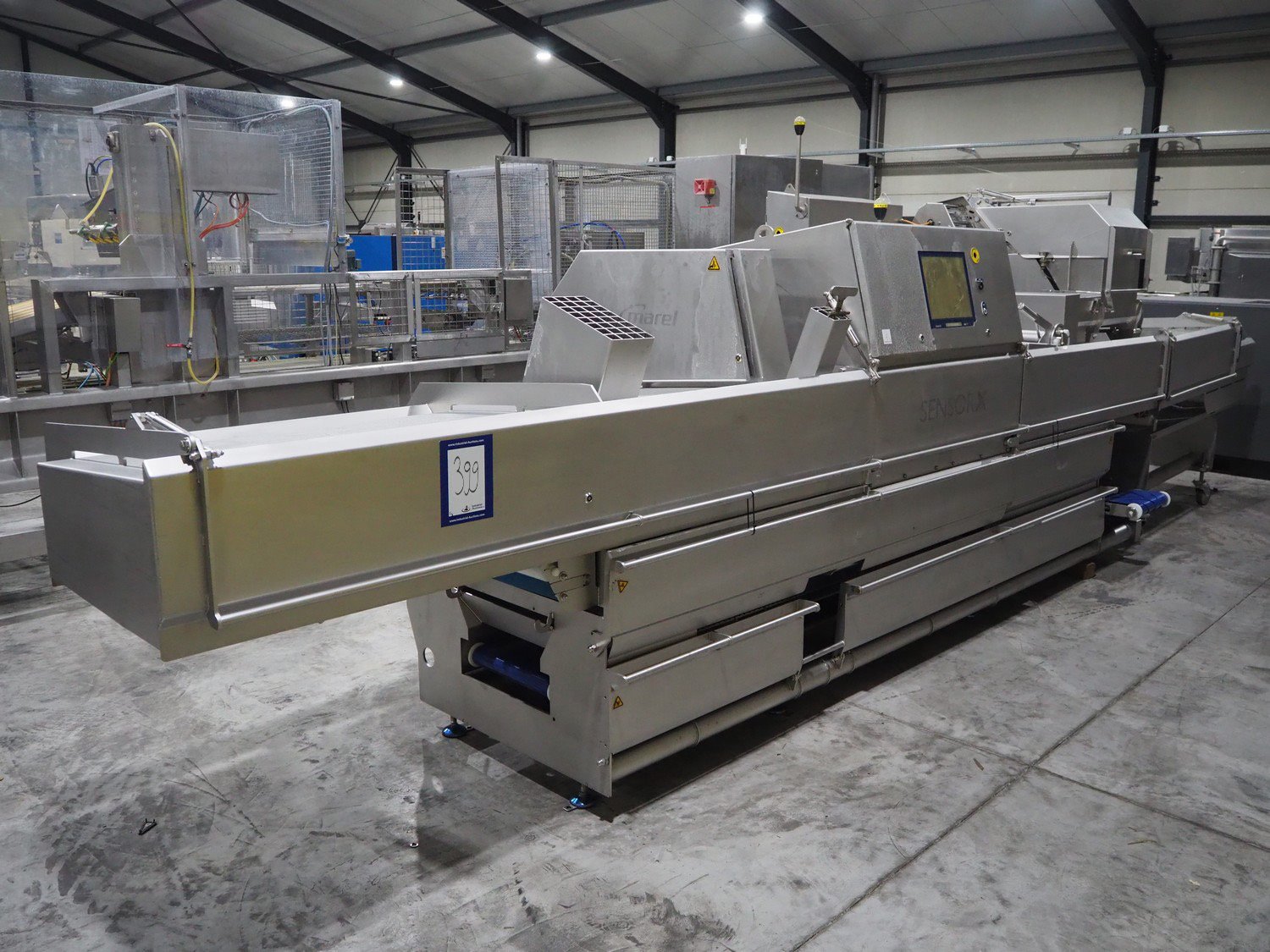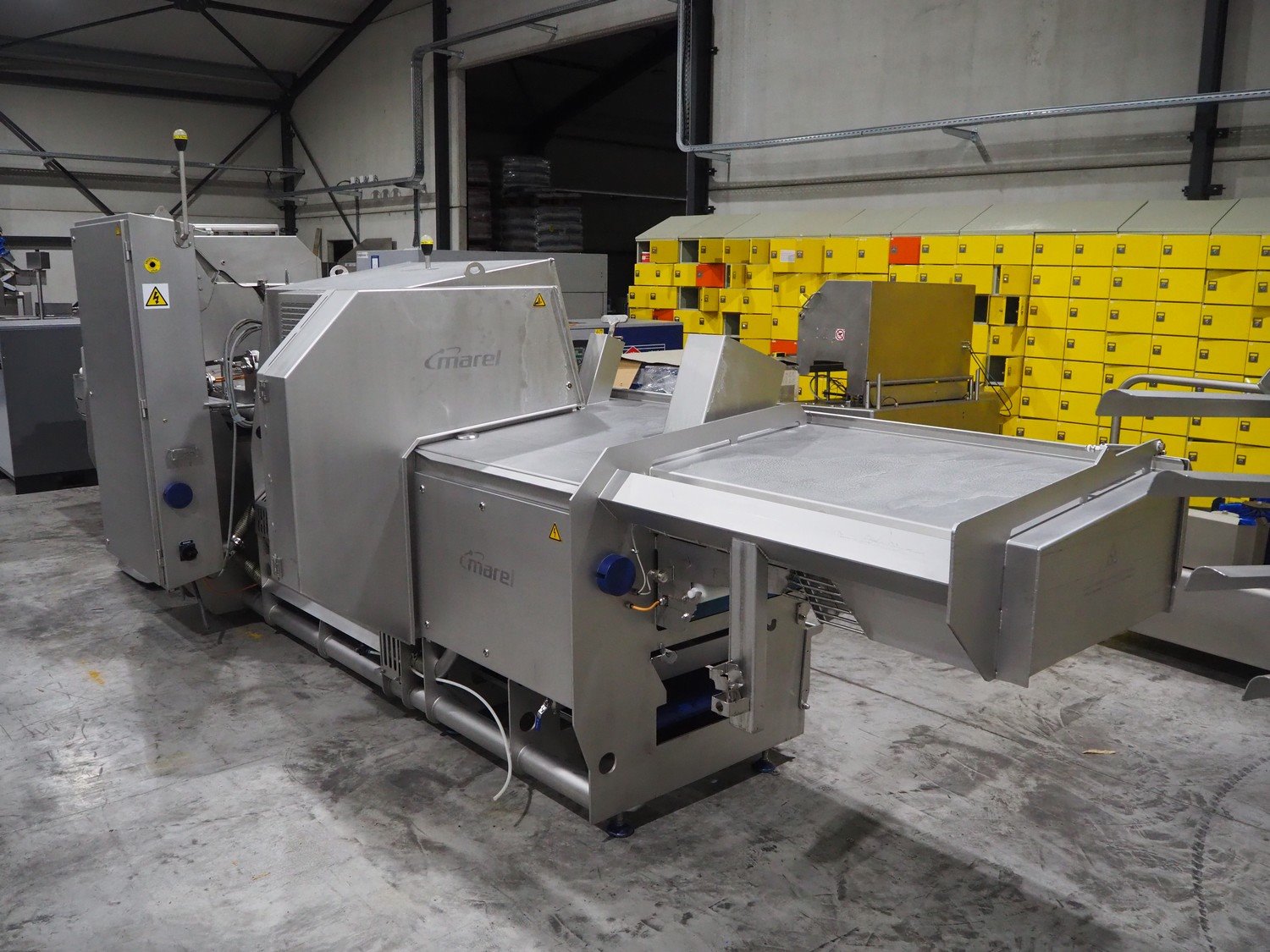 Marel trim inspection and portioning system, model: 850-9000-0011, type: 0012-102-00013, serial number: A143817, year of construction: 2016, plastic infeed belt, belt width: 590 mm, plastic belt, belt width: (2x) 380 mm, plastic mesh belt, belt width: 260 mm and 200 mm, total dimensions: 5150 mm x 1550 mm x 2160 mm. Including outfeed belt, dimensions: 1840 mm x 900 mm x 1180 mm, and 2x trolley for parts, dimensions: 2000 mm x 1150 mm x 1550 mm and 1650 mm x 1450 mm x 980 mm. Kavel locatie: Langereijt 29A, 5091 JP Middelbeers, Nederland